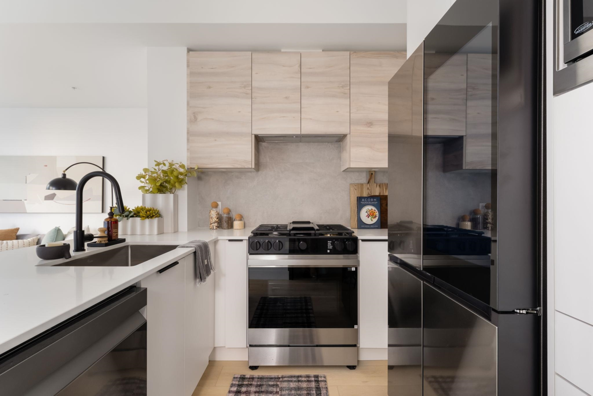 Beautifully designed Jr 2 bedroom, 2 bathroom ground-level home offers modern living with exceptional convenience. Featuring a bright, open layout with large windows and 9' ceilings, the space feels airy and inviting. The contemporary kitchen includes quartz countertops, stainless steel appliances, soft-close cabinetry, and an oversized island,perfect for everyday living and entertaining. Enjoy seamless indoor–outdoor living with your private ground-level patio, ideal for morning coffee, pets, or hosting. Located just steps from Highstreet Mall, transit, and Highway 1 access, everything you need is right at your doorstep. Close to all levels of schools, including the University of the Fraser Valley, and minutes from the Abbotsford International Airport - Highstreet Village has it all.