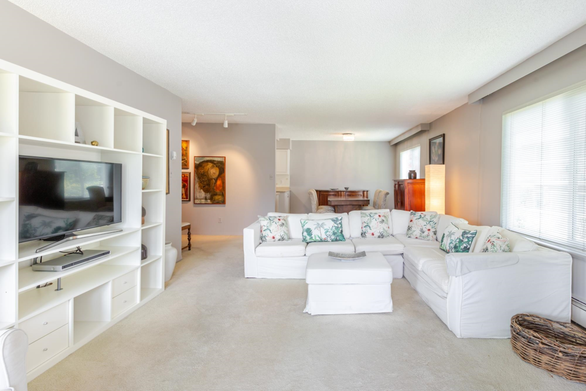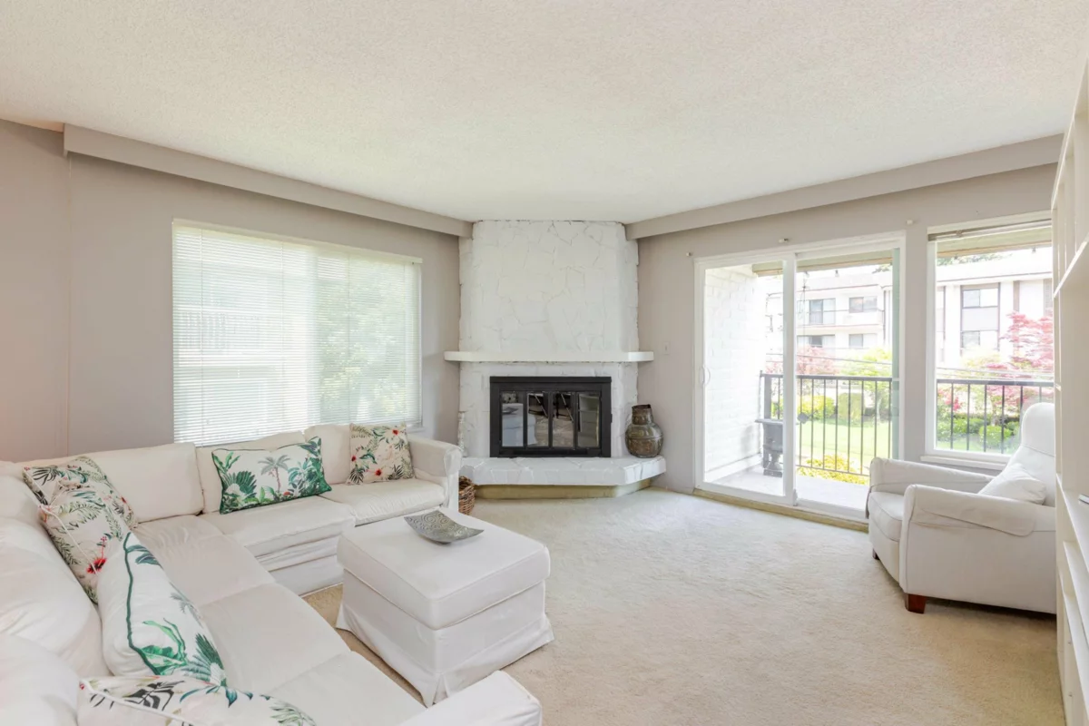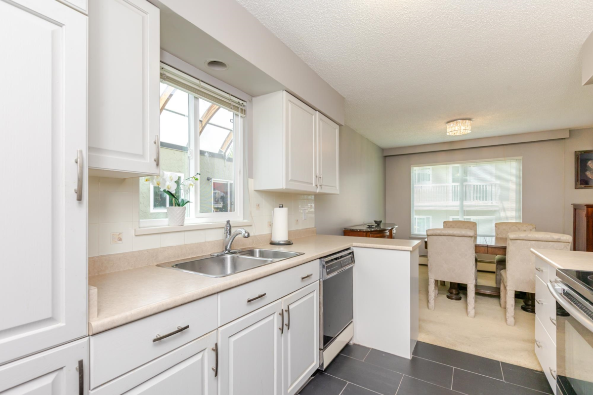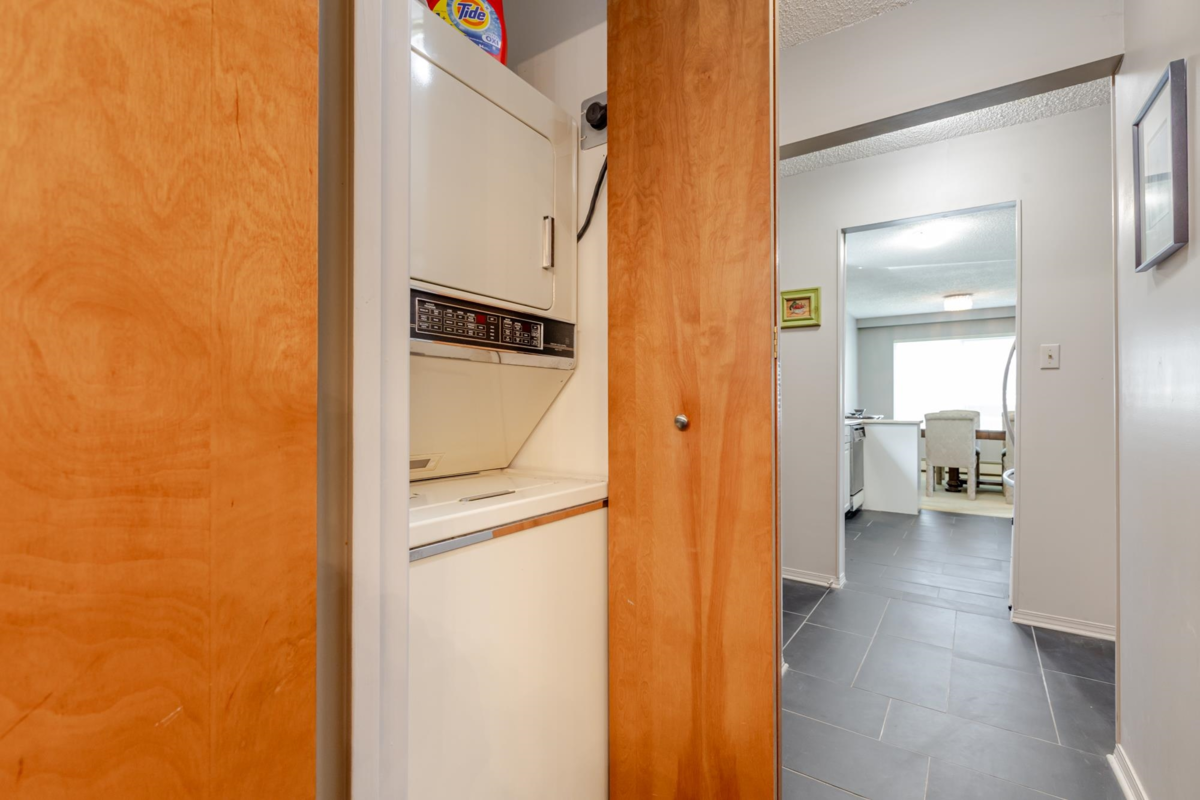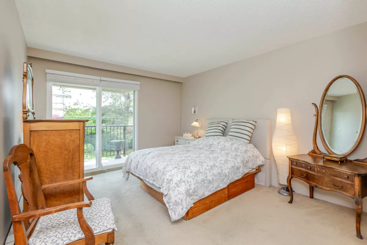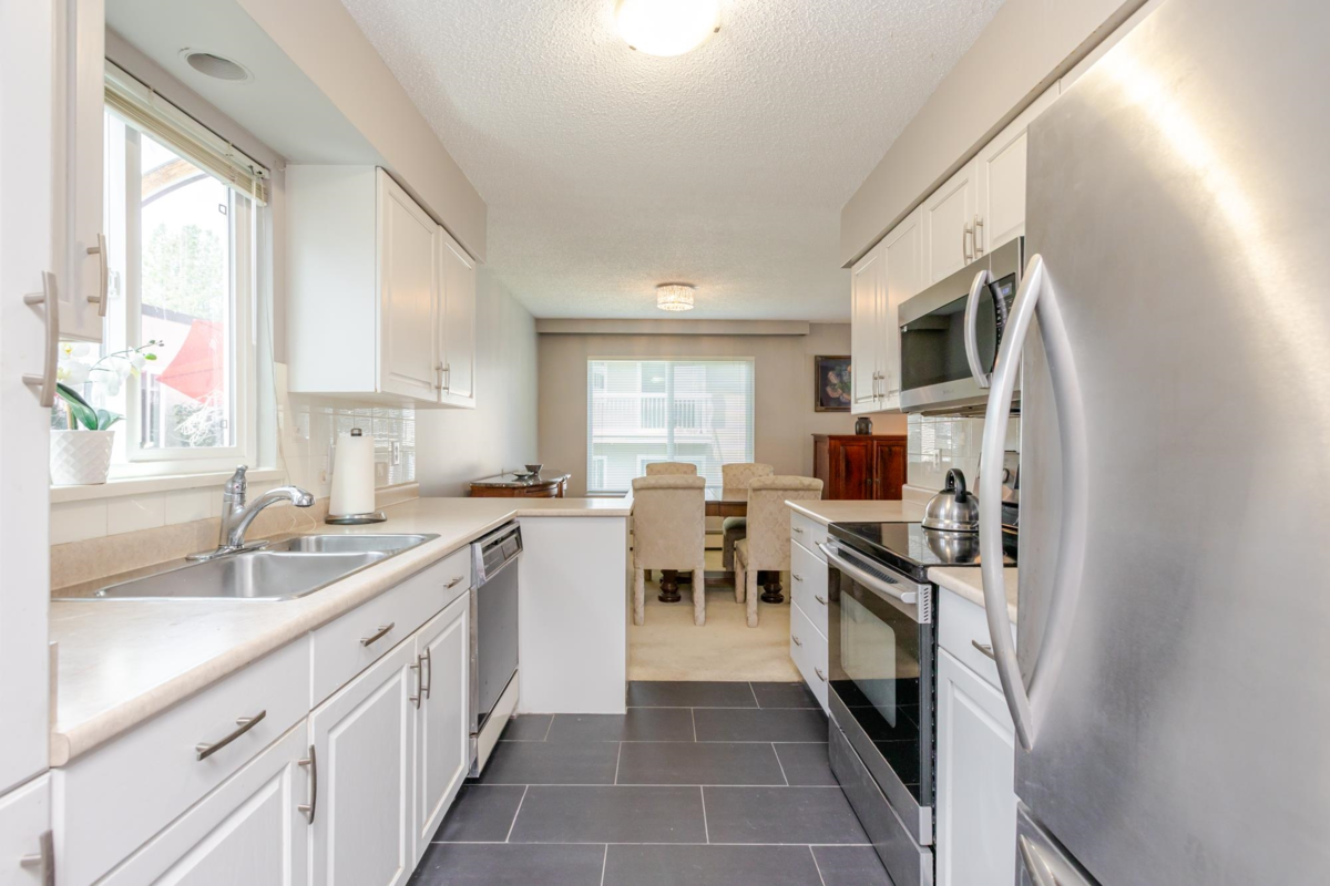 The DOGWOOD. Estate Sale in this sought-after 55+ community in the heart of White Rock. Bright, sunny, top-floor end unit boasts a 28 foot long balcony perfect for sipping coffee and watching the sun rise. This large 1117 sq ft 2 bed/1.5-bathroom suite offers ample natural light and plenty of space to relax. It accommodates house size furniture making it great for downsizing. With in suite laundry, one parking stall and one storage locker included, you'll have everything you need. Bring your decorating ideas and enjoy the best of White Rock living with its beautiful beaches, shops, and restaurants just a short walk away. Plus, with easy access to downtown Vancouver, you can enjoy the best of both worlds. Strata fees cover heat and hot water. Pets allowed. Motivated Seller!