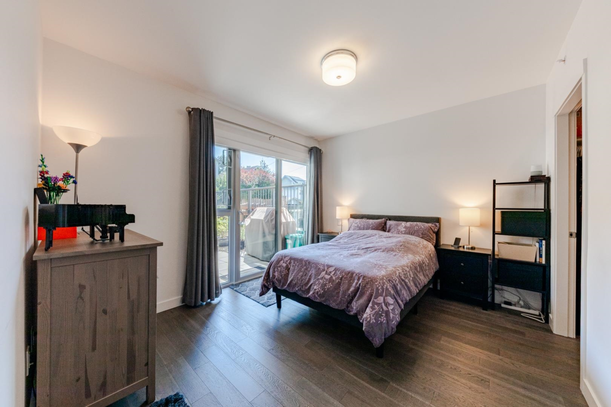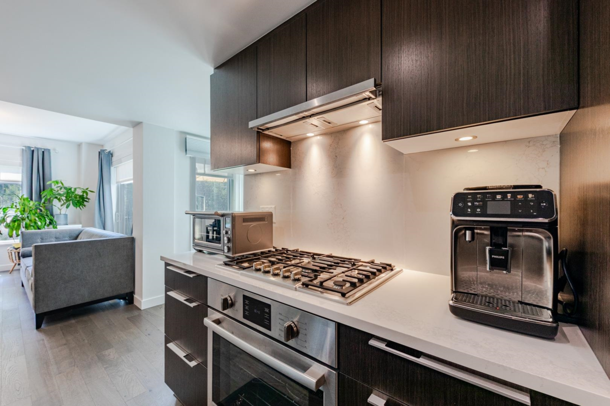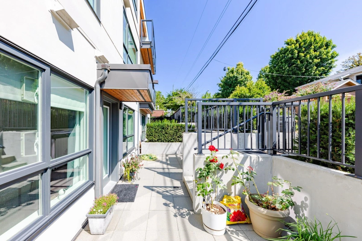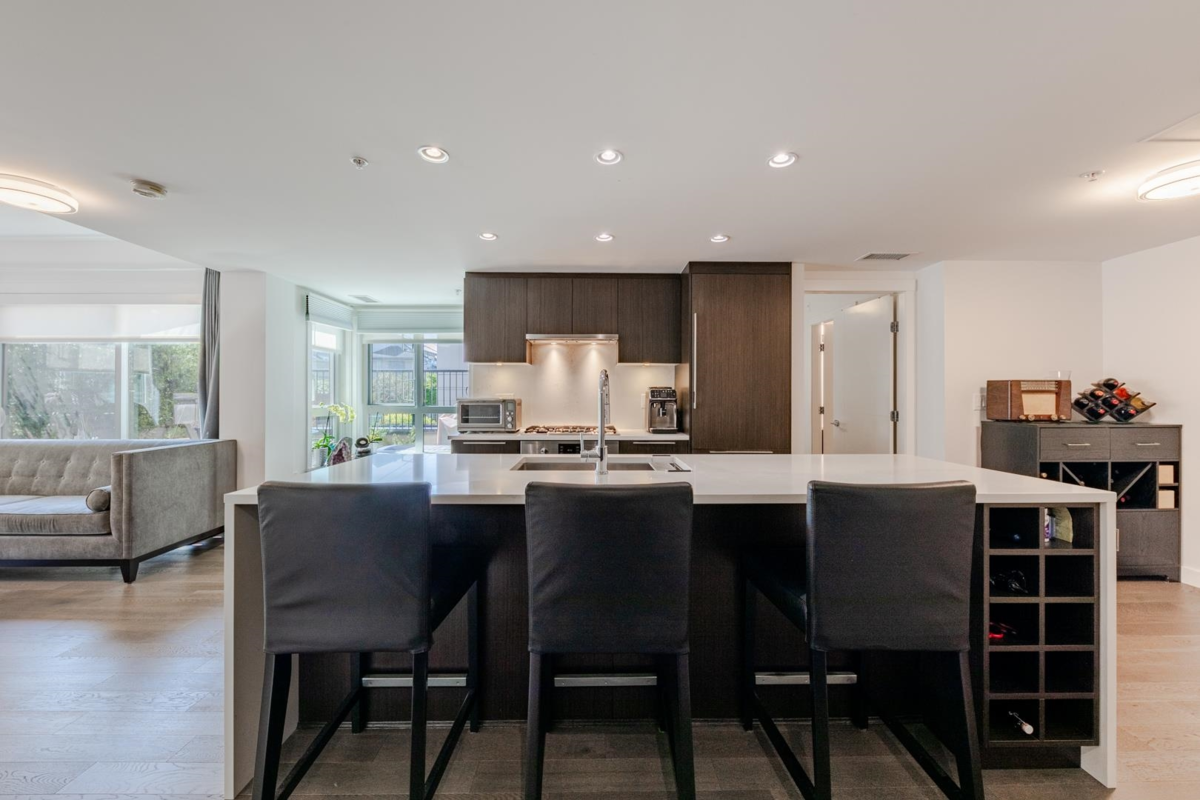 Welcome to The Leveson, nestled in the vibrant South Granville neighborhood. This QUIET (away from Granville) ground-floor, single-level 2 Bedroom + Office home boasts 460 sq ft of private outdoor space. With its elegant, contemporary A/C design and dual access from the street and building, it feels more like a townhome. The chef-inspired kitchen features premium Bosch appliances, a gas cooktop, and quartz countertops with a sleek waterfall edge. The spacious primary bedroom easily fits a king-sized bed, includes a large walk-in closet, and a luxurious double vanity ensuite. Two generous patios with gas hookup are ideal for BBQs and entertaining. Unbeatable location near transit, shops, dining, and top Vancouver schools. Includes 1 EV parking and upgraded locker attached to the stall.