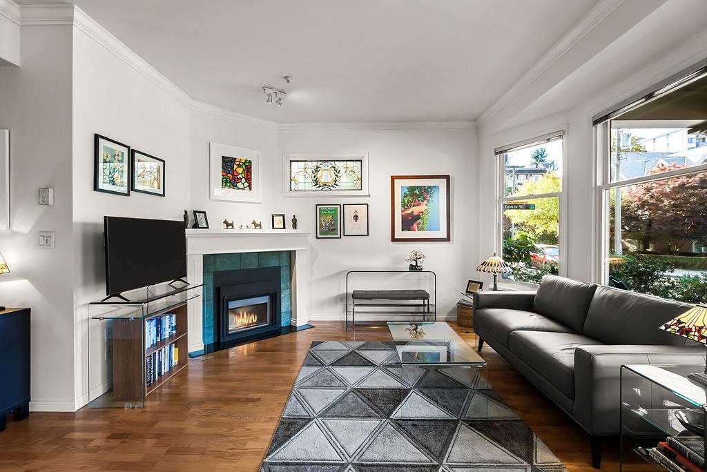 When they converted this 1909 heritage building, they kept the entire ground floor as one residence — something that almost never happens. Most get chopped into rentals. This one stayed whole. Windows on all four sides. No shared walls. Bay windows, oak floors, stained glass, and a 125 sq ft covered veranda. You're not in a tower or typical condo — you're in an actual house. 2 bed, 2 bath, 858 sq ft with underground parking, massive crawlspace storage plus large locker, and pets welcome. Only two heritage units exist in the building. This is the only one under 1,000 sq ft. Extremely well-run strata. Fully rebuilt 1995 with modern systems while preserving character. Steps from the seawall, Stanley Park, English Bay, and the best dining on Denman and Robson. Open Sat/Sun Nov 29-30, 2-4pm.