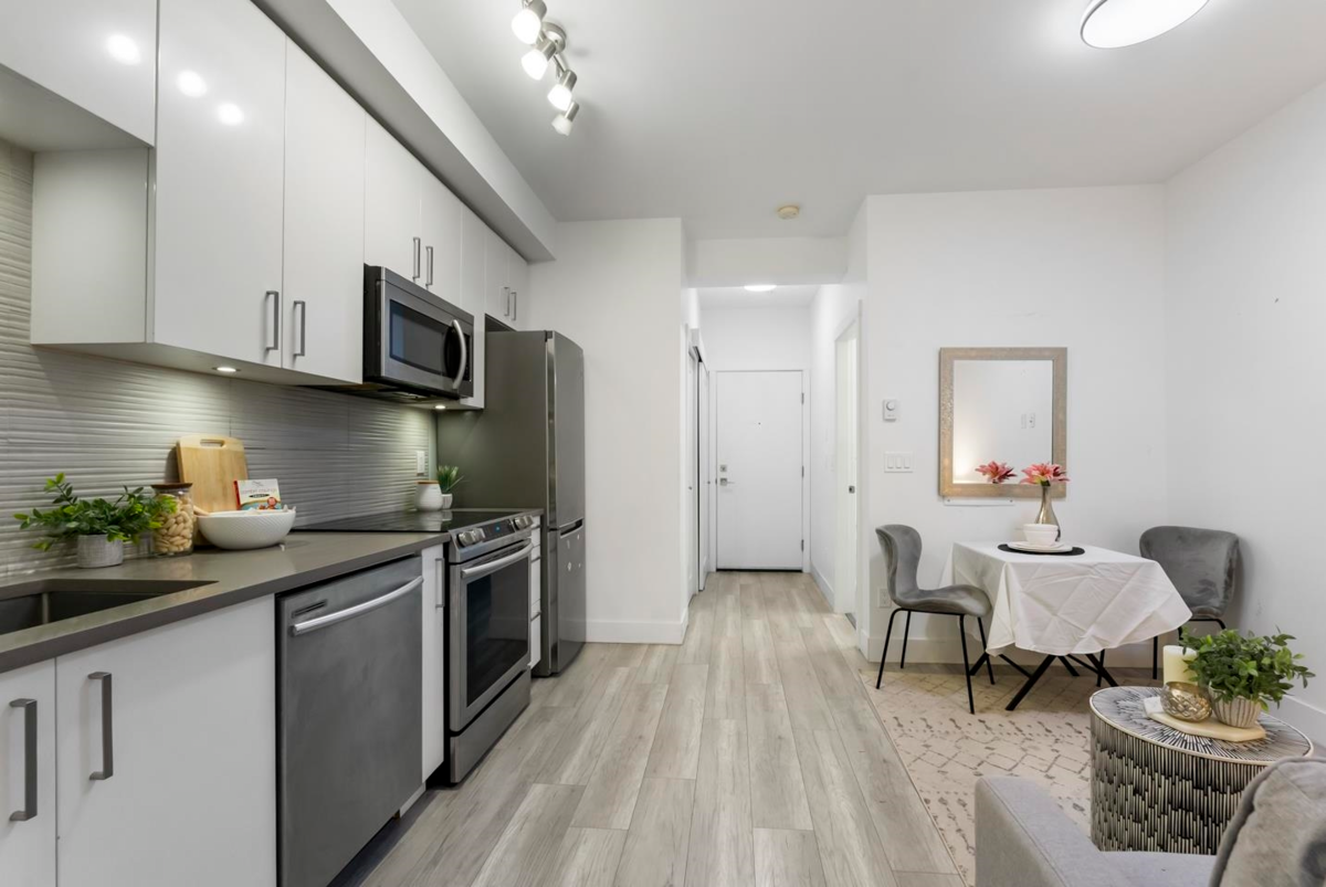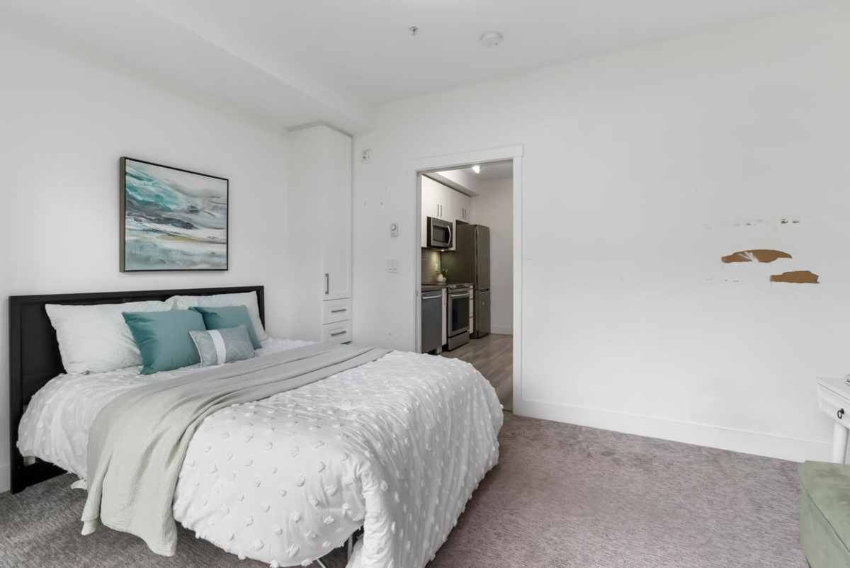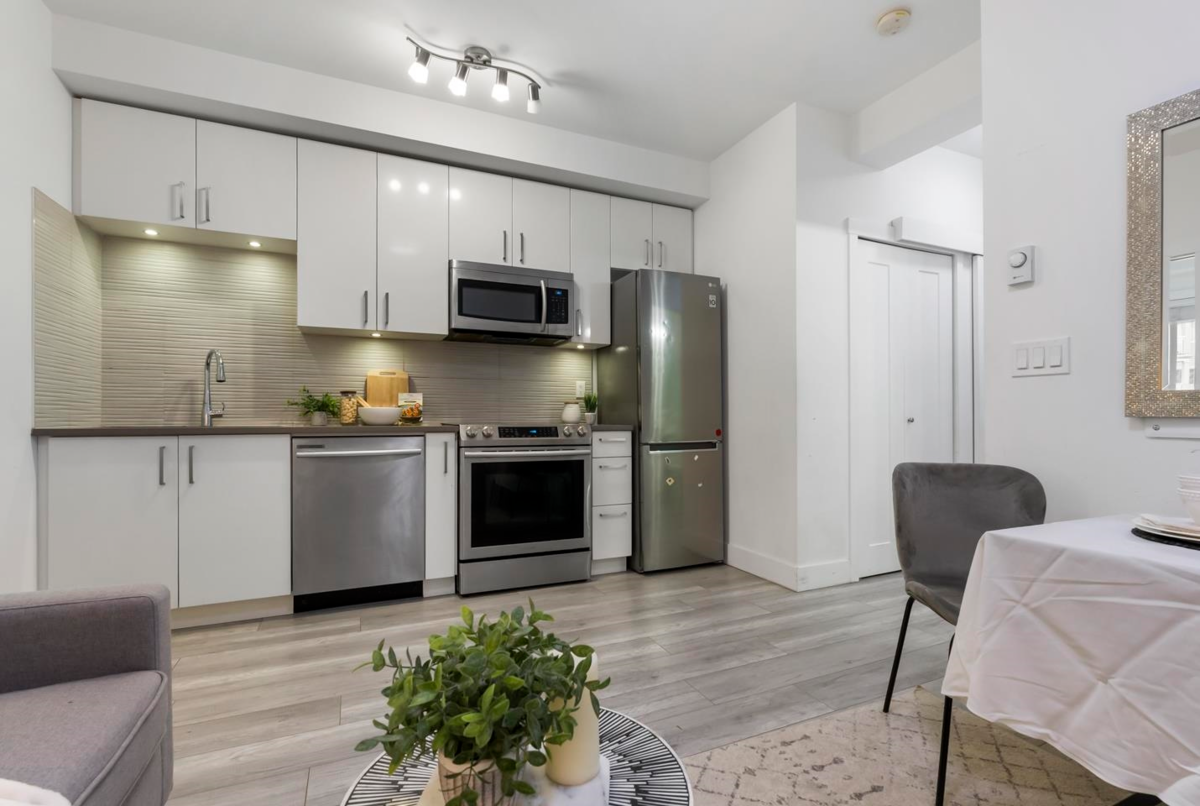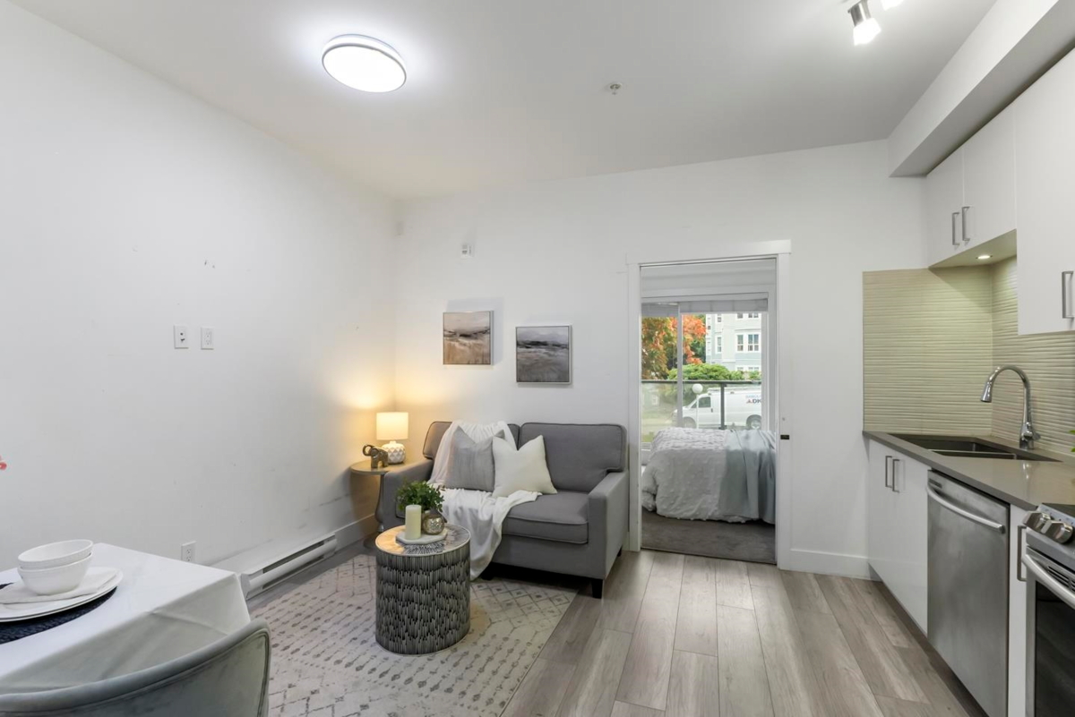 Welcome to Fraser Landmark! This rare ground-floor studio + den offers exceptional privacy with no neighbours on either side and its own private entrance. Enjoy a bright, modern kitchen with quartz countertops and stainless steel appliances, along with two patios that extend your living and entertaining space. INCLUDES 3 PARKING STALLS. Located steps from the future SkyTrain and minutes to schools, shopping, and Surrey Memorial Hospital, this is an ideal opportunity for first-time buyers and investors alike.