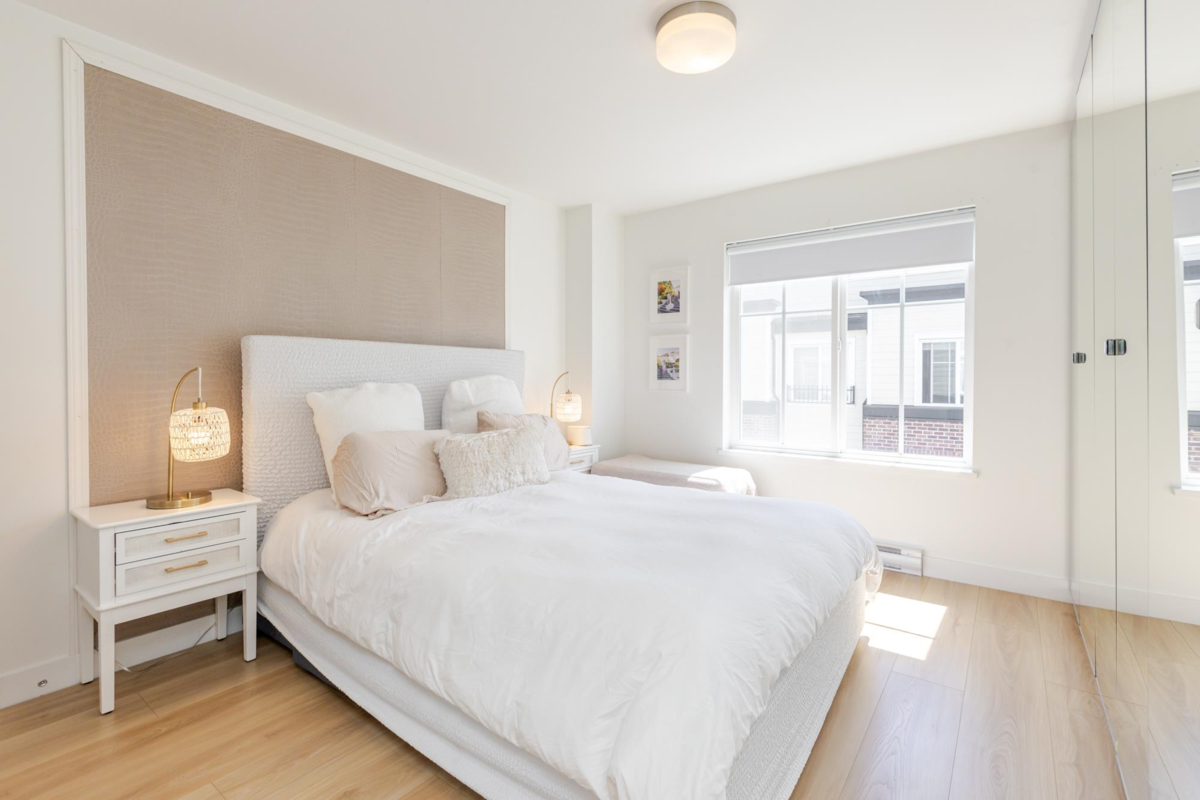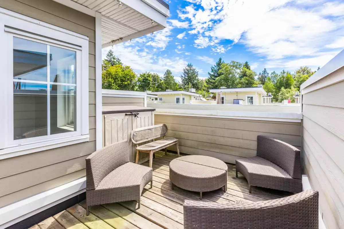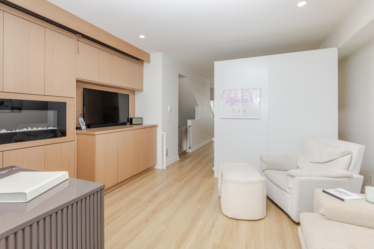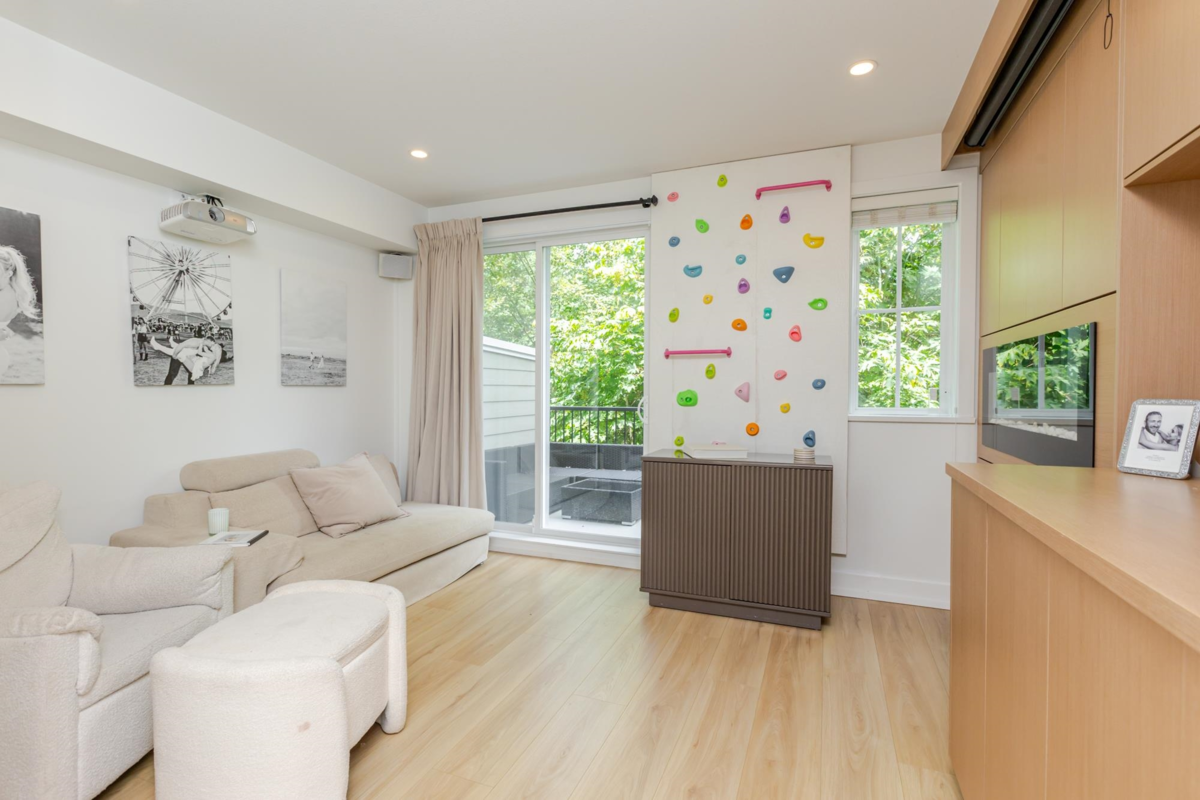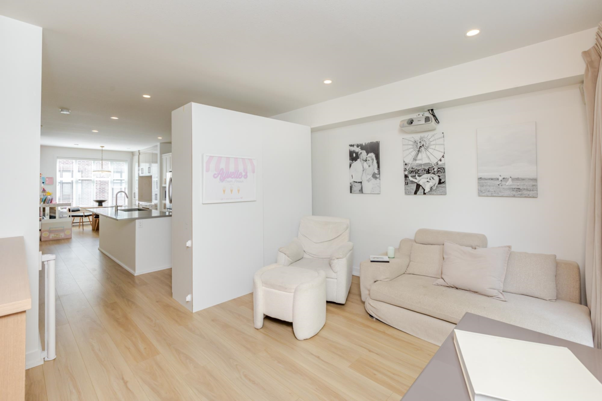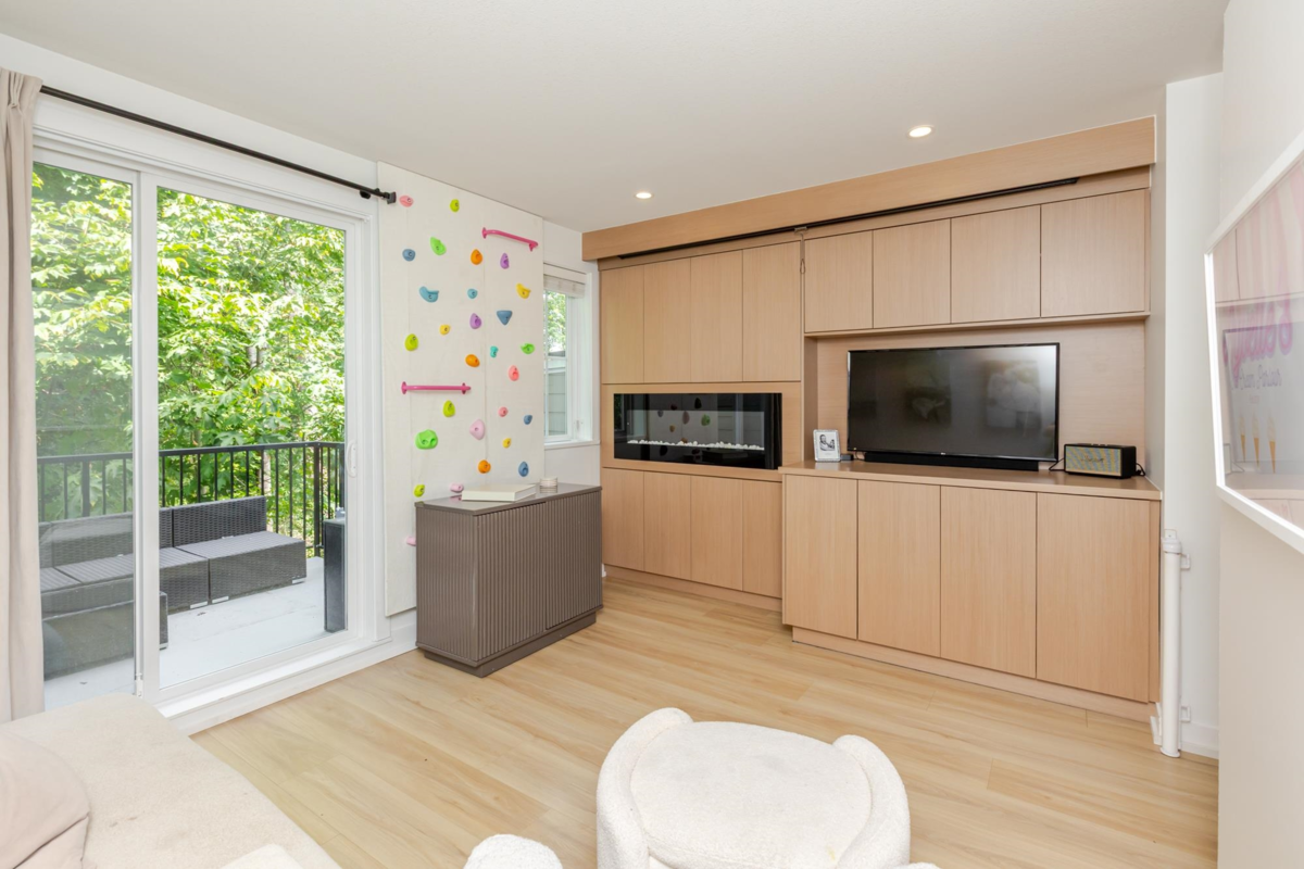 Welcome to THE WOODS — an immaculate, move-in-ready residence that blends modern elegance with family comfort. This stunning 3-bedroom, 2-bath + den townhome offers an open-concept main floor with a spacious island, quartz countertops, and premium stainless steel appliances. Custom millwork, new flooring (2024), and a built-in projector screen add both sophistication and comfort, while the expansive rooftop deck is perfect for entertaining.The walk-out den off the tandem garage opens directly onto tranquil greenspace, ideal for a home office, studio, or playroom. Nestled in a family-friendly community, this private yet connected location offers easy access to parks, shops, schools, and Highway 99 - the perfect setting for modern family living.