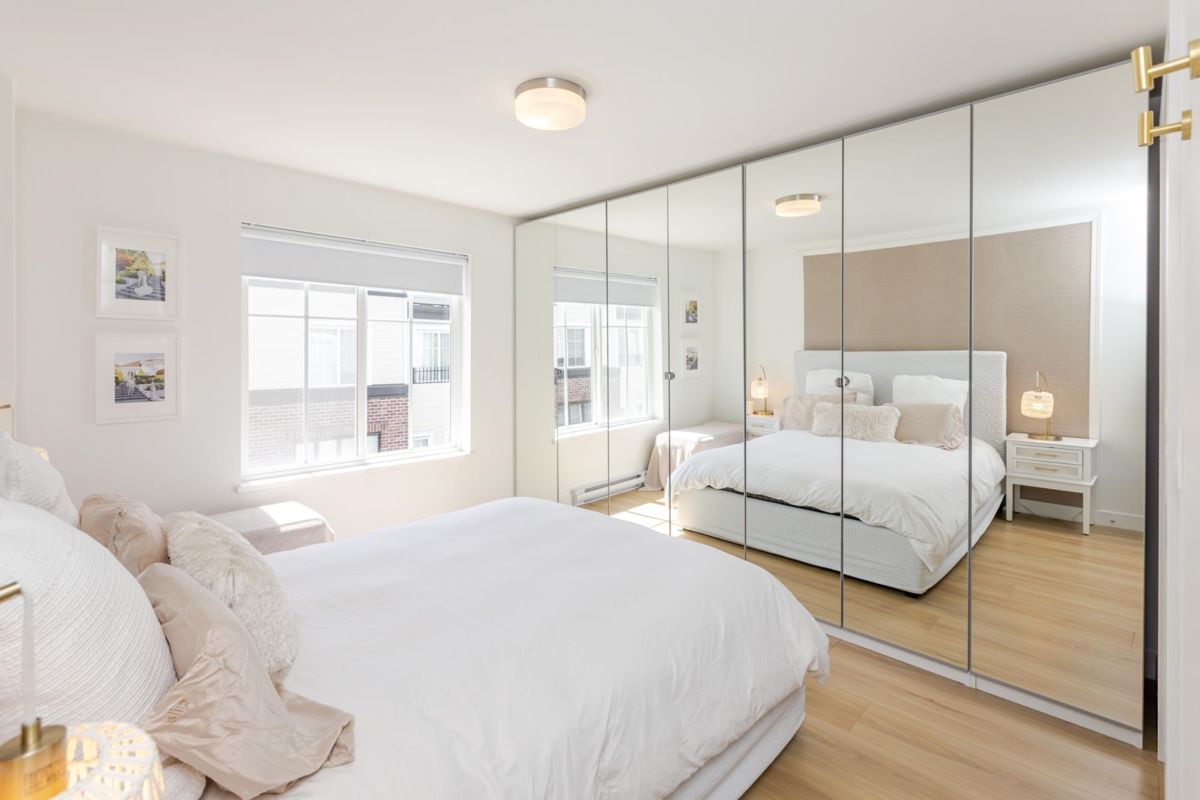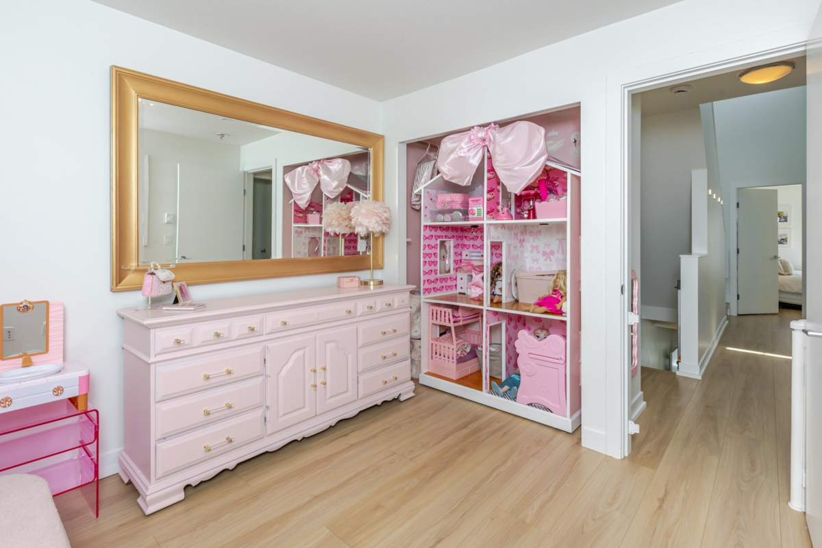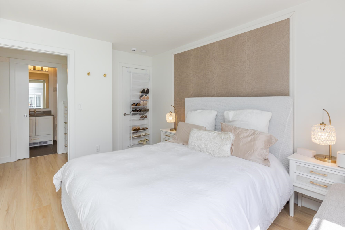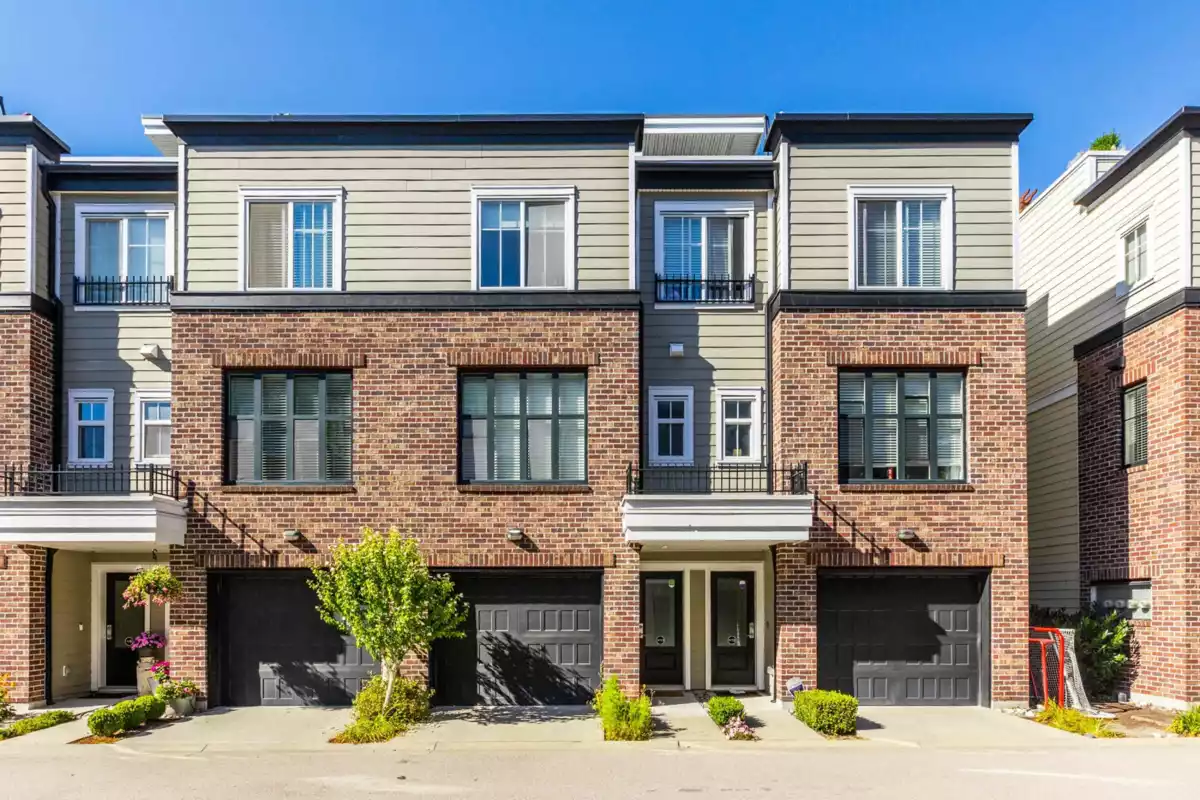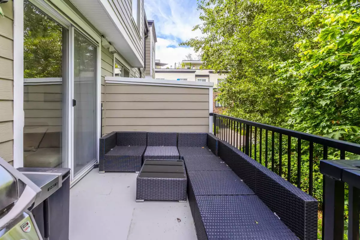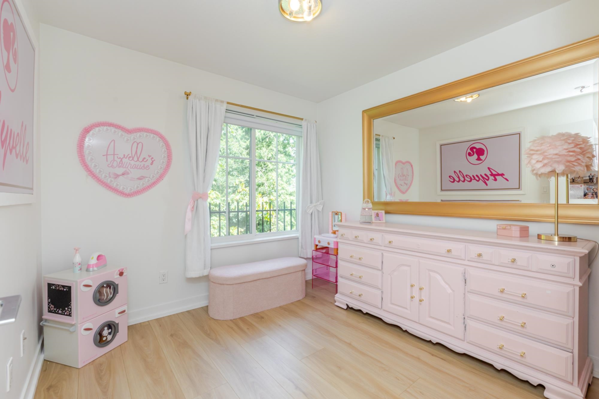 Welcome to THE WOODS — an immaculate, move-in-ready residence that blends modern elegance with family comfort. This stunning 3-bedroom, 2-bath + den townhome offers an open-concept main floor with a spacious island, quartz countertops, and premium stainless steel appliances. Custom millwork, new flooring (2024), and a built-in projector screen add both sophistication and comfort, while the expansive rooftop deck is perfect for entertaining.The walk-out den off the tandem garage opens directly onto tranquil greenspace, ideal for a home office, studio, or playroom. Nestled in a family-friendly community, this private yet connected location offers easy access to parks, shops, schools, and Highway 99 - the perfect setting for modern family living.