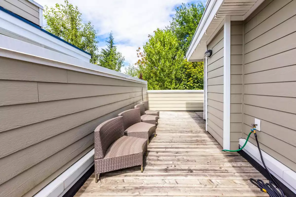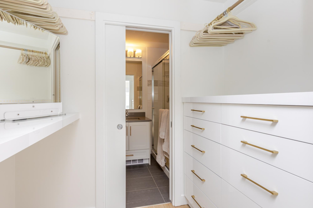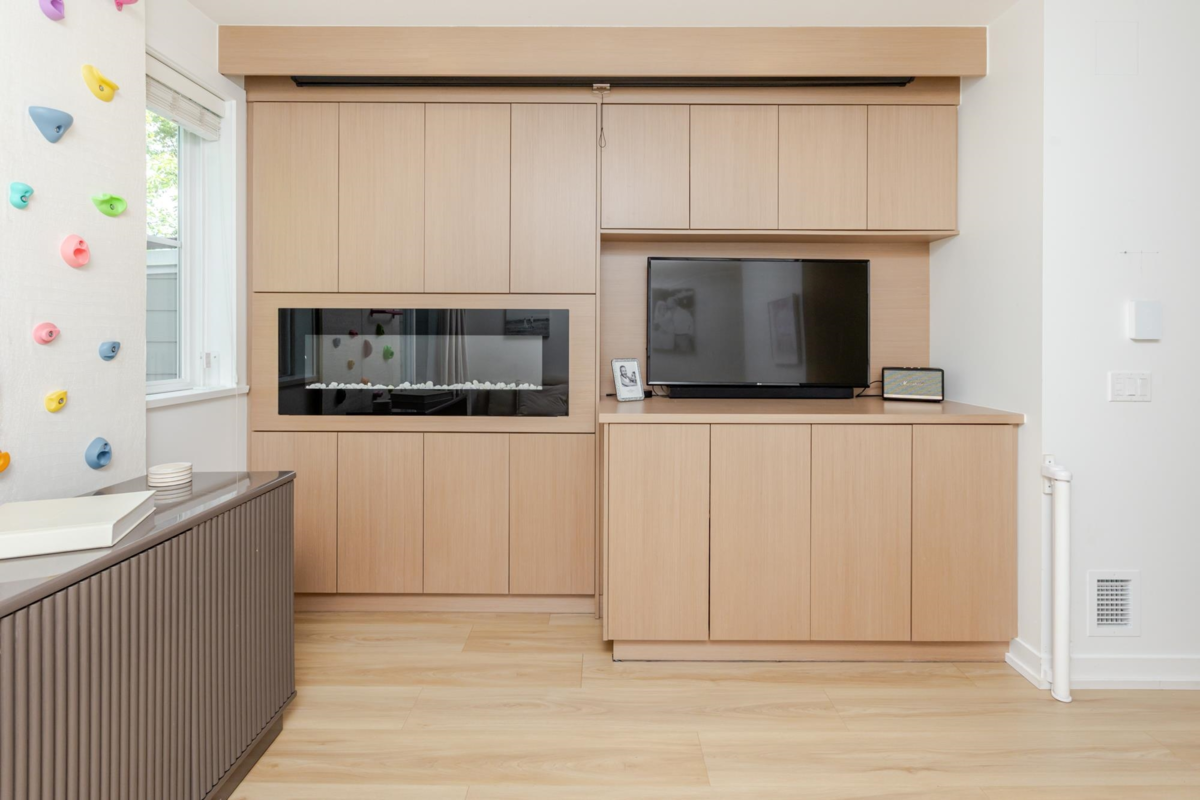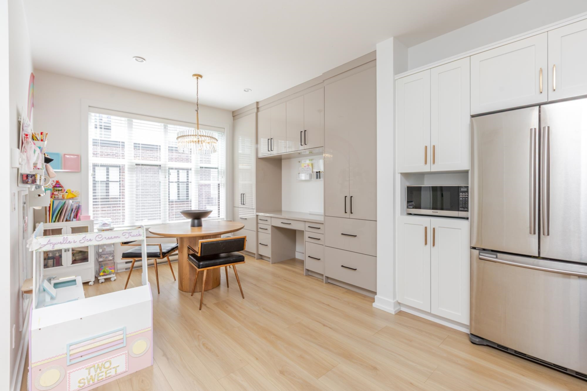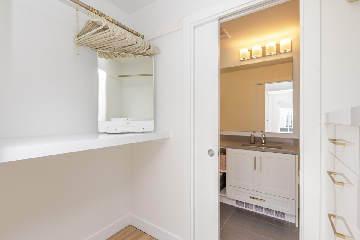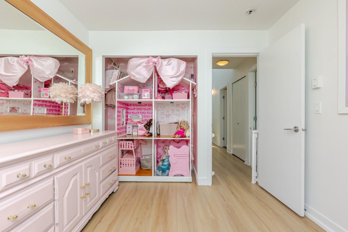 Welcome to THE WOODS — an immaculate, move-in-ready residence that blends modern elegance with family comfort. This stunning 3-bedroom, 2-bath + den townhome offers an open-concept main floor with a spacious island, quartz countertops, and premium stainless steel appliances. Custom millwork, new flooring (2024), and a built-in projector screen add both sophistication and comfort, while the expansive rooftop deck is perfect for entertaining.The walk-out den off the tandem garage opens directly onto tranquil greenspace, ideal for a home office, studio, or playroom. Nestled in a family-friendly community, this private yet connected location offers easy access to parks, shops, schools, and Highway 99 - the perfect setting for modern family living.