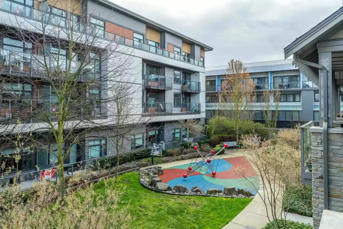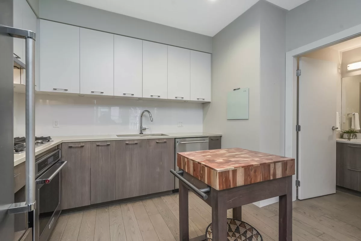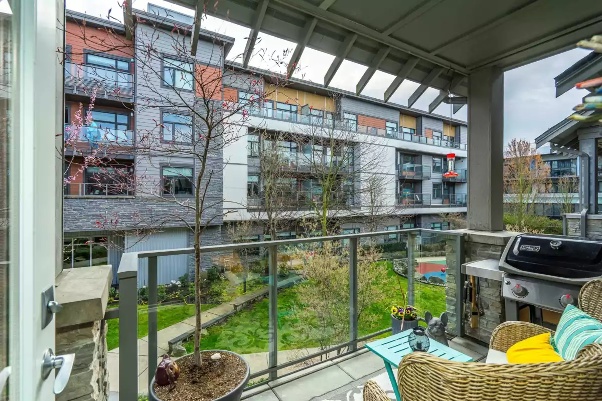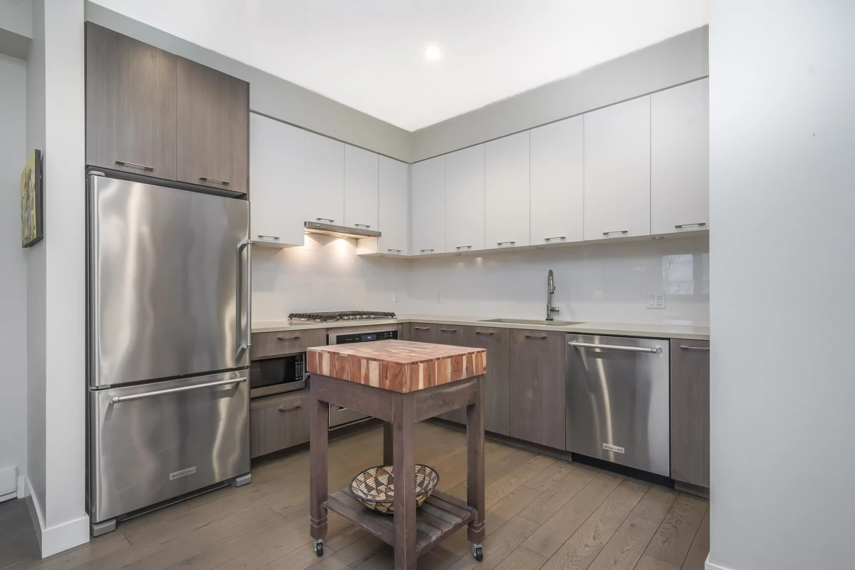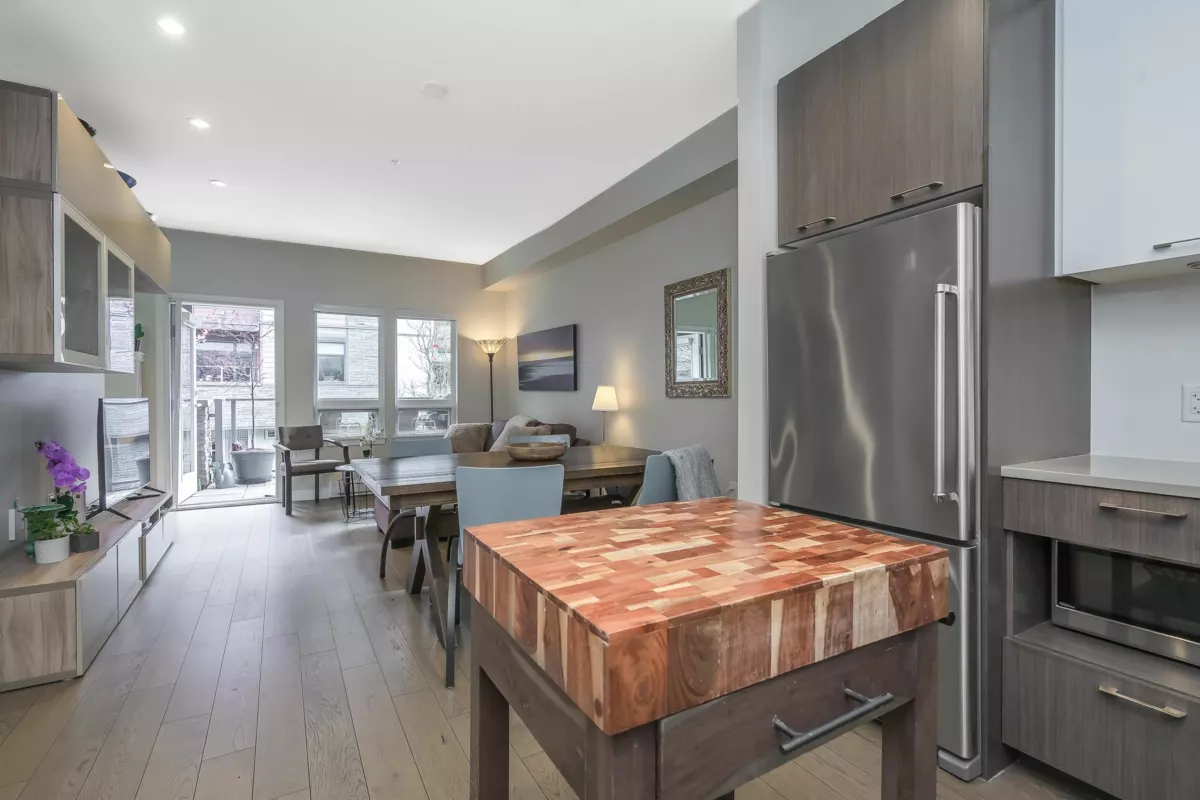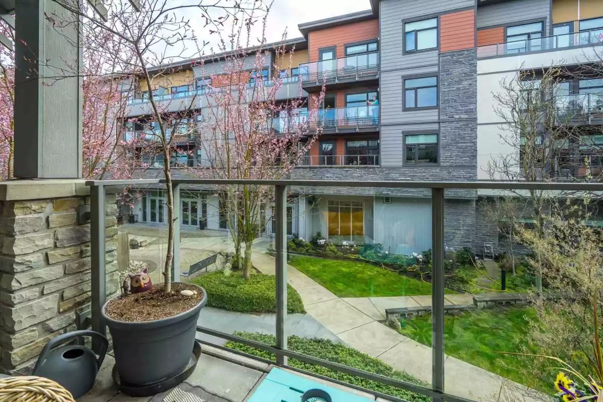 The best exposure in the complex-overlooking the landscaped courtyard+fountain! Thoughtful floor plan with exceptional finishing! With 9' ceilings in main living area, open concept kitchen (quartz c/tops, s/steel appliances, 5 burner gas range) flows into dining/living area with easy access to east exposed deck (12'x6') overlooking courtyard (n/gas hookup). The upper floor offers three bedrooms, primary with full ensuite, laundry + full bathroom. Desk/office area too! Engineered wood flooring +nu-heat bathroom floors, light and bright throughout! 1268 sq.ft. of living space! Elevator to secure parking R58 (storage in front)+ bike storage. Pets welcome! Maint $394.74/mo. Walk to shops and amenities! Step out of your front door into the quiet courtyard with sitting area and water feature!