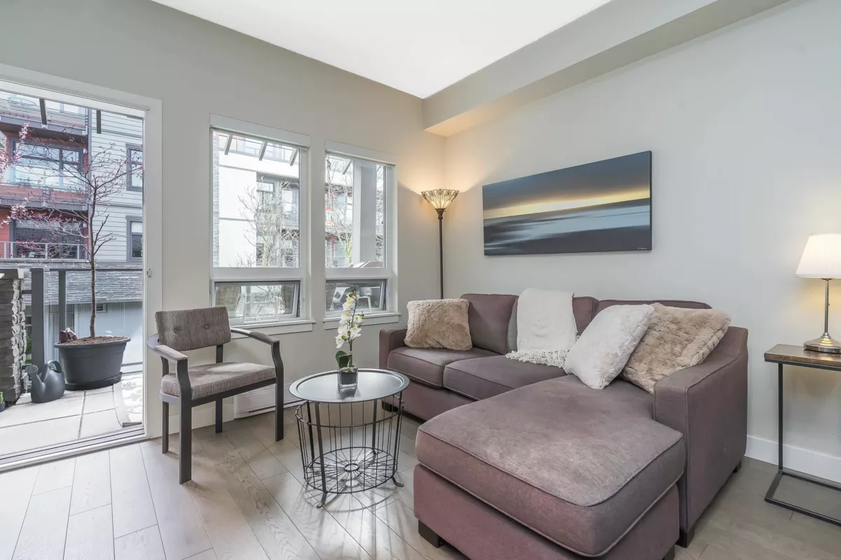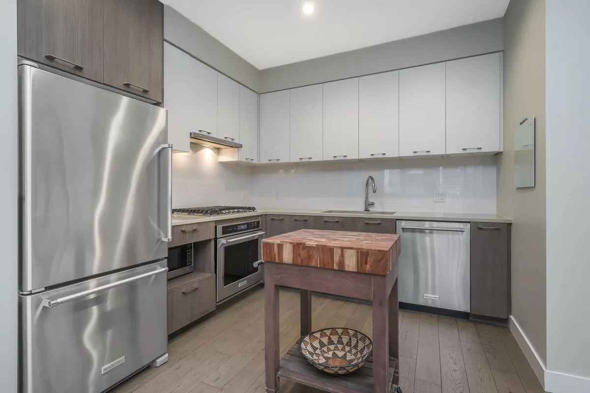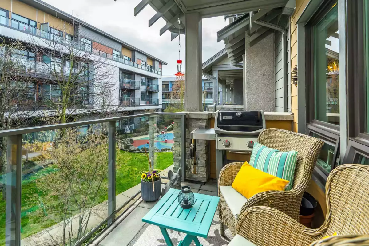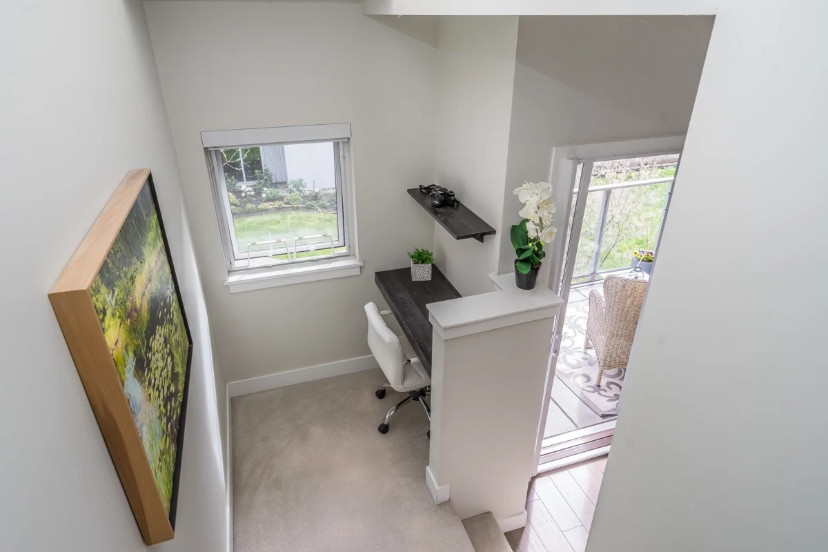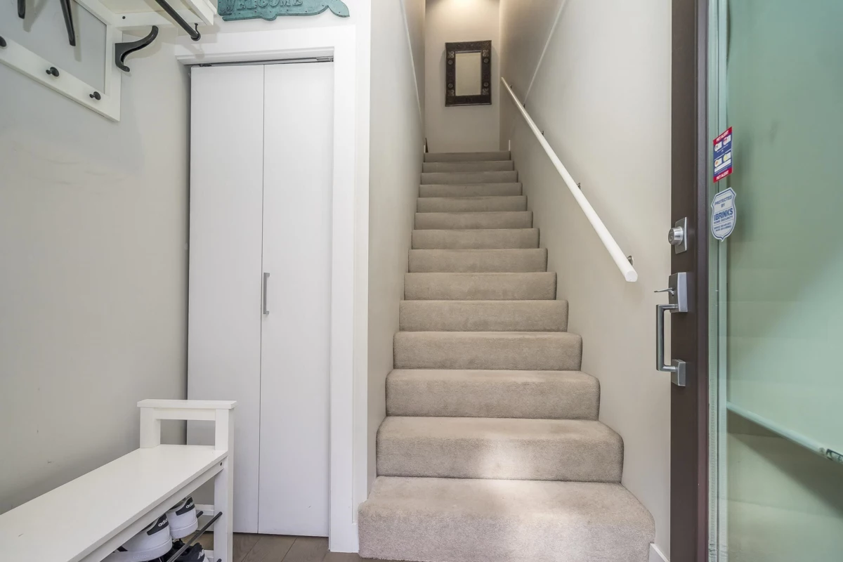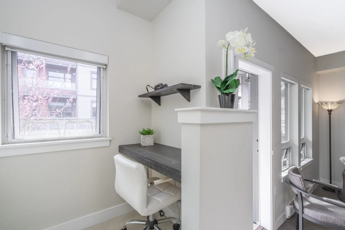 The best exposure in the complex-overlooking the landscaped courtyard+fountain! Thoughtful floor plan with exceptional finishing! With 9' ceilings in main living area, open concept kitchen (quartz c/tops, s/steel appliances, 5 burner gas range) flows into dining/living area with easy access to east exposed deck (12'x6') overlooking courtyard (n/gas hookup). The upper floor offers three bedrooms, primary with full ensuite, laundry + full bathroom. Desk/office area too! Engineered wood flooring +nu-heat bathroom floors, light and bright throughout! 1268 sq.ft. of living space! Elevator to secure parking R58 (storage in front)+ bike storage. Pets welcome! Maint $394.74/mo. Walk to shops and amenities! Step out of your front door into the quiet courtyard with sitting area and water feature!