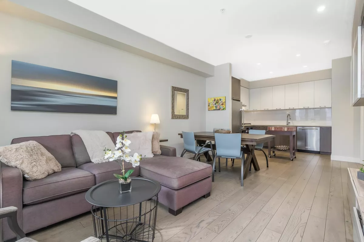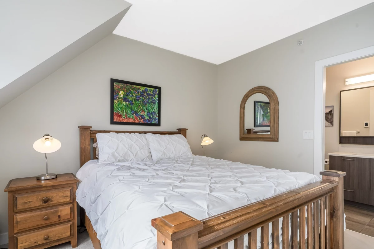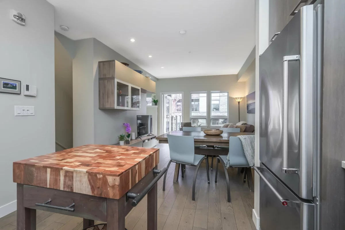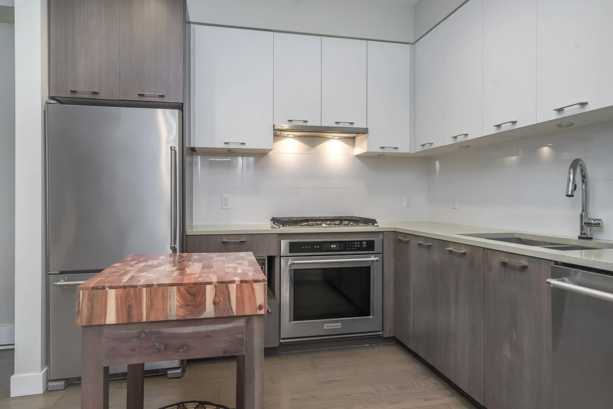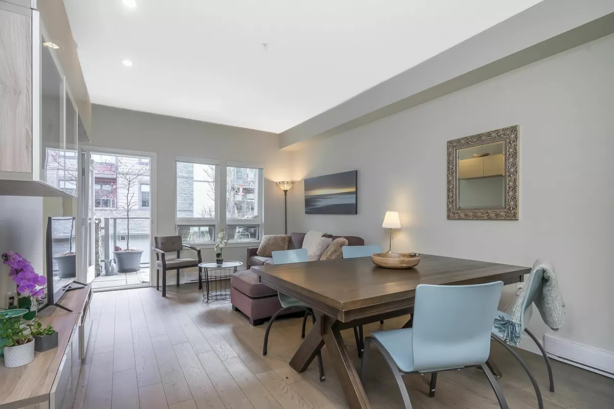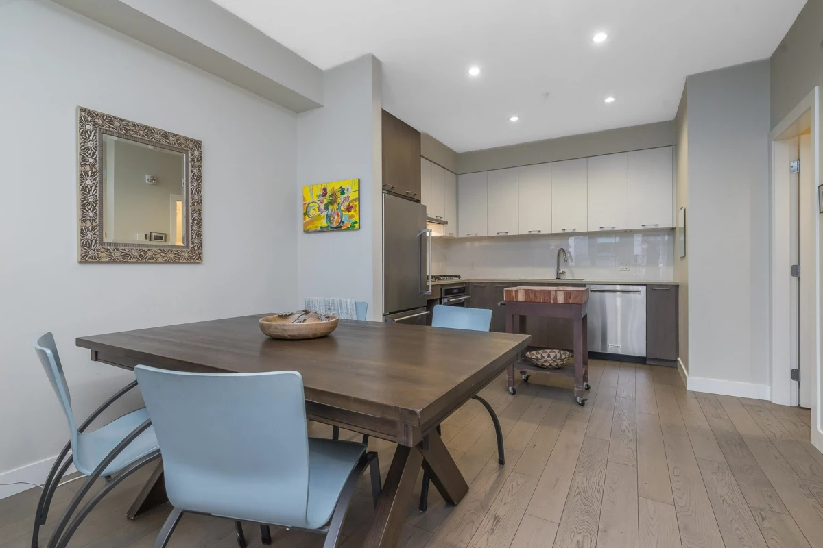 The best exposure in the complex-overlooking the landscaped courtyard+fountain! Thoughtful floor plan with exceptional finishing! With 9' ceilings in main living area, open concept kitchen (quartz c/tops, s/steel appliances, 5 burner gas range) flows into dining/living area with easy access to east exposed deck (12'x6') overlooking courtyard (n/gas hookup). The upper floor offers three bedrooms, primary with full ensuite, laundry + full bathroom. Desk/office area too! Engineered wood flooring +nu-heat bathroom floors, light and bright throughout! 1268 sq.ft. of living space! Elevator to secure parking R58 (storage in front)+ bike storage. Pets welcome! Maint $394.74/mo. Walk to shops and amenities! Step out of your front door into the quiet courtyard with sitting area and water feature!