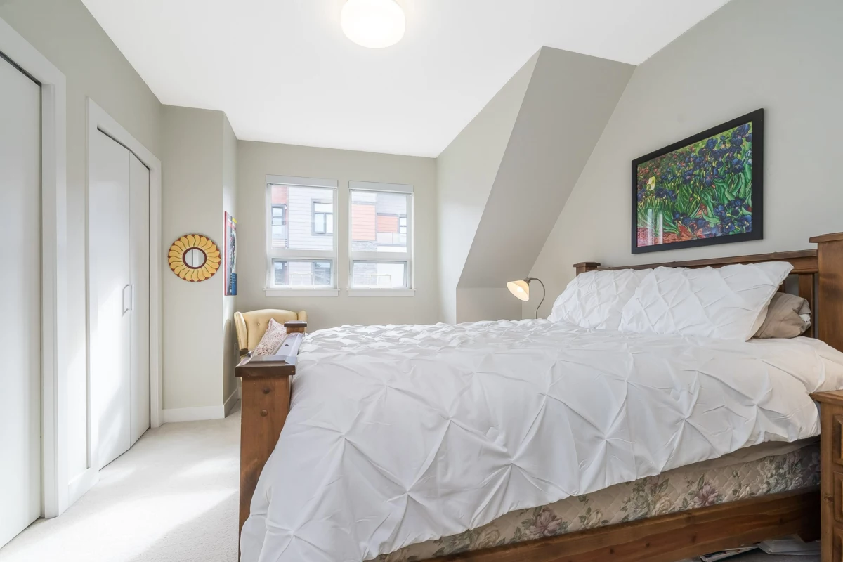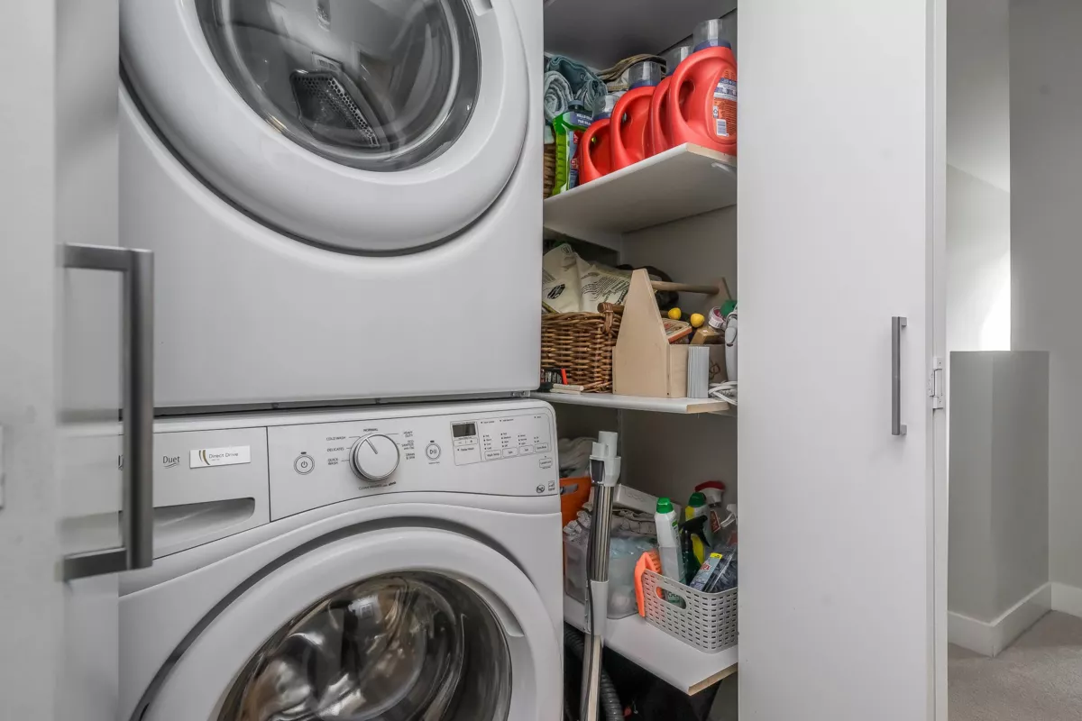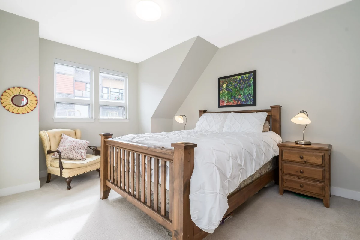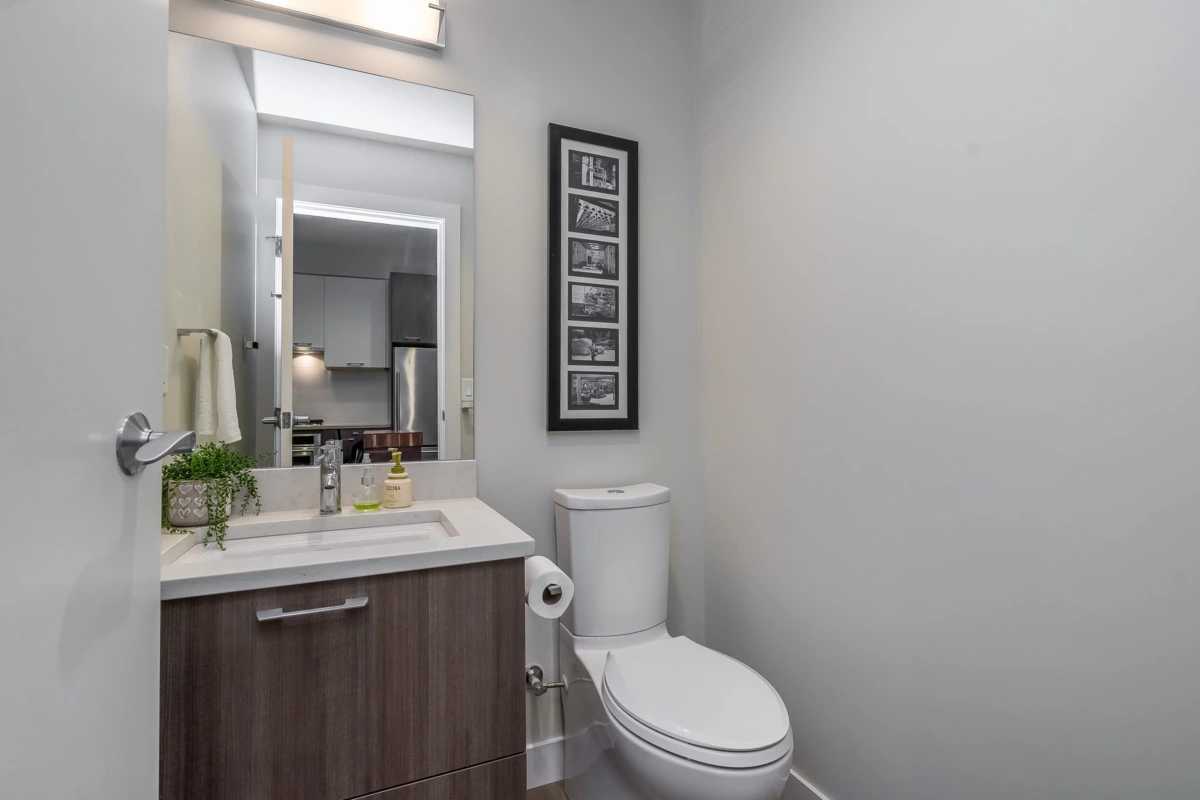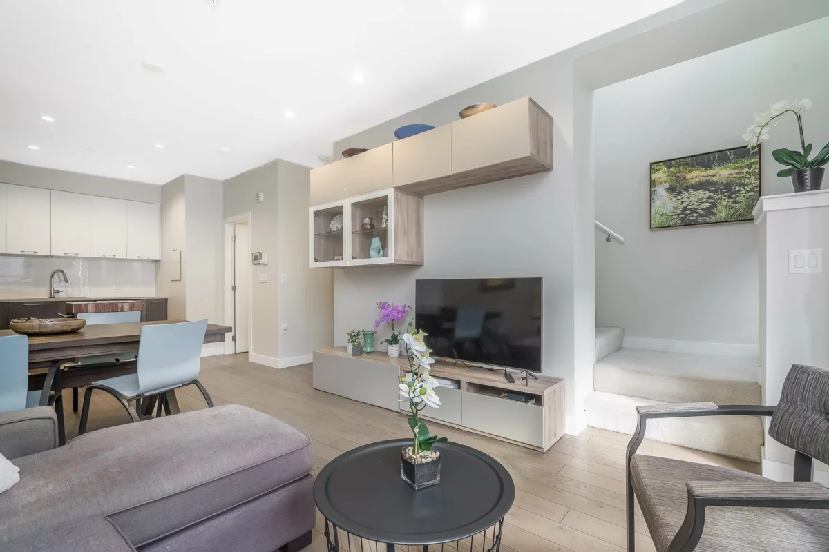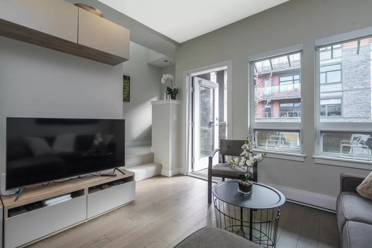 The best exposure in the complex-overlooking the landscaped courtyard+fountain! Thoughtful floor plan with exceptional finishing! With 9' ceilings in main living area, open concept kitchen (quartz c/tops, s/steel appliances, 5 burner gas range) flows into dining/living area with easy access to east exposed deck (12'x6') overlooking courtyard (n/gas hookup). The upper floor offers three bedrooms, primary with full ensuite, laundry + full bathroom. Desk/office area too! Engineered wood flooring +nu-heat bathroom floors, light and bright throughout! 1268 sq.ft. of living space! Elevator to secure parking R58 (storage in front)+ bike storage. Pets welcome! Maint $394.74/mo. Walk to shops and amenities! Step out of your front door into the quiet courtyard with sitting area and water feature!