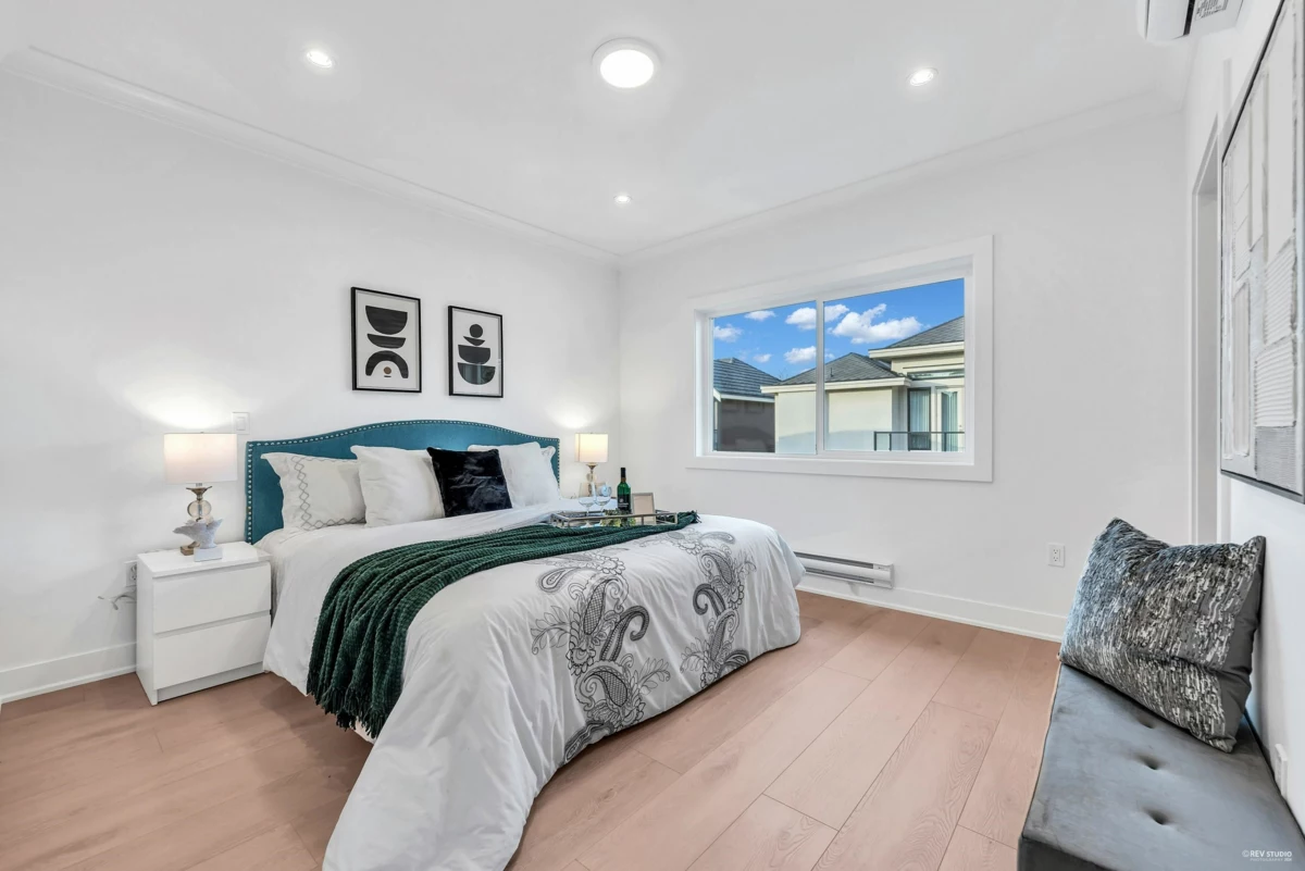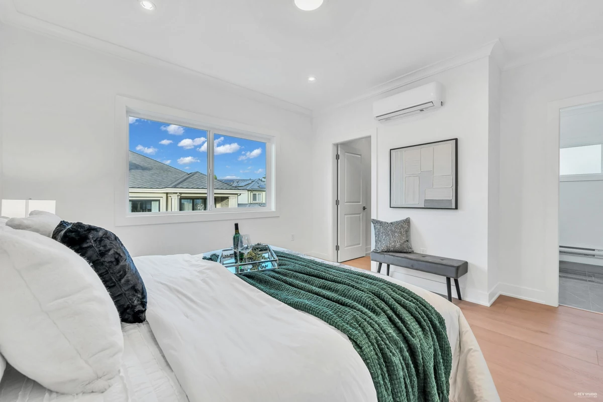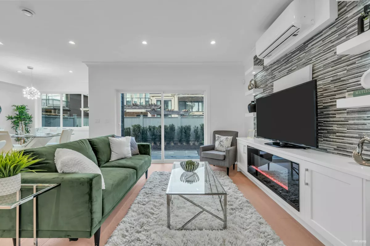 Stylish 2-story townhome showcasing modern design, high-end finishes, and abundant natural light. Gourmet kitchen with stainless appliances, quartz counters, and island seating open to a bright dining area and inviting living room with custom built-ins, underlit shelving, and a sleek electric fireplace. Features 3 full baths including a lower-level bedroom with cheater ensuite, perfect for guests or home office. Primary suite offers a spa-inspired ensuite retreat. Comfort living year-round with A/C, HRV, and heat pump. Enjoy a 2 car tandem garage with EV outlet and a large, fully landscaped private side yard for outdoor living. Steps to South Arm Community Centre, tennis & pickleball courts, outdoor pool, parks, and top schools James Whiteside Elementary and Hugh McRoberts Secondary.
