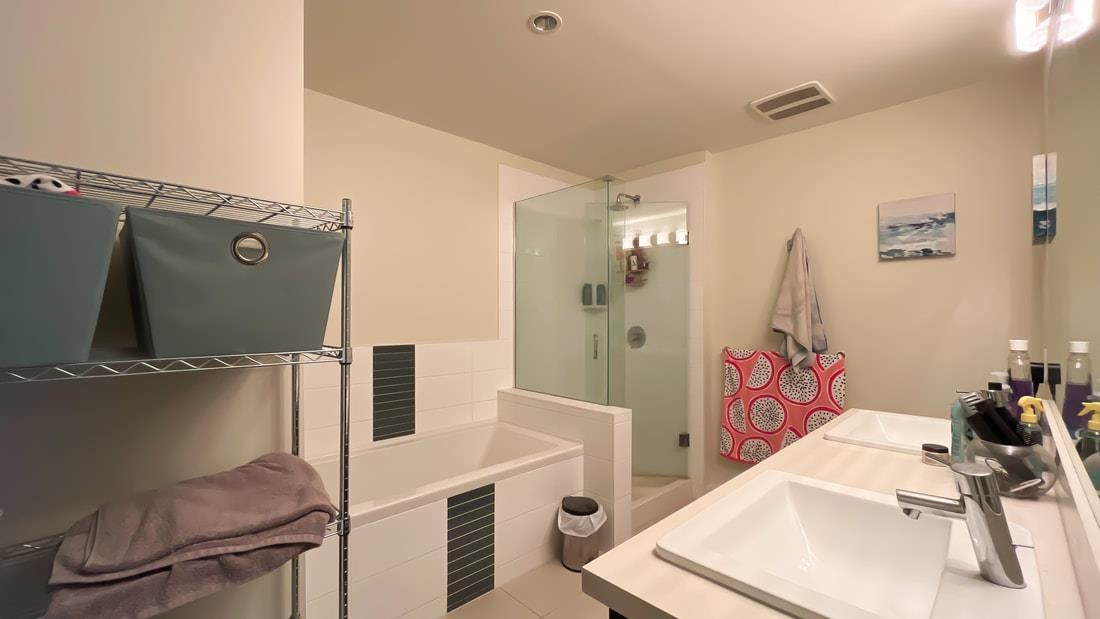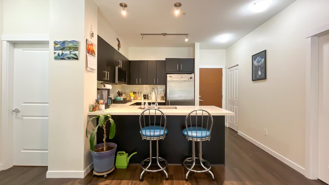 BEST Priced home in all River District! Largest interior unit in the complex & the largest patio! Over 1100 square feet interior & townhome style with your own front door off your huge patio (over 400 sqft). One of the best floor plans you can get with opposite side bedrooms & flex room. Open-concept living & dining areas that easily accommodate full-size furniture, radiant in-floor heating, 9' ceilings, new flooring & blinds. The chef-inspired kitchen comes with new S/S appliances, quartz countertops & a gas range. The primary bedroom includes a walk-in closet & a luxurious ensuite with a double vanity, separate shower & soaker tub. The complex features a gym & amenity room. Located steps from parks, trails, shops & much more. Book your showing today!