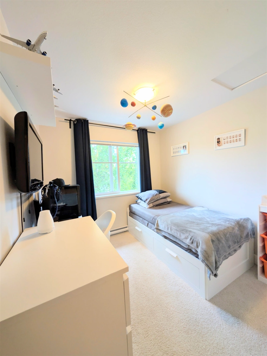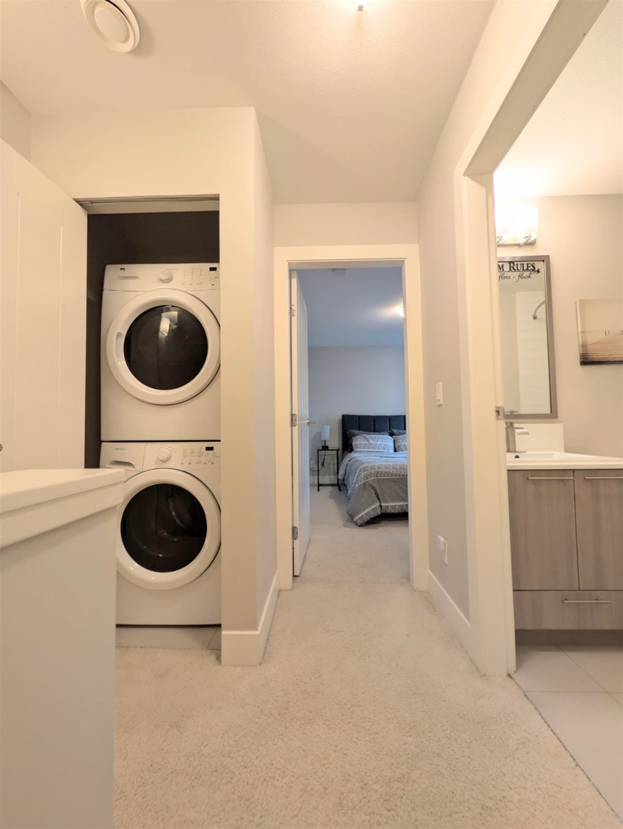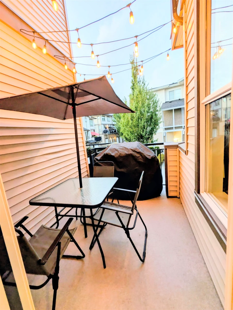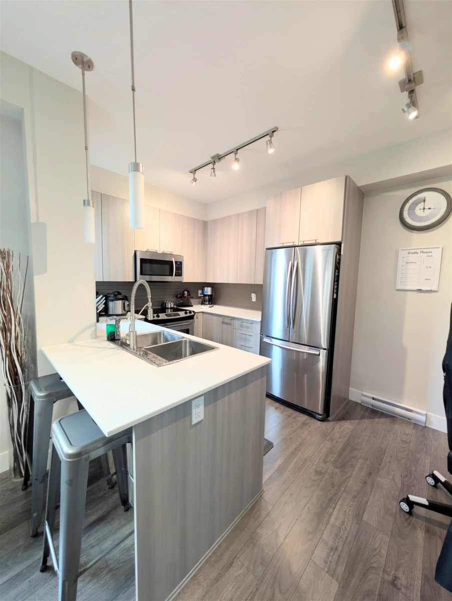 Welcome to The GROVE. This bright and spacious home offers 2 bedrooms, 2 bathrooms, soaring 9 ft. ceilings, and an open-concept layout that’s perfect for entertaining. Oversized windows flood the home with natural light, creating a warm and inviting atmosphere. The sleek kitchen features stainless steel appliances, quartz countertops, and a built-in desk nook. The wide main floor feels open and airy, while upstairs boasts a convenient laundry area, a generous primary suite with walk-in closet and ensuite, plus a second bedroom. Step out onto your private deck overlooking the peaceful greenbelt. Enjoy the resort-style living with access to incredible amenities:fitness centre,theatre room,fireside lounge,hockey room,clubhouse & heated pool.Steps to Katzie Elementary,transit and shopping