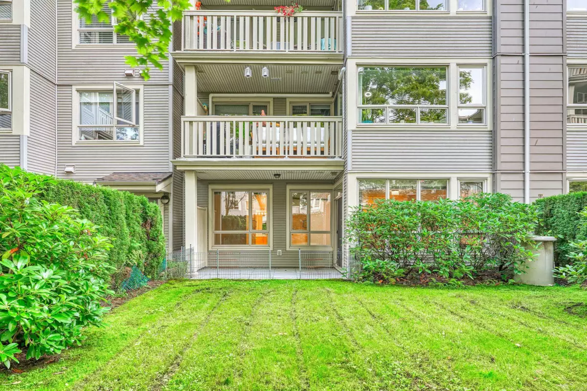 Ideally situated within the coveted community of KLAHANIE, enjoy a freshly painted garden-level 2 bed 2 full bath home at INGLENOOK! The prized enclosed backyard measures 32' x 25' has a beautiful WNE exposure; perfect outdoor space for grilling & area for pups to play! Cozy up in front of the fireplace this winter. Enjoy overheight ceilings with floor to ceiling windows that welcome natural light all day. ALL NEW APPLIANCES include full-size gas range, fridge, dishwasher, MW, SS fixtures, stone countertops & a dining table for 8+ people. NEW W/D. 1 full-size parking stall included (no locker), plenty of visitor parking, 2 domestic pets allowed & "Canoe Club" access: resort-like outdoor pool, hot tub, sauna, gym, indoor basketball court & tennis courts.