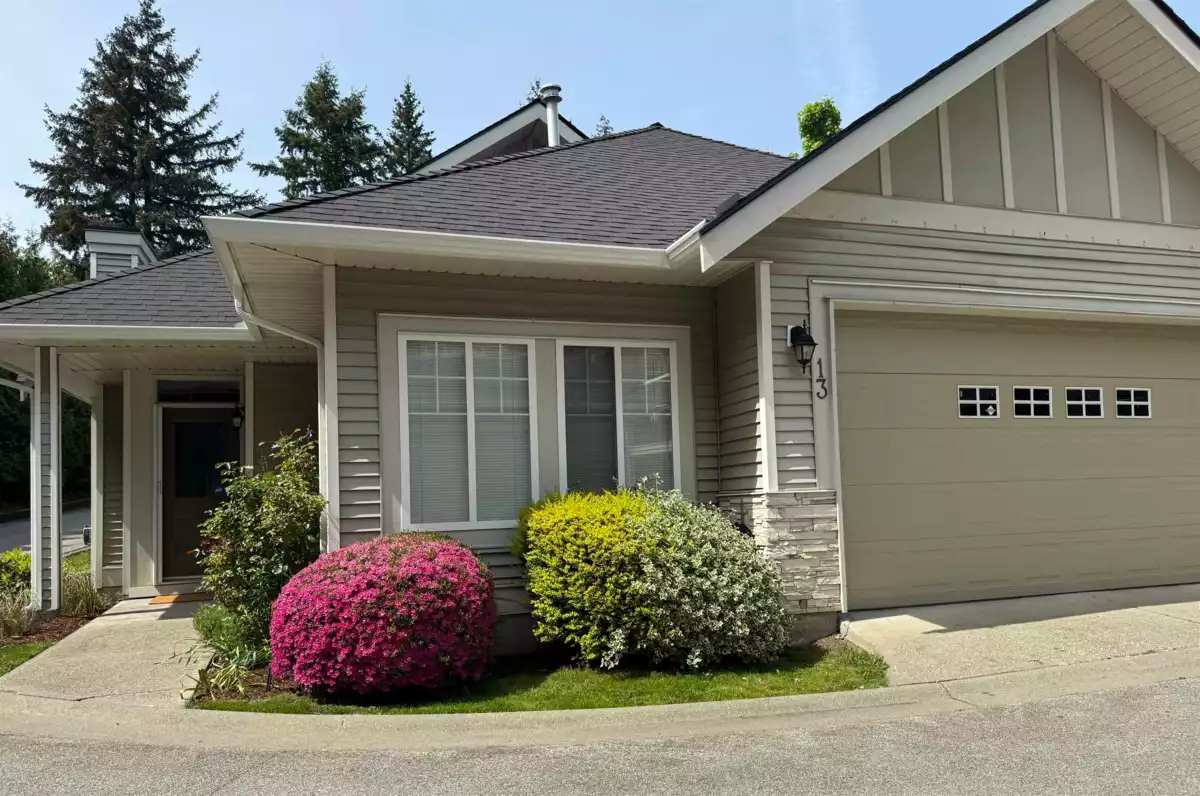 Open 2-4pm Nov 2 Sunday - FULLY Detached townhome unit in this outstanding 36 unit '97 strata with clubhouse, gazebo and beautifully landscaped grounds. #13 is a bright end unit with main floor living, a rancher style 3 level with loft and a fully finished basement. It is a 3+ bdrm plan, there are 3 full bathrooms, 2 gas fplaces {PLUS a patio BBQ gas hookup, $443.86/month strata fee, gorgeous vaulted ceilings and arches, lots of storage, two walk-in closets and 2022 new floors are consistent throughout. The western sunny patio area with BBQ hookup is off the quiet greenspace and dining/kitchen/eating area. There is parking for 3 PLUS guest spots. This original owner has done updates over the years adding air conditioning and an outdoor sprinkler system. NO AGE RESTRICTION HERE! $443.96/mo