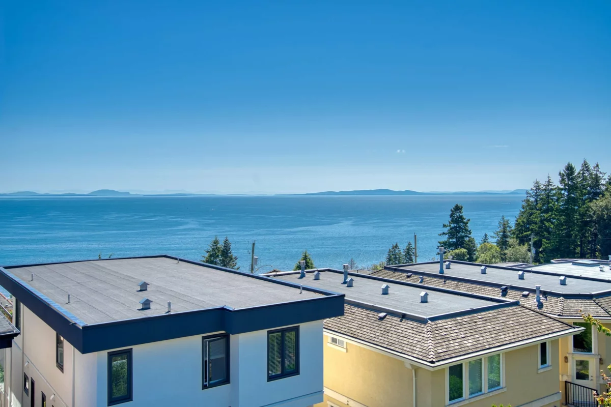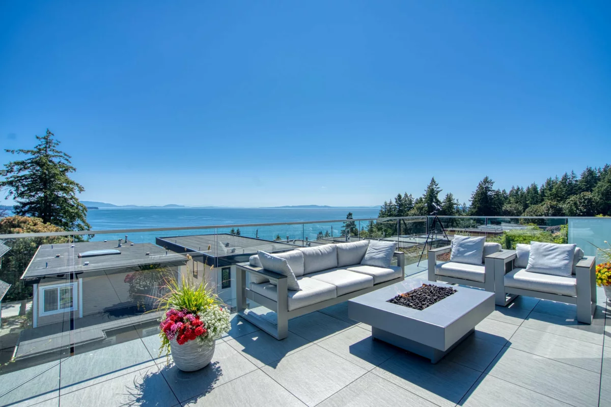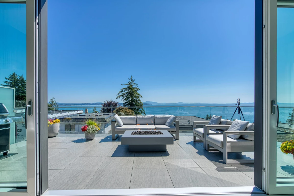 Exquisite West Side luxury residence w/180° Panoramic views, steps to Downtown, shops, Centennial Park, & Semiahmoo School. Masterfully crafted w/marble finishes, a 25'x20' Deck with Gasfirepit, Chef’s Kitchen with SS appliances, integrated fridge, concealed walk-in pantry, rough-in for a spice kitchen.Smart home automation (Control4) w/lighting, audio, &blinds.Engineered for elevator installation.Large theatre room w/bar &wine fridge.The principal home offers 3spacious Bdrms, 2w/private ensuite, lavish Master suite featuring: walk-in dressing room, spa-inspired ensuite w/steam shower+Private balcony.Flat front &rear yards are thoughtfully landscaped w/premium artificial turf.Legal 2-bed suite w/laundry, deck, patio+firepit.