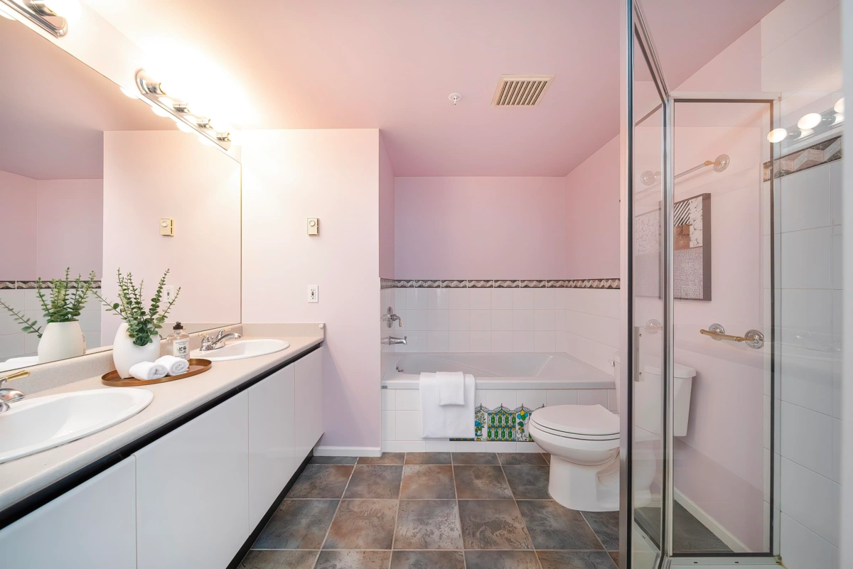 Rarely available 3-bedroom penthouse with 2 large parkings at Rosario Garden. This spacious two-level home offers unmatched 180-degree panoramic views of the North Shore mountains and surrounding gardens. The upper level features two bedrooms and 2 baths while the main level includes a third bedroom, giving the home a detached-house feel.The kitchen and family room boast thoughtful details, including a sliding door between the kitchen and dining room, and an expanded space for the fridge. Generous outdoor areas off the bedrooms and living room provide perfect spots for relaxation.Centrally located, Richmond Centre, public market, and much more everything you need is just a short walk away, making this home a perfect blend of luxury and convenience.