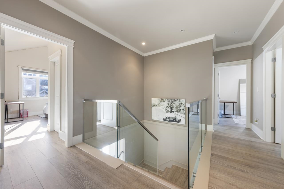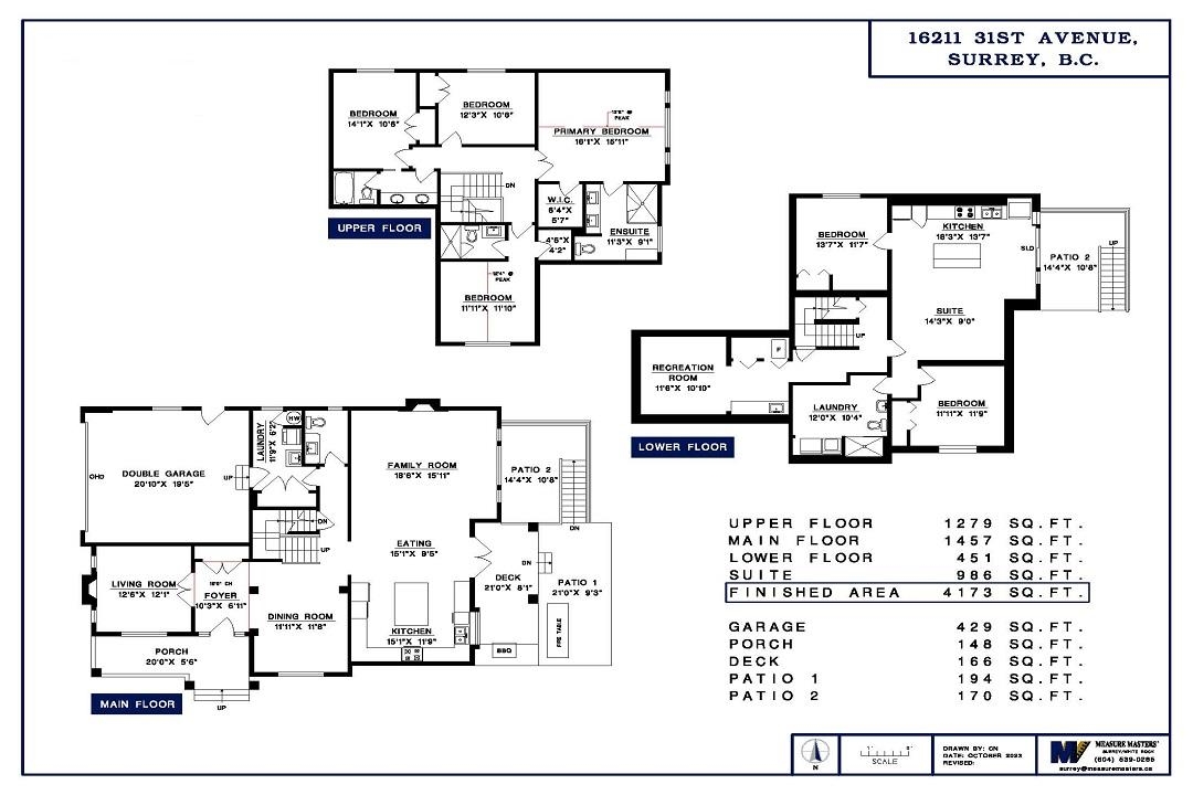 Morgan Acres Corner Property, quiet cul-de-sac executive home. Three levels, vacant 2 bdrm suite below. Total SF 4,173, craftsman design. Great room floor plan on main floor.+ 2 bedroom suite in Basement w/laundry- Numerous updates 2022-23, new A/C. Traditional 4 bedrooms & three full bath at 1,279 SF upstairs. Spacious main floor at 1,457 SF inc: all new flooring, 2 new gas f/places, formal dining rm/living room, large new white kitchen w/ island 2022 & quality appl pkg. Eating area & family rm w/ outdoor access, both open & covered . Grassed fenced backyard w/ outdoor built in BBQ wall & custom fire table. Dbl garage + parking for 4 cars in driveway/ has EV. Floor plan + brochure w/ updates. Close to Morgan Creek Golf Course. Easy access transit & commuting. Digital brochure available.