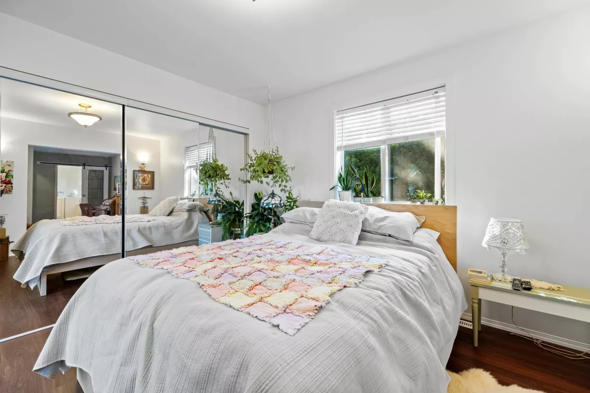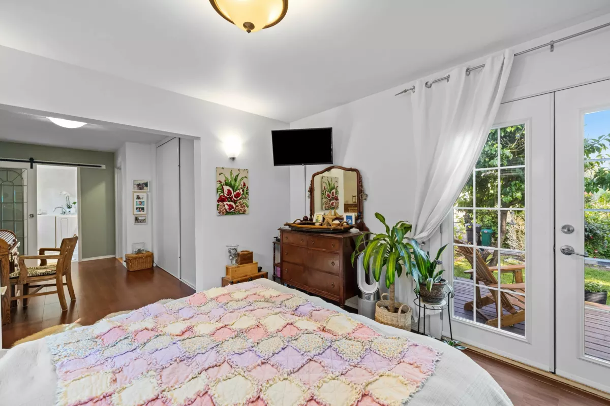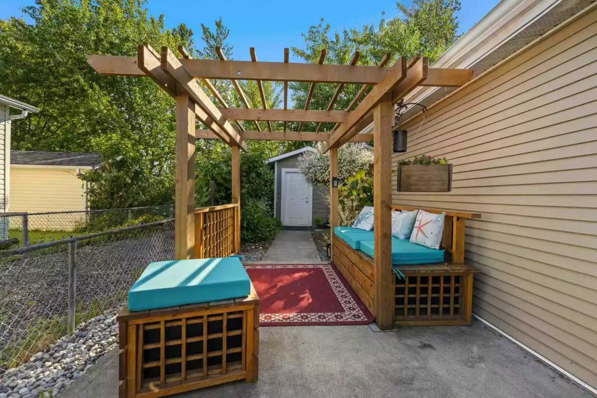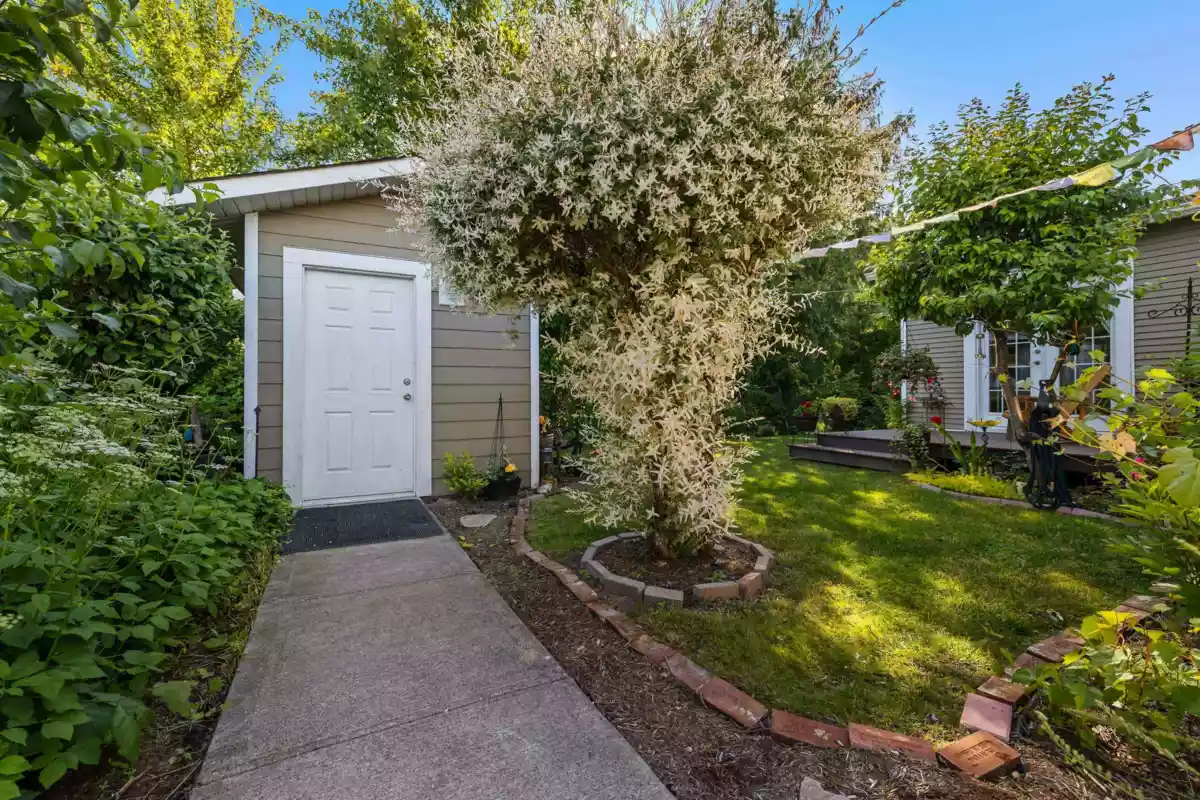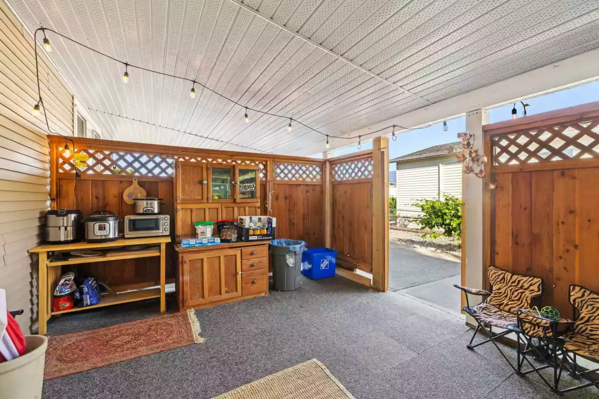 This spacious 2-bedroom, 2 bath modular home is one you don't want to miss. Over 1250 sqft of living space & many outdoor areas to enjoy. The home features, natural gas heating & stove, central A/C & recently upgraded plumbing. Impressive primary suite feature flex room & French doors to a private garden setting w/ sundeck. Fenced yard has bountiful fruit trees, established concord grape vine & newly built pergola. There is still more! Attached workshop, covered patio (currently set up as outdoor kitchen) & separate 7'5x 9'8 powered shed, Extra wide driveway w/ plenty of parking. Located in the desirable Rainbow Estates with Clubhouse & RV parking. EXCELLENT location w/ mountain views, tons of amenities nearby. Pad rent $495. Lease ext. 2072. Age restriction only 40 years young!