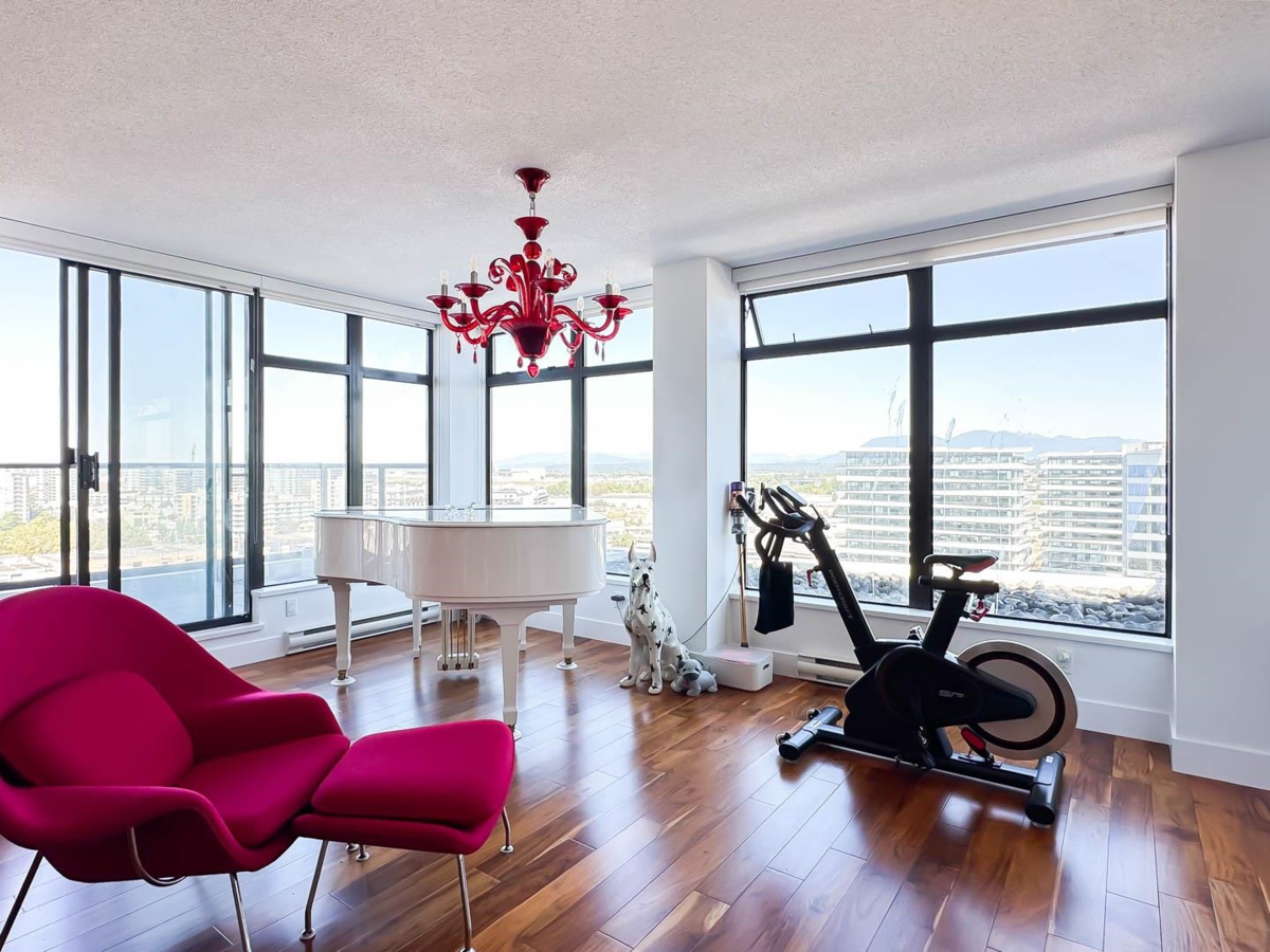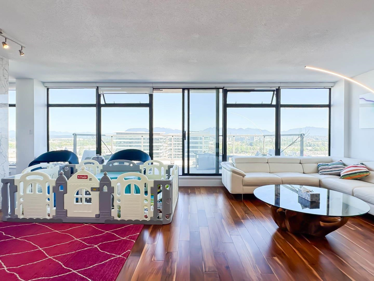 Acqua - Experience luxury living in this two-level Penthouse at the iconic Bosa-built Landmark building in Richmond. Spanning 2,493 sq ft, this rare gem offers breathtaking 180° panoramic views of the water and North Shore mountains, facing North, East, and West. Featuring 3 spacious bedrooms—all with ensuite baths—a large den, 3.5 bathrooms, a family room, and two-sided fireplace. Enjoy over 500 sq ft of private patio space. First-class amenities include pool, hot tub, steam room, gym, clubhouse, media room, and concierge. Comes with 2 side-by-side parking stalls and a storage locker. Prime location: steps to Richmond Centre, Canada Line, Price Smart, and Kwantlen University. It is a one of a kind layout that is hard to see elsewhere.