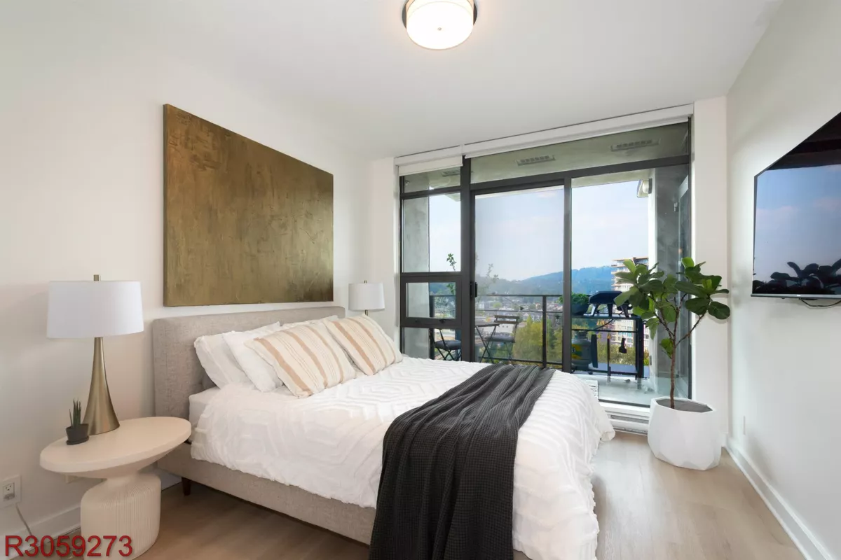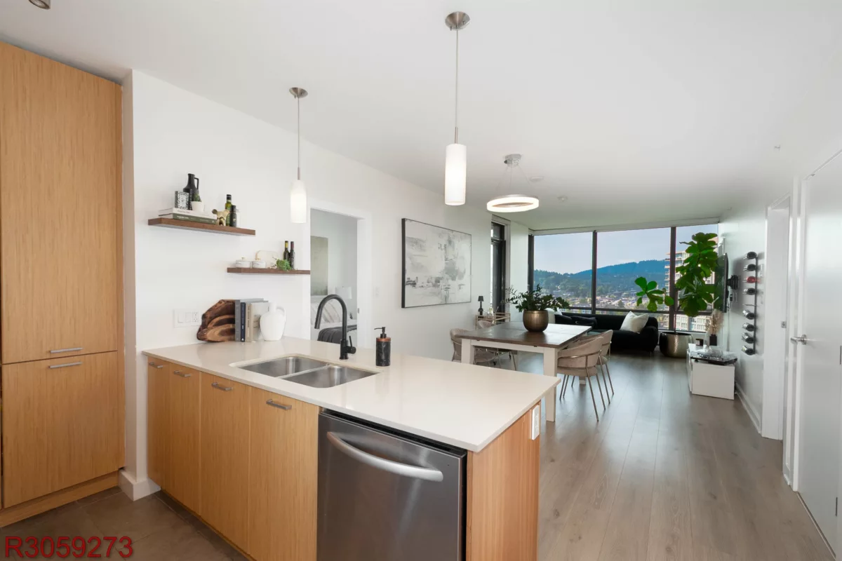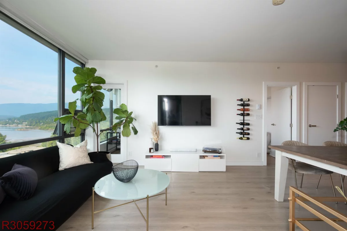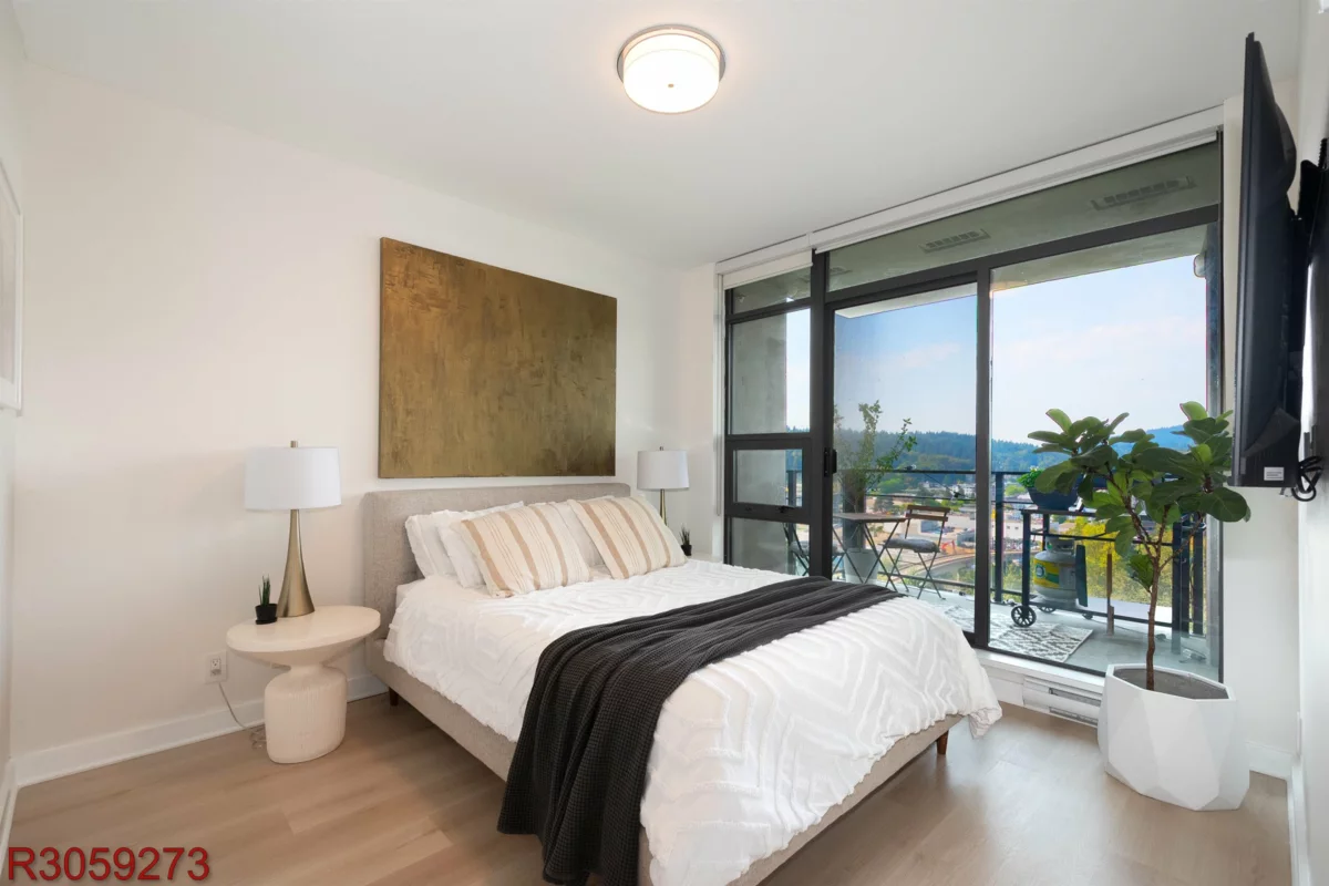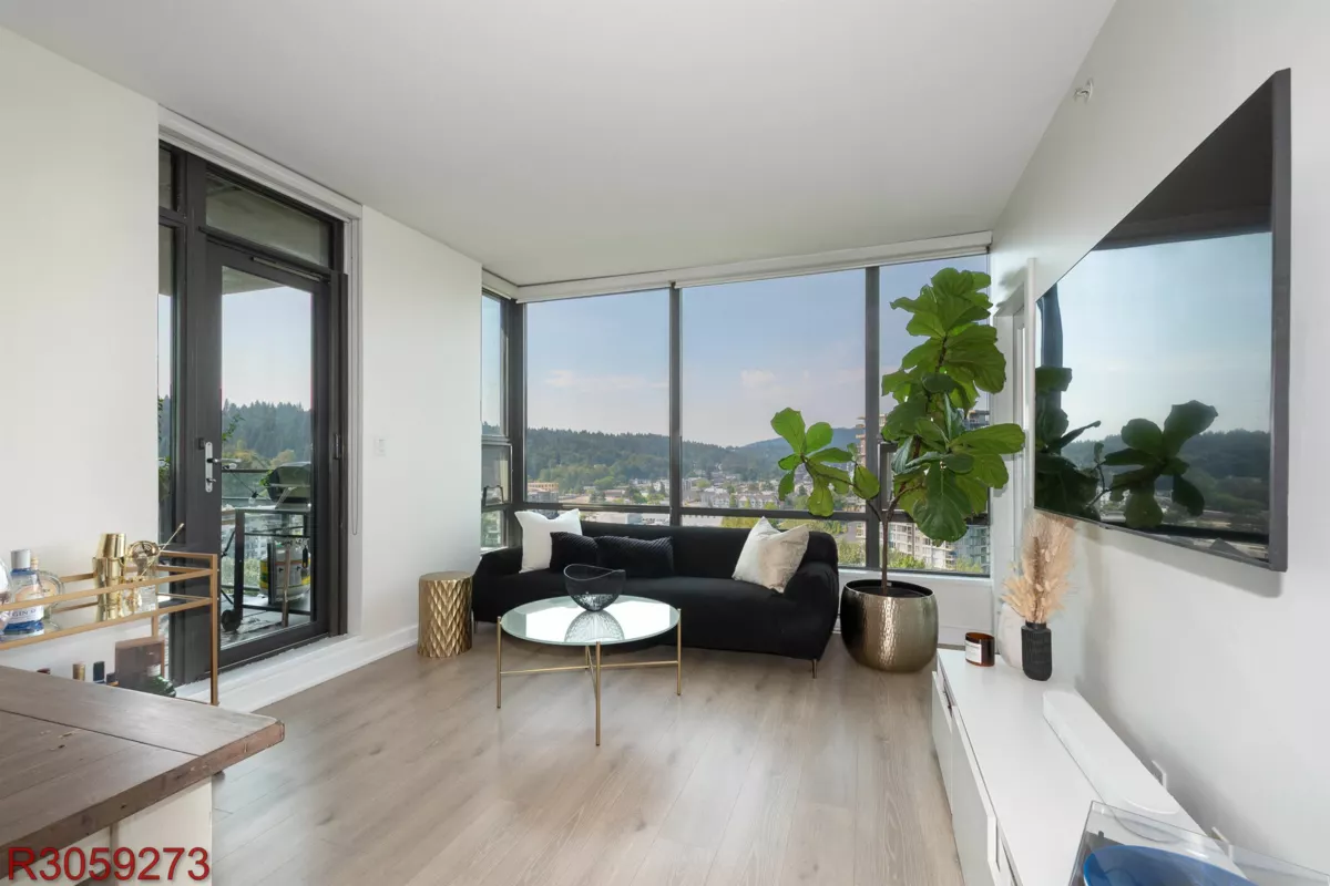 Enjoy panoramic WATER & MOUNTAIN views from this stylish 2 bdrm + den, 2 bath condo at The Residences in Suter Brook Village. With 955 sqft of modern open-concept living, it features floor-to-ceiling windows, hardwood floors, and separated bedrooms for privacy. The chef-inspired kitchen offers quartz counters, KitchenAid appliances, gas cooktop, tile backsplash, and plenty of cabinetry. Access 30,000+ sqft of exceptional amenities including a gym, yoga studio, sauna, media and party rooms, guest suites, tennis and basketball courts, dog park, and more. Steps to shops, cafés, dining, trails, and SkyTrain. Incredible opportunity—now priced to move! Comes with 2 parking spots and locker.
