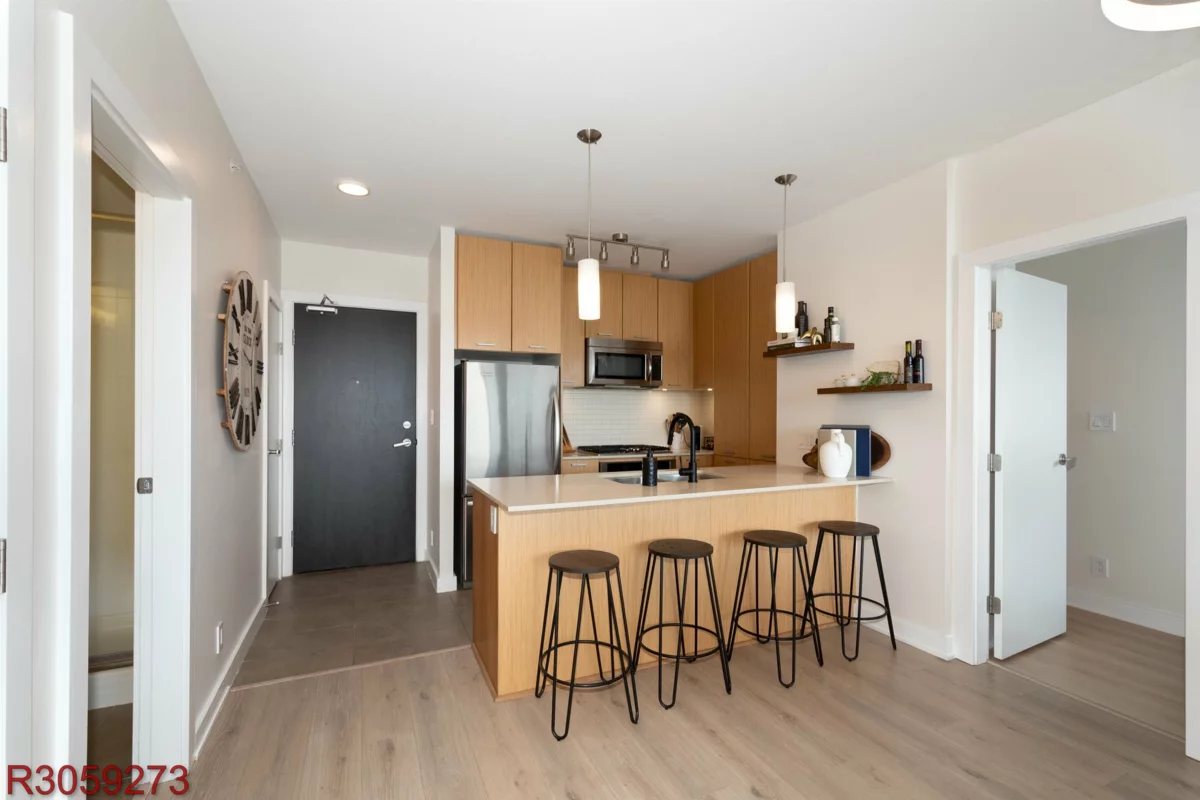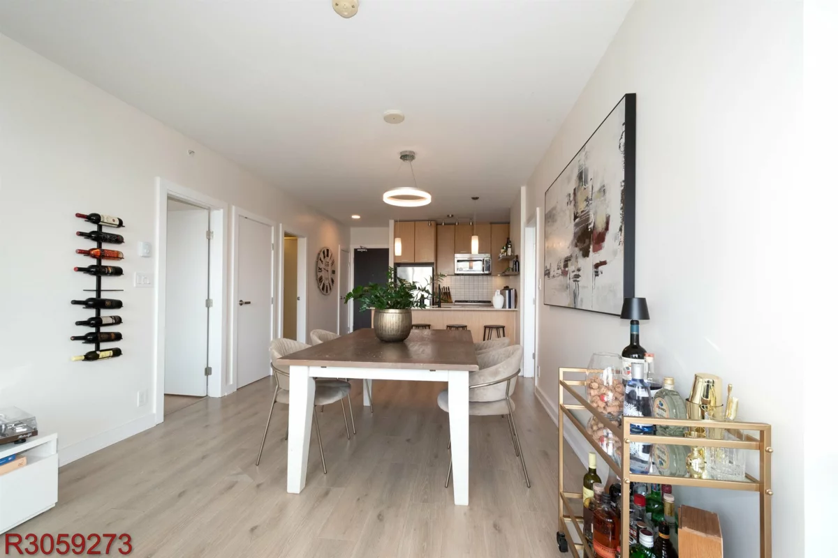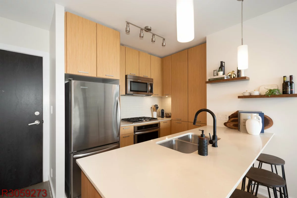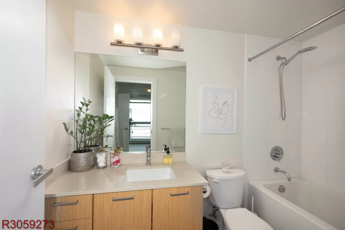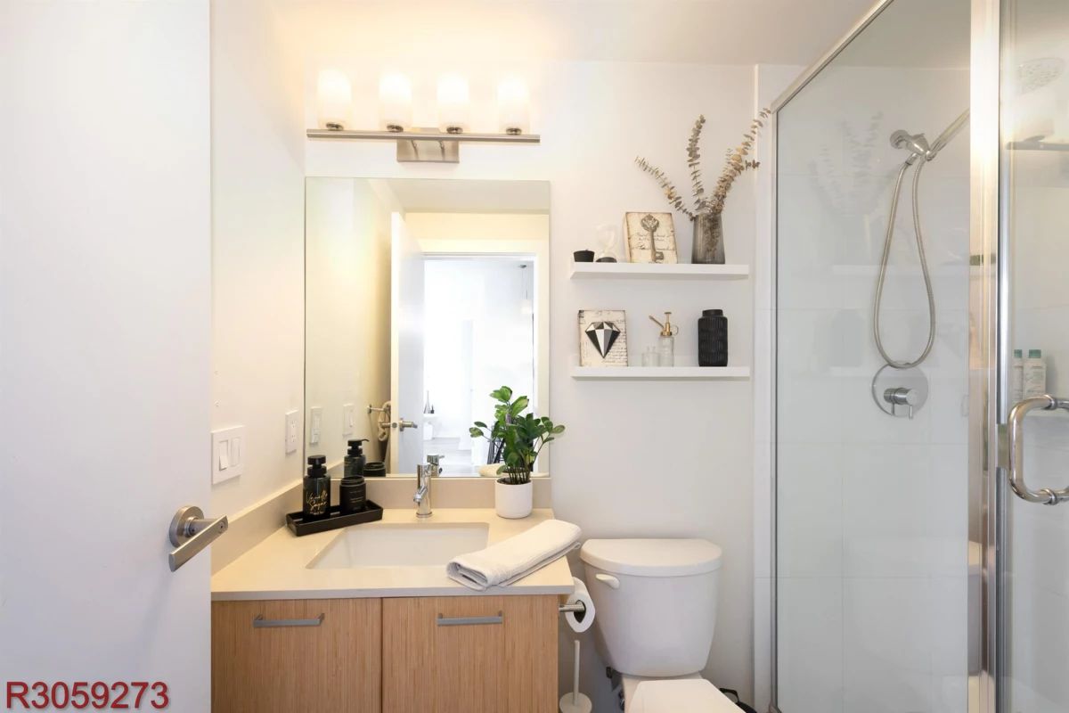 Enjoy panoramic WATER & MOUNTAIN views from this stylish 2 bdrm + den, 2 bath condo at The Residences in Suter Brook Village. With 955 sqft of modern open-concept living, it features floor-to-ceiling windows, hardwood floors, and separated bedrooms for privacy. The chef-inspired kitchen offers quartz counters, KitchenAid appliances, gas cooktop, tile backsplash, and plenty of cabinetry. Access 30,000+ sqft of exceptional amenities including a gym, yoga studio, sauna, media and party rooms, guest suites, tennis and basketball courts, dog park, and more. Steps to shops, cafés, dining, trails, and SkyTrain. Incredible opportunity—now priced to move! Comes with 2 parking spots and locker.