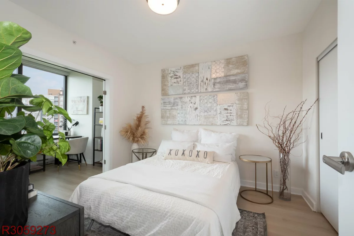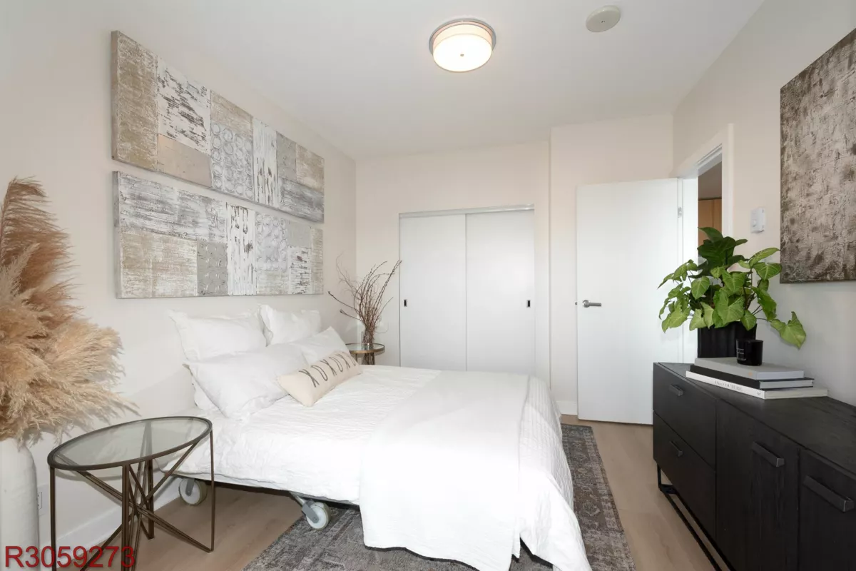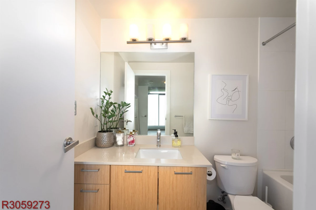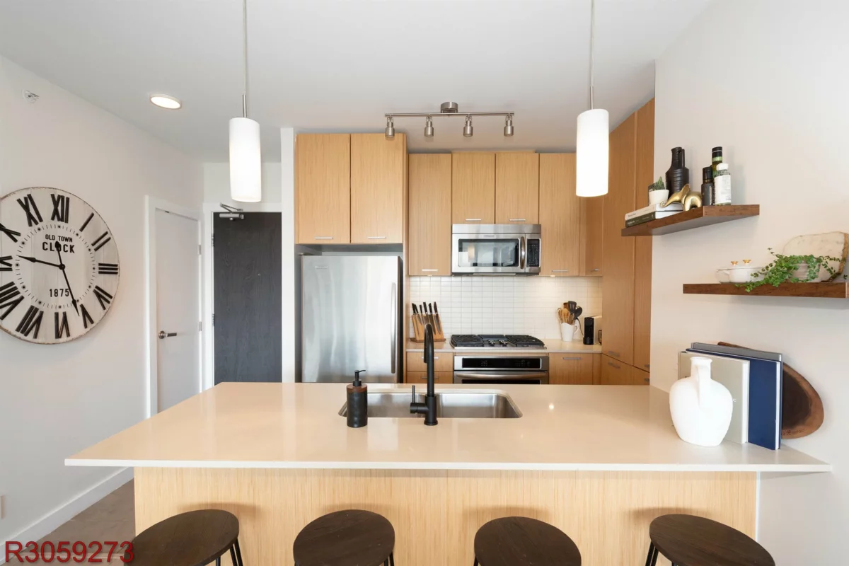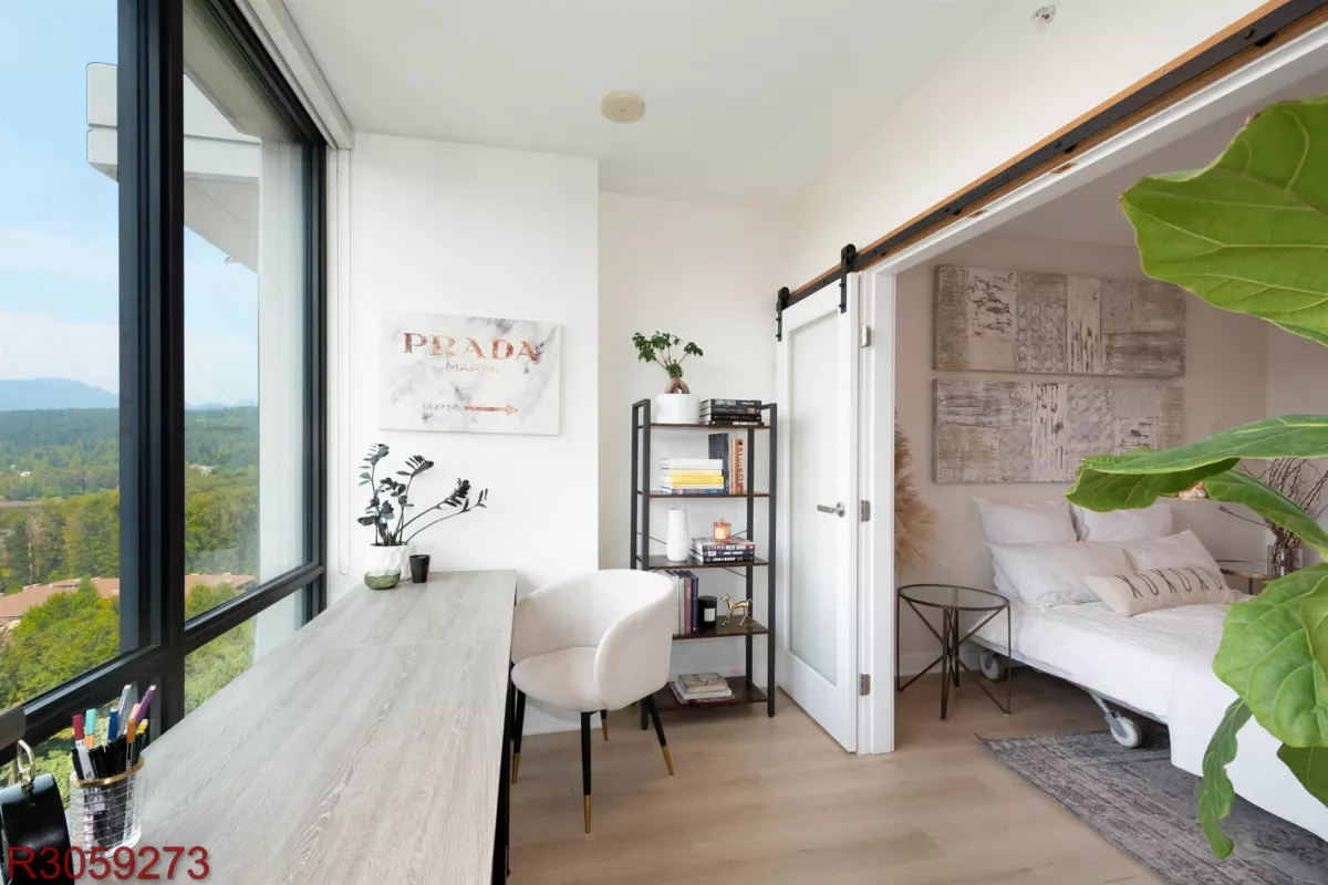 Enjoy panoramic WATER & MOUNTAIN views from this stylish 2 bdrm + den, 2 bath condo at The Residences in Suter Brook Village. With 955 sqft of modern open-concept living, it features floor-to-ceiling windows, hardwood floors, and separated bedrooms for privacy. The chef-inspired kitchen offers quartz counters, KitchenAid appliances, gas cooktop, tile backsplash, and plenty of cabinetry. Access 30,000+ sqft of exceptional amenities including a gym, yoga studio, sauna, media and party rooms, guest suites, tennis and basketball courts, dog park, and more. Steps to shops, cafés, dining, trails, and SkyTrain. Incredible opportunity—now priced to move! Comes with 2 parking spots and locker.