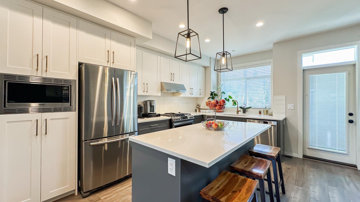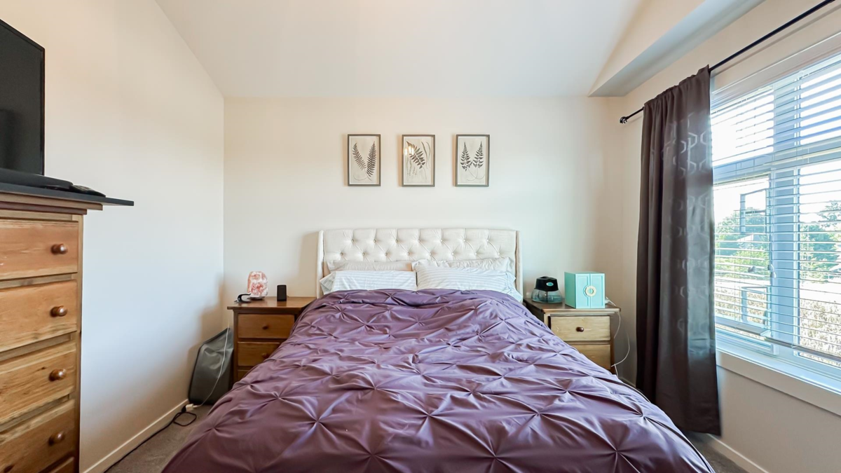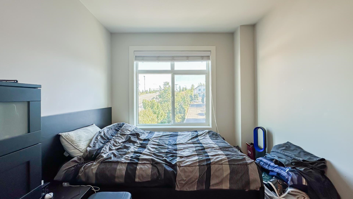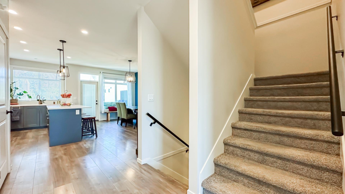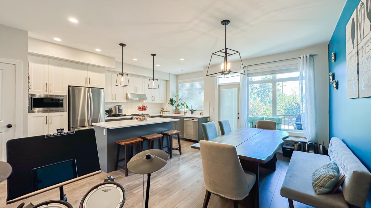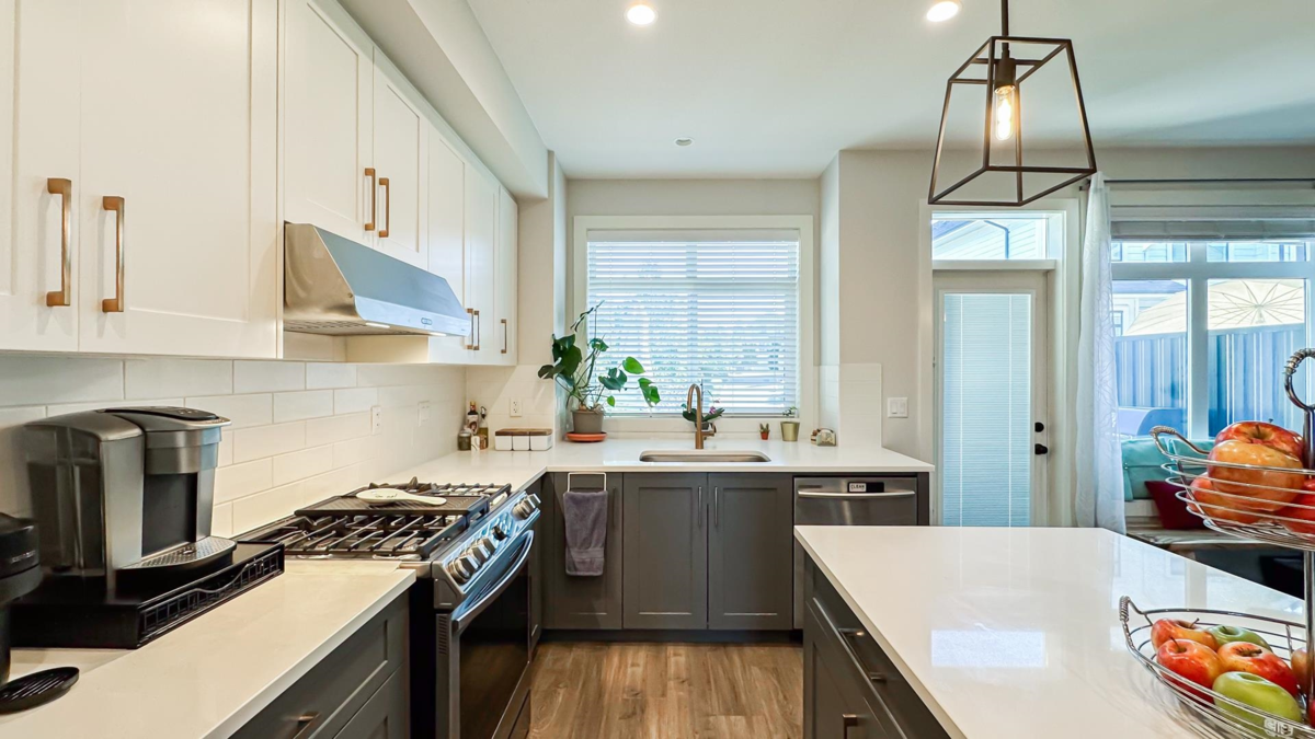 Corner unit! Modern 4 bed,4 bath Farmhouse-inspired design,almost 2,000 sqft of bright, modern living space.The main floor features open layout with 9' ceilings, oversized windows, & modern flr to ceiling white brick fplace. Kitchen is equipped w/ a large island, w-in pantry, quartz countertops, s/s appliances w/ soft close shaker style cabinets. The master bdrm has vaulted ceiling & chandelier + 2 gd sz bedrooms.Lower level has a 4th bdrm w/ ensuite full bath, storage room & mud room. Comfort features include a high-efficiency heat pump, on-demand hot water, Cen. A/C and spacious balcony with gas BBQ outlet.It has a side-by-side dbl car garage & 2 bikes storage w/ lots of extra storage space, EV ready! Snow capped mountain view in winter & the lavender fields in spring.Call now to view