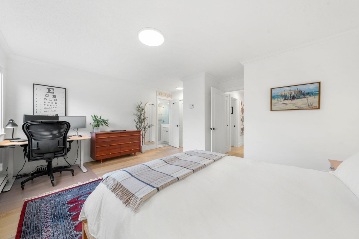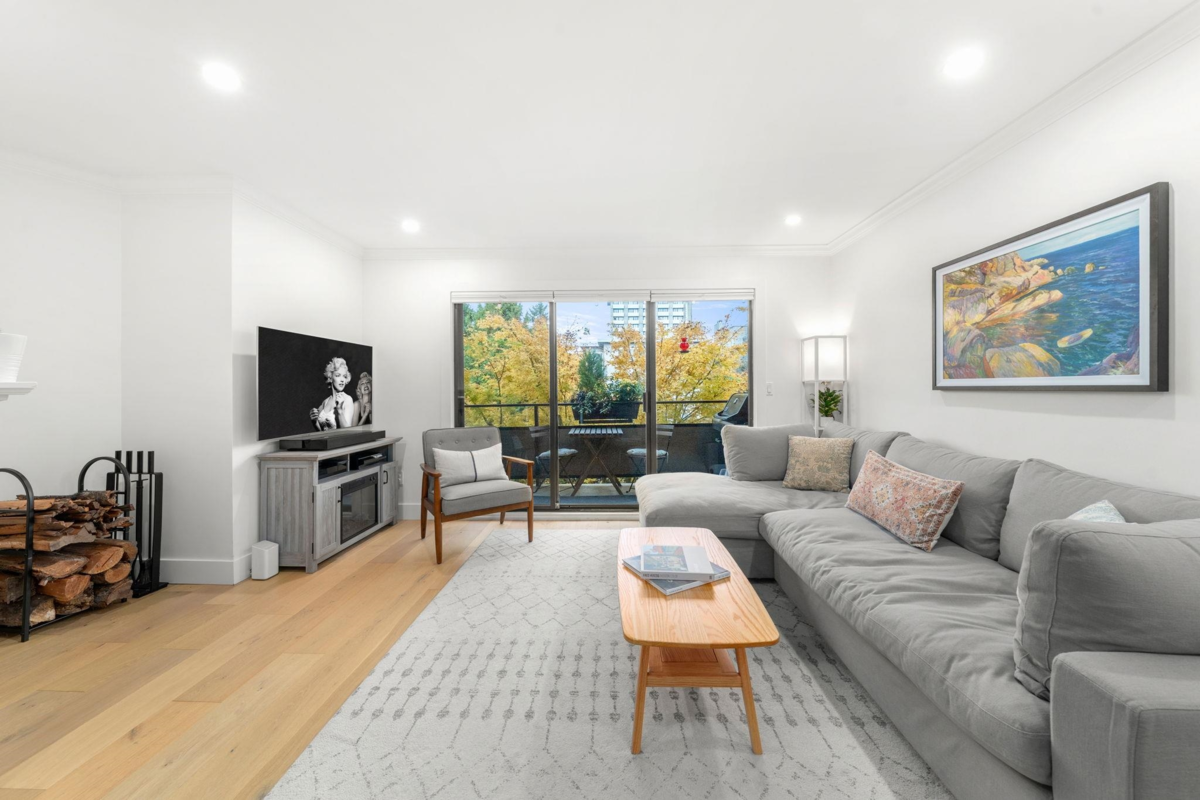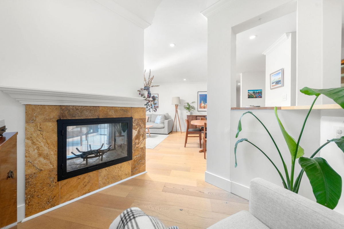 Boutique, 5 unit strata in a no fuss, easy maintenance building! Suite 201 occupies the entire front half of the floor, allowing for windows on 3 sides of the home. At nearly 1,200 sqft, there are zero compromises on space. The suite has been caringly updated & features wide plank Oak hardwood, updated lighting, blinds, paint & trim throughout. Enjoy open concept living & a large L shaped deck for summer evenings. Features include a dual-sided f/p, cozy den, & large updated kitchen with coffee bar area. The bedrooms are spacious, including a primary with dual closets & a full ensuite. Tons of in suite storage, plus 2 external lockers & 1 parking. Pets allowed & in suite laundry allowed w/ strata approval. Roof replaced 2025! Open house cancelled, private showings only.