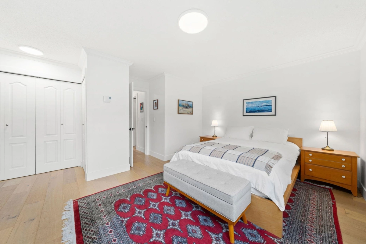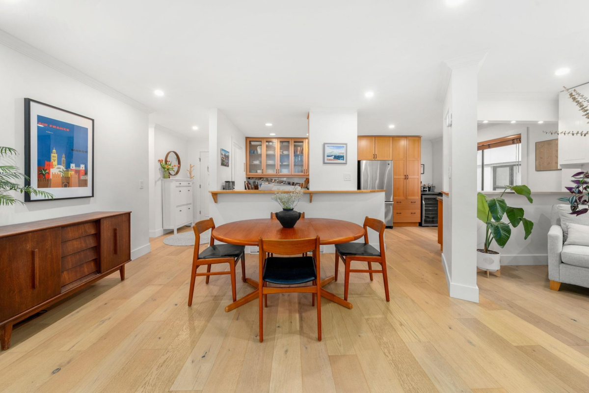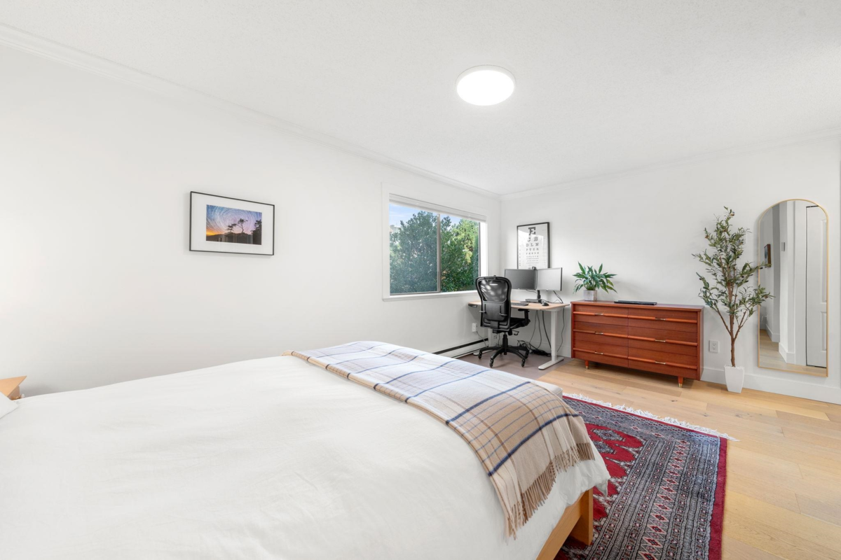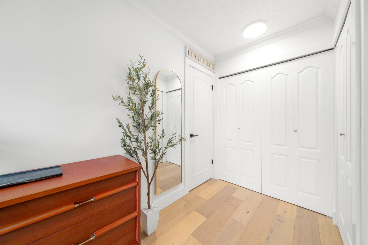 Boutique, 5 unit strata in a no fuss, easy maintenance building! Suite 201 occupies the entire front half of the floor, allowing for windows on 3 sides of the home. At nearly 1,200 sqft, there are zero compromises on space. The suite has been caringly updated & features wide plank Oak hardwood, updated lighting, blinds, paint & trim throughout. Enjoy open concept living & a large L shaped deck for summer evenings. Features include a dual-sided f/p, cozy den, & large updated kitchen with coffee bar area. The bedrooms are spacious, including a primary with dual closets & a full ensuite. Tons of in suite storage, plus 2 external lockers & 1 parking. Pets allowed & in suite laundry allowed w/ strata approval. Roof replaced 2025! Open house cancelled, private showings only.