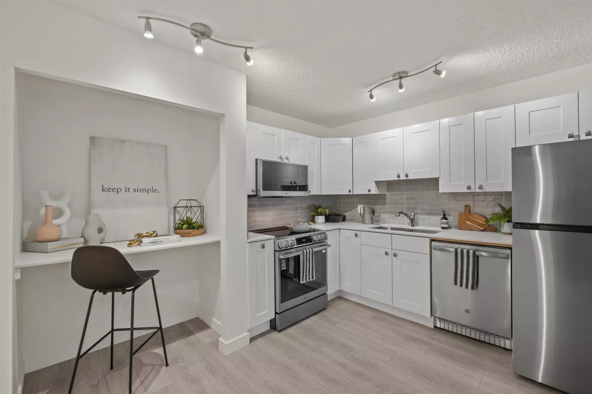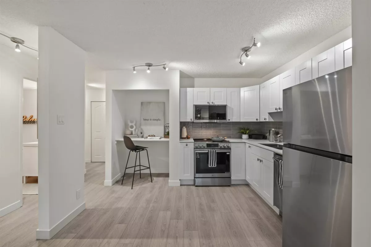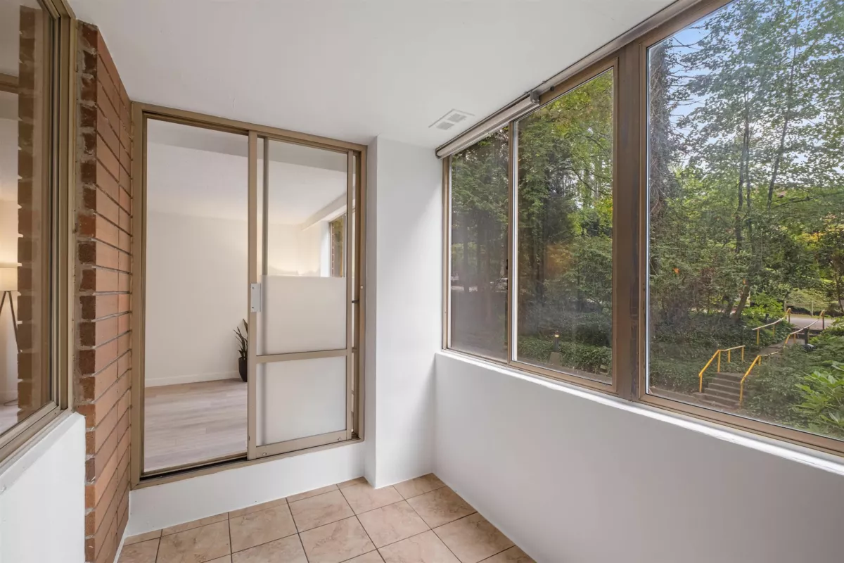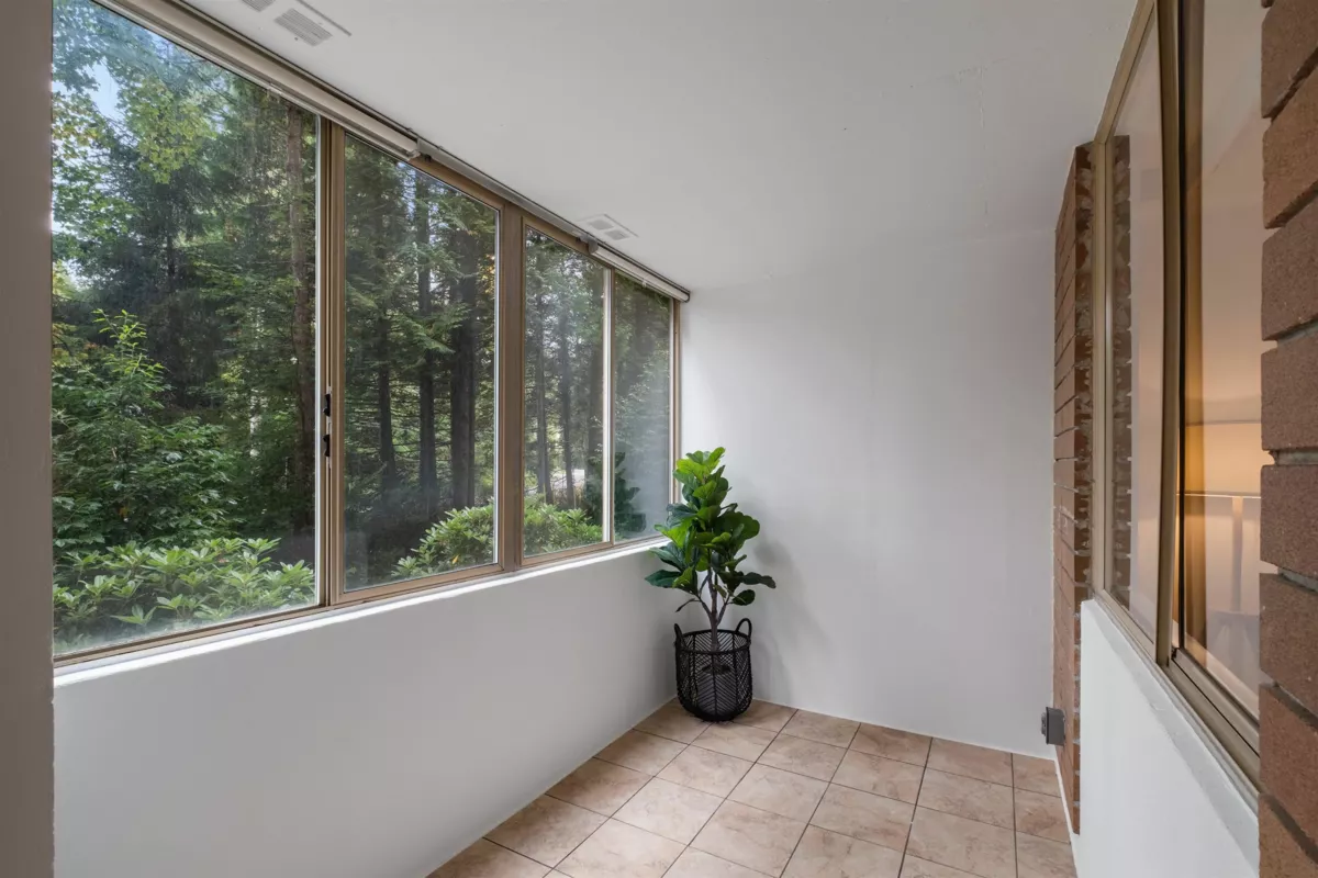 Become a part of the Woodcroft Estates Community with a wide range of amenities for every lifestyle, such as an indoor pool, hot tub, sauna, gym, library, activity rooms & workshop. Nestled under the cover of lush fir trees this quiet & peaceful 1 bed & flex is the perfect place to call home. The updated space has brand new water-resistant flooring throughout, new appliances, kitchen backsplash, fresh paint & more. The enclosed balcony offers the option of a den, solarium, workout space for a bike or yoga meditation, while the kitchen nook gives you the choice of a wine bar, extra kitchen prep space, an office nook, or more storage. Just a 5-minute walk to Lions Gate Village shops, community centre, & enhanced transit, makes this a fantastic opportunity to secure a home on the North Shore.