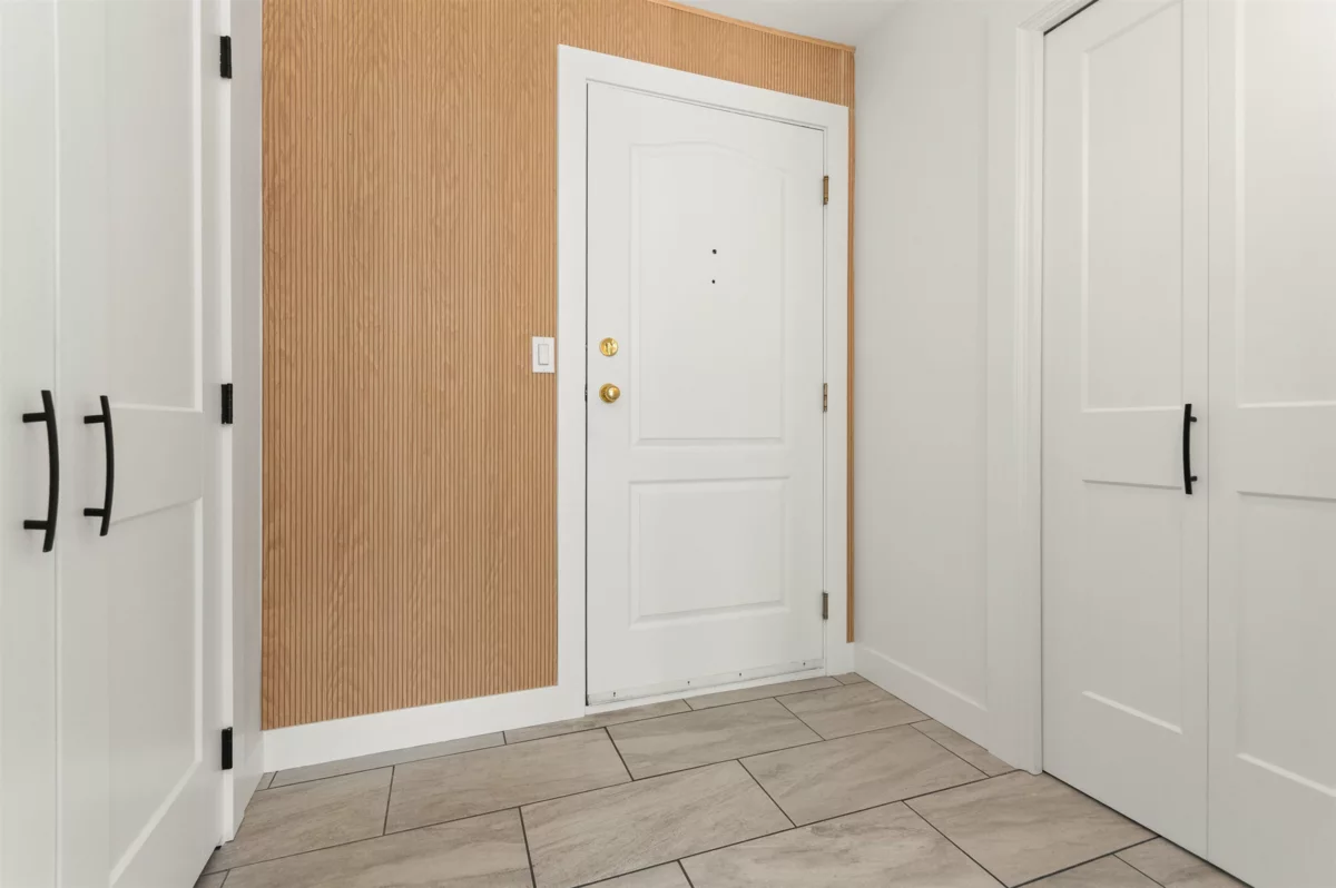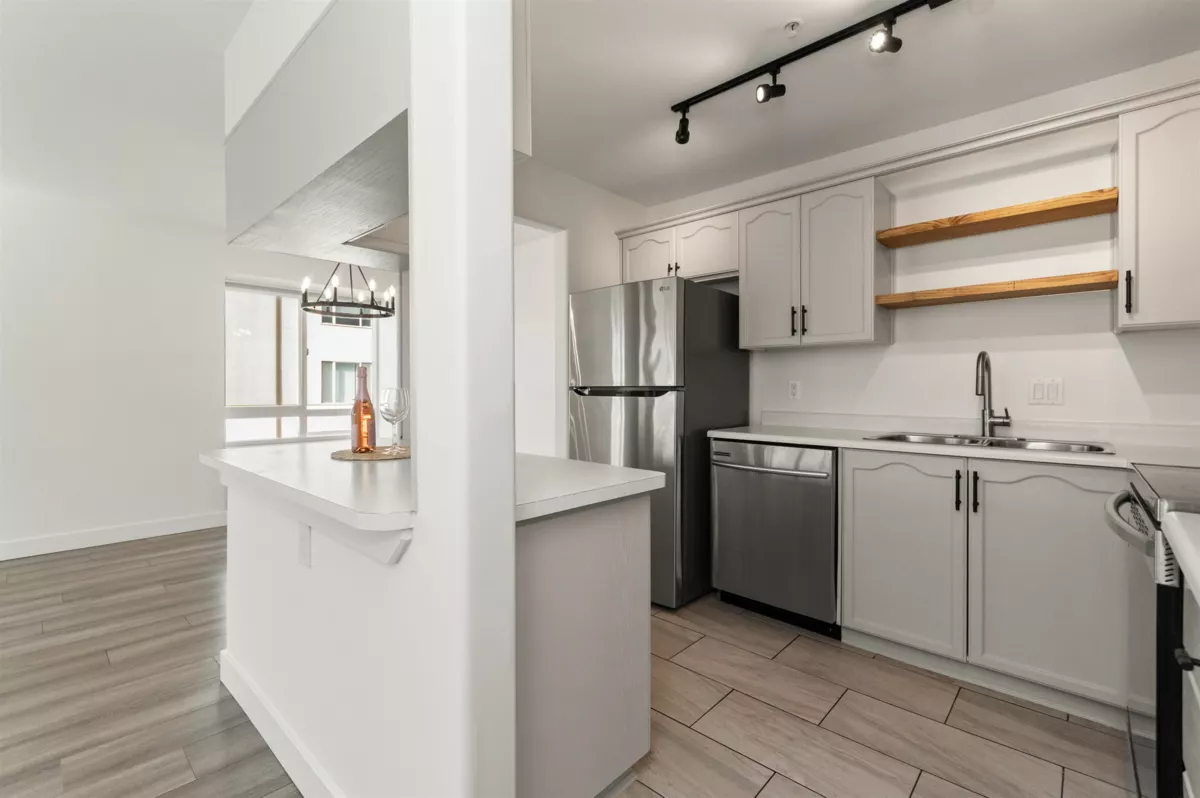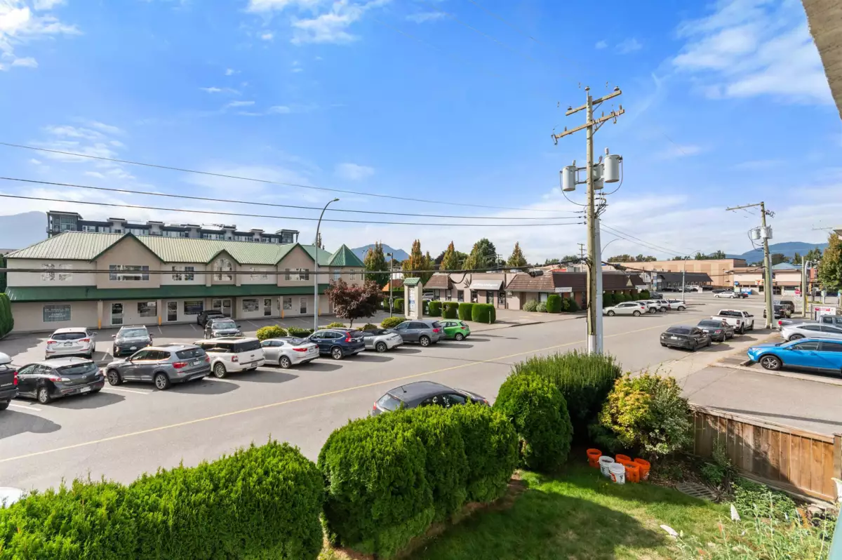 Fantastic Sardis location for this immaculate 2 bedroom CORNER unit. Recent updates include lighting, bathroom, fresh paint, trim, appliances, hot water tank, blinds, and flooring. Spacious layout with a oversized primary plus a second bedroom or office. Full sized in suite laundry with storage. Enjoy mountain views from the covered south facing balcony. Quiet, well maintained building - kids and pets welcome (dogs up to 15"). Walk to Sardis Park, shopping, dog park and restaurants. Perfect for first-time buyers, downsizers or investors!