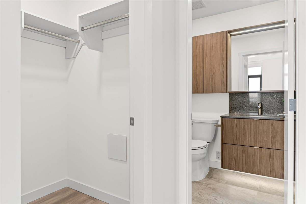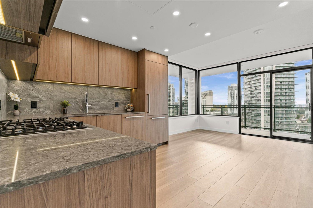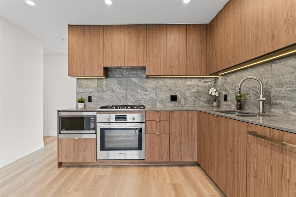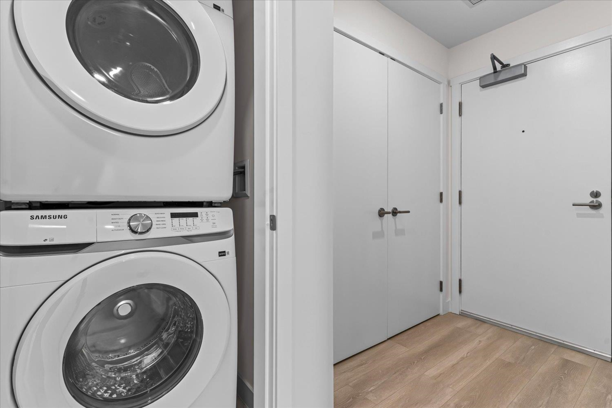 This 2-bedroom, 2-bathroom corner unit condo offers 734 sqft of bright, airy interior living space plus a 207 sqft wrap-around covered balcony—perfect for outdoor relaxation. The open-concept kitchen, living, and dining area features large windows and 9’ ceilings, filling the space with natural light. The primary bedroom includes a walk-in closet and ensuite, while the second bedroom is thoughtfully separated for added privacy. Additional features include a large front hall closet, stacked washer and dryer, storage locker, and an EV-ready parking stall. Ideally located just a 5-minute walk to shops, restaurants, the Burquitlam SkyTrain Station, trails, and more.