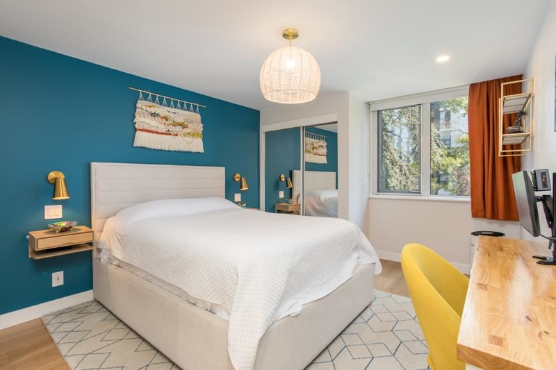Units like this do not come up often! Located in the heart of the West End, this professionally renovated 2-bed, 2-bath condo offers nearly 1,000 sf of thoughtfully reimagined living space. Every detail has been curated by a professional int designer and completed by expert contractors—stylish kitchen countertops, sleek new cabinetry, upgraded appliances, custom closets, spa-inspired baths, new drop ceiling and pot lights, updated hrdwood flooring throughout...no more renos needed! This home is ready for you! Step outside to your private, north-facing balcony—a quiet escape, nestled along this traffic-calmed, tree-lined street. Building updates include accessible ramp (2025), new windows / balcony doors (2019), pipes (2019), roof (2006). No dogs.