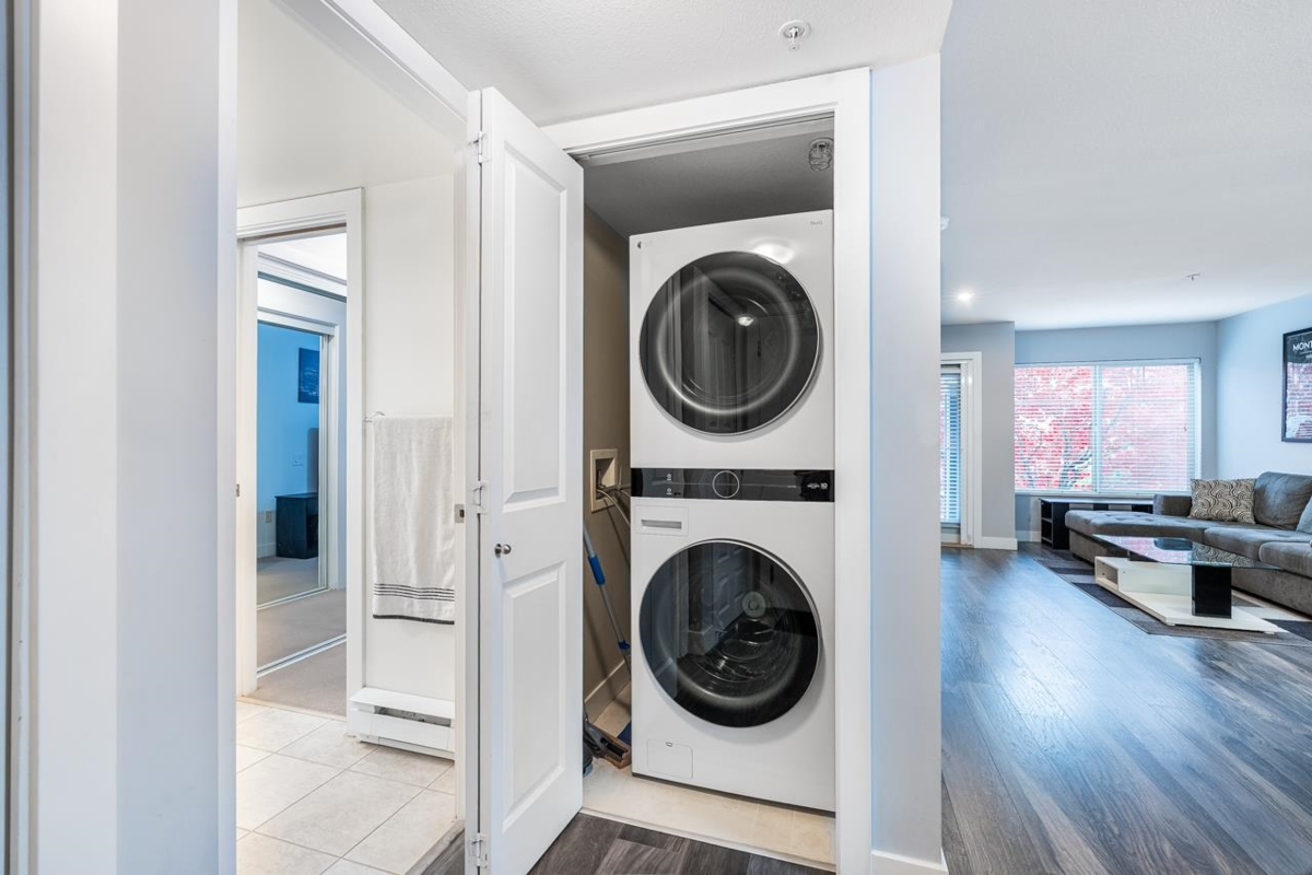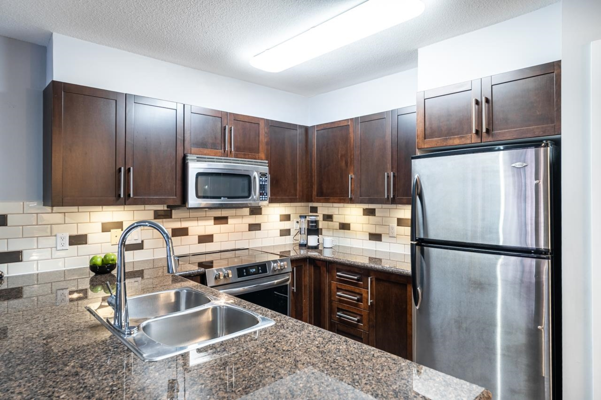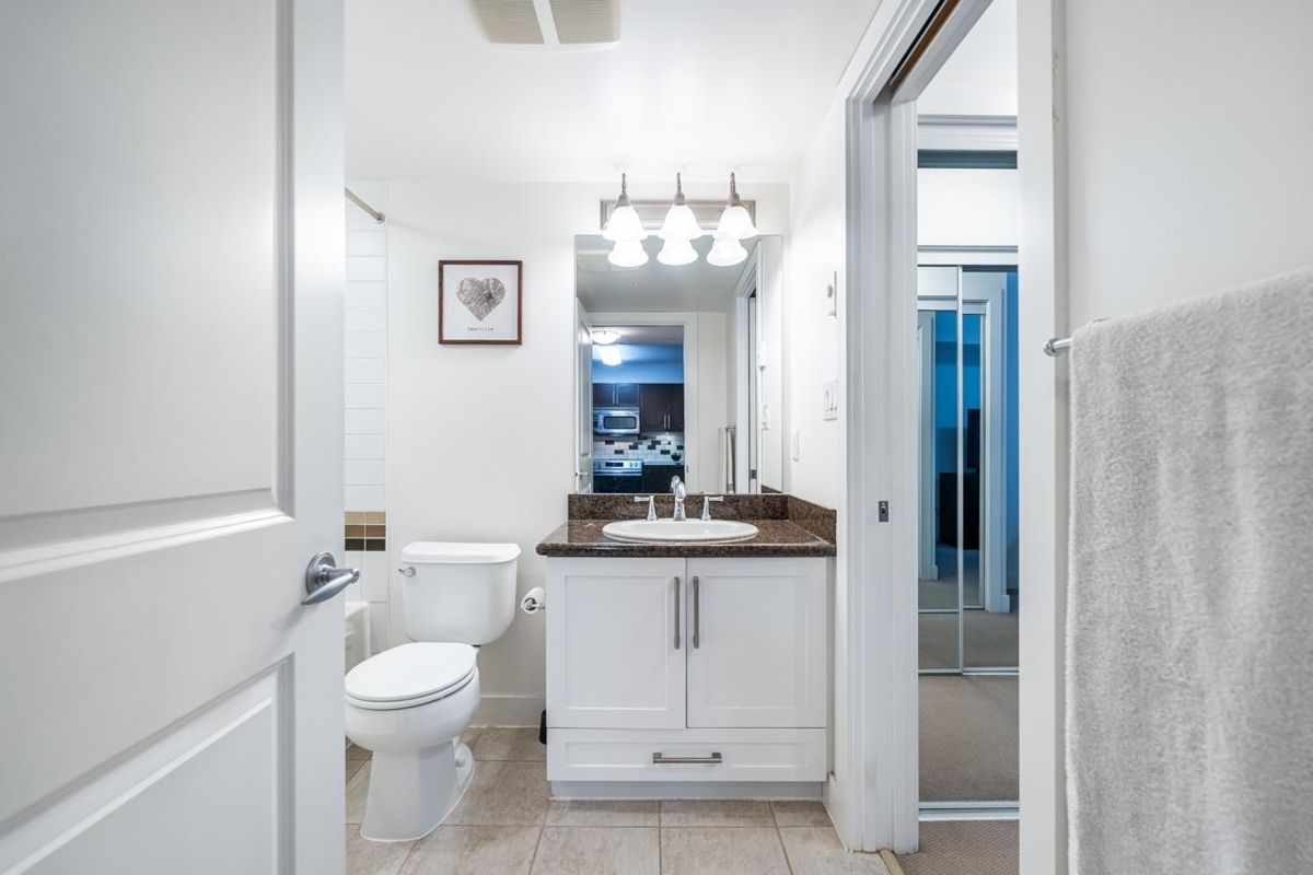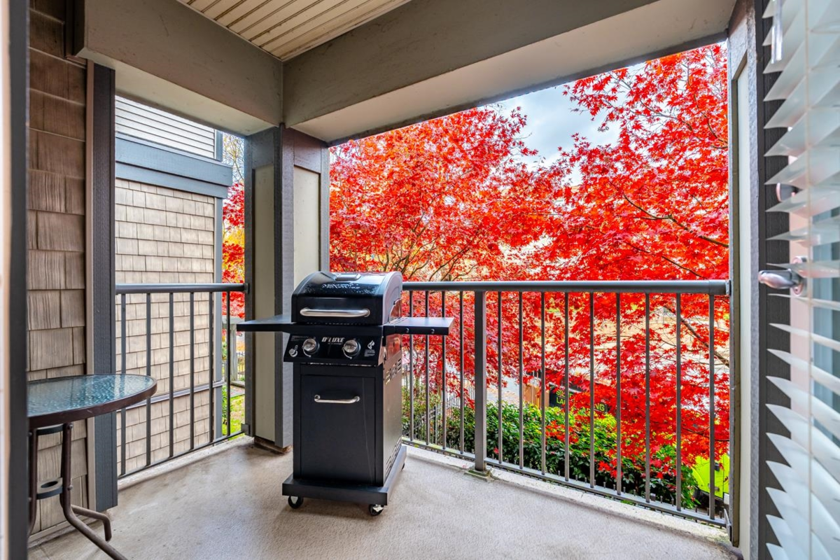Welcome to BORDEAUX! Located at the end of a quiet cul-de-sac & just STEPS to Gates Park! This spacious one bdrm home offers an open concept layout w/a large kitchen featuring granite counters, S/S appls, built-in MW & breakfast bar open to dining & living rm. Access the covered patio off the living rm; perfect for pets, morning coffee & outdoor entertaining! Primary bdrm has double closets and cheater ensuite w/granite countertops & deluxe tub. Immaculate condition w/tasteful neutral decor throughout. Well-maintained, pet-friendly bldg (2 pets, no size restrictions). Includes 1 parking and locker. Prime location near the Coq River, Patina Brewery, West Coast Express, schools, rec centre, shops, restaurants & easy access to Hwy 1 & Lougheed Hwy.