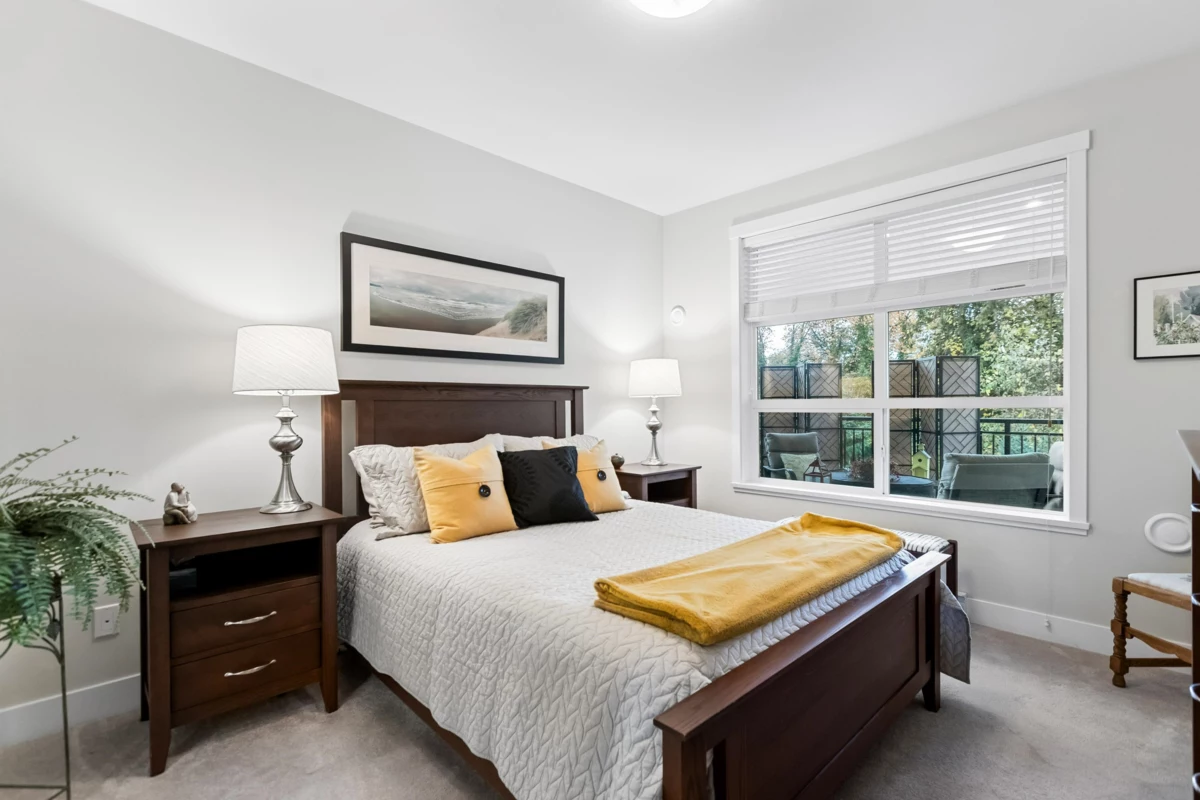 FALCON HOUSE by award winning Falcon Homes! Unsurpassed quality in one of Maple Ridge's premier condo developments, this is a RARE CORNER UNIT with stunning GREENBELT VIEW! This 2 bed/2 bath home offers over 1,100 sq ft of open concept living, highlighted by 9 foot ceilings, quality finishing & millwork, a luxury QUARTZ island kitchen w/ shaker cabinets, comfortable dining area & living space! Two large bedrooms both with greenbelt views, including the primary w/ full 4 piece dual sink ensuite & walk-in closet w/ organizers! Bonus entertainment sized 278 sq ft COVERED DECK w/ SOUTHWEST exposure for year round enjoyment! 2 parking stalls, storage, proactive strata & conveniently located to the amenities of downtown Maple Ridge - this is a downsizers dream & shows like new!