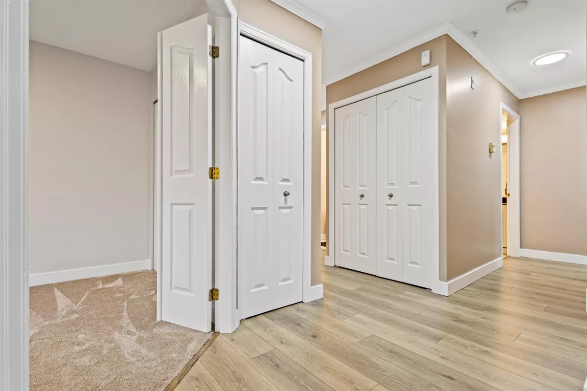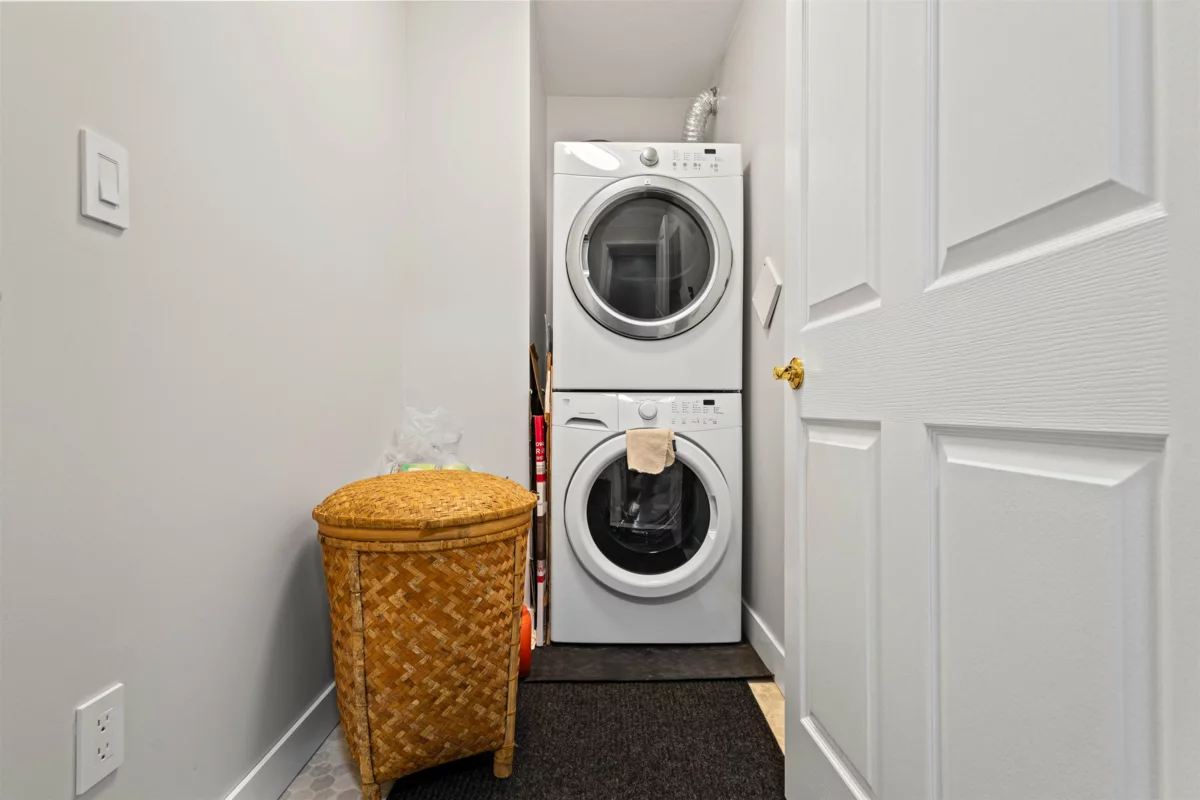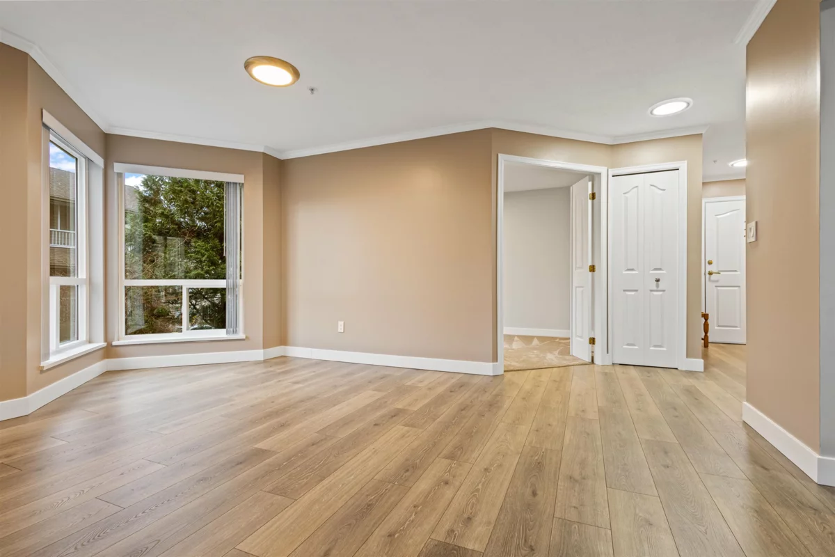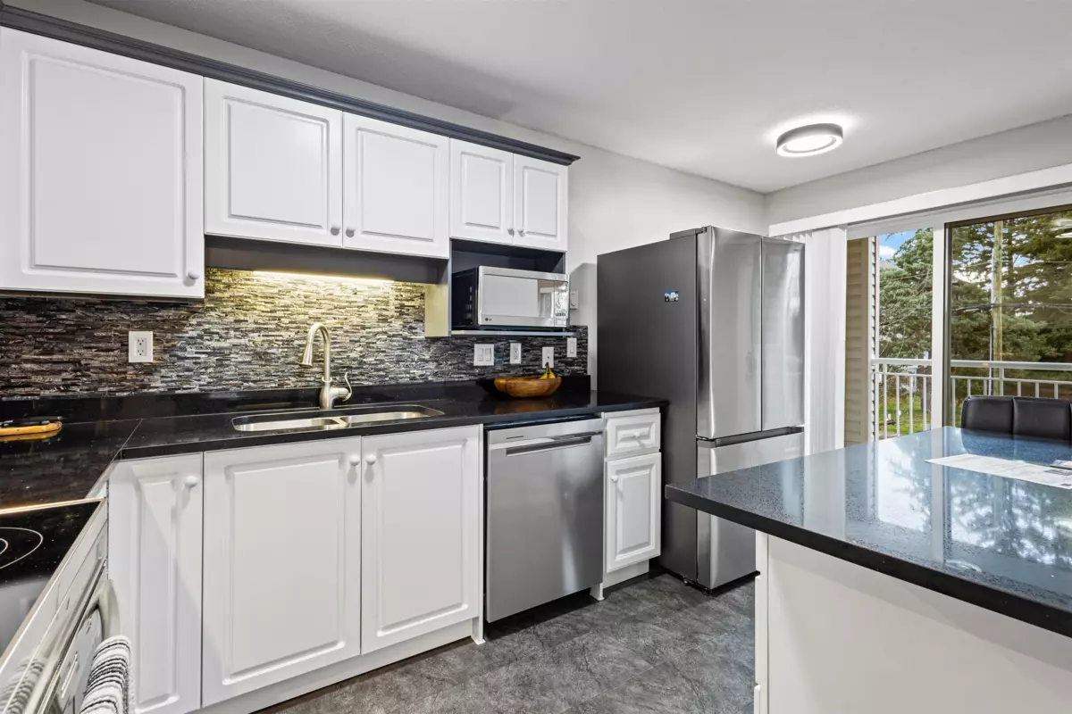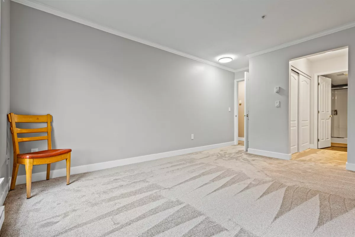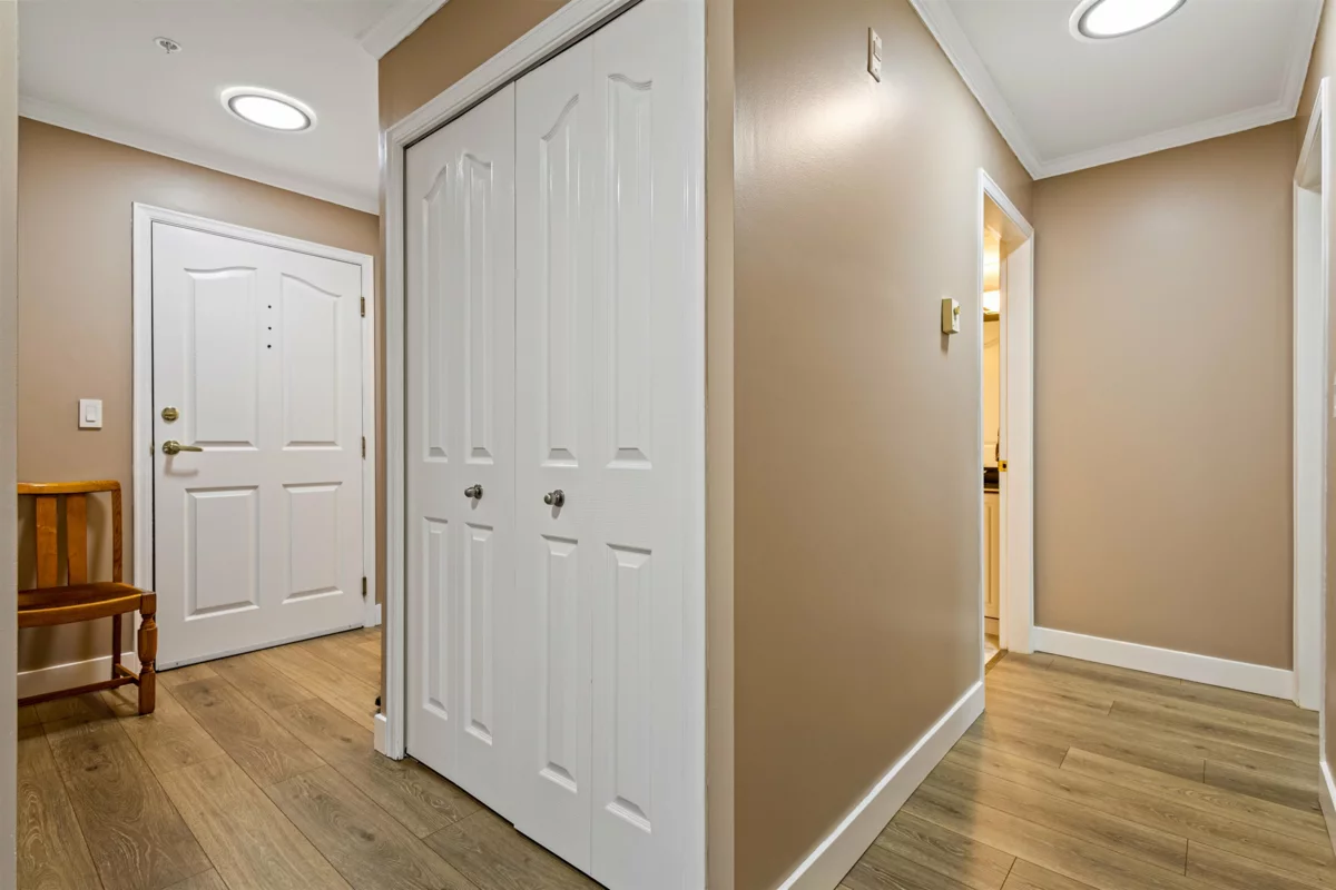 Welcome to this stunning 2-bedroom, 2-bath CORNER -UNIT offering over 1,000+ SQFT of modern luxury. Step into an open, airy space highlighted by 9 foot ceilings and an abundance of NATURAL LIGHT. Recently RENOVATED, this home features a sleek, contemporary kitchen with QUARTZ countertops, BRAND-NEW appliances. Both bedrooms and bathrooms have been meticulously upgraded with high-end finishes with CROWN MOULDING, ensuring comfort and style in every detail. Heating with Natural Gas is INCLUDED in strata fees. Located in a prime area next to CITY HALL, PUBLIC LIBRARY, TRANSIT, MRC REC CENTRE, ALL 3 LEVELS OF SCHOOLS. You'll enjoy convenience, charm, and a vibrant community at your doorstep.
