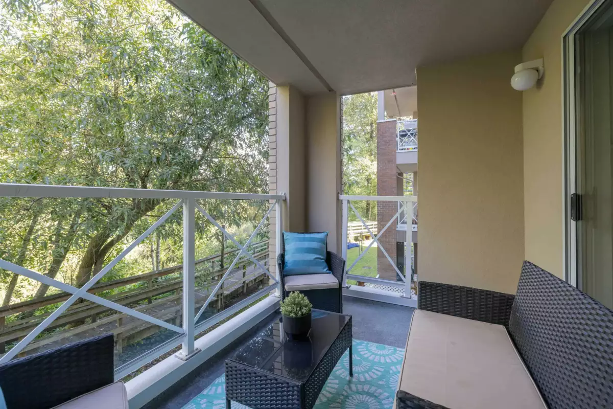 Welcome to The Crescent! This stunning 2 bed, 2 bath condo boasts a bright, spacious floorplan and gorgeous scenery out every window. Updated open-concept kitchen has stainless steel appliances and a large island. Primary bedroom is equipped with a gorgeous (full) ensuite and walk-in closet. Second bedroom is generously sized with sliding door to patio where you can enjoy lush green views and birds singing. Building amenities include a bicycle room, gym, sauna, club house with a full kitchen, games room and library. Additional features include 2 secured parking stalls, a storage locker on the same floor, ample visitor parking. Located walking distance to Gates Park, Traboulay Trail along the Coquitlam River, downtown Poco shopping, the new Poco Community/Rec Centre and transit. Call today!