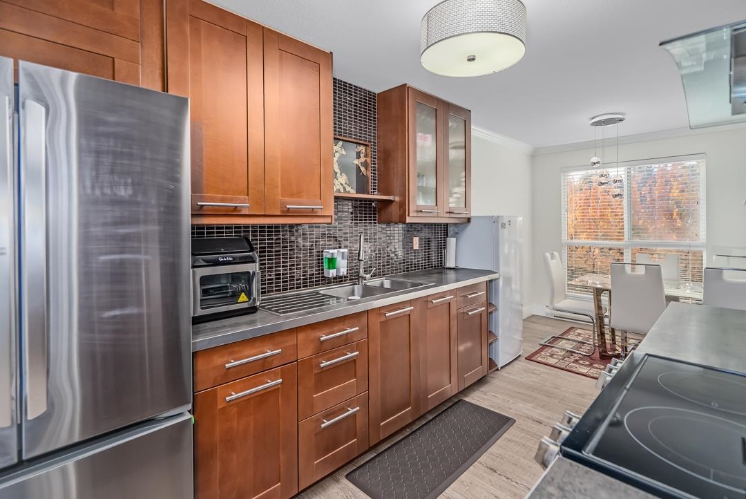 Beautiful, bright, & centrally located! This stunning 2-bedroom, 2-bathroom corner unit offers 1,187 sq. ft. of open & airy living space with a wraparound balcony perfect for relaxing or entertaining. The open & bright layout features extra-large windows that fill the home with natural light & fresh air. Enjoy the modern upgraded kitchen and bathrooms,with functional design ideal for everyday living. The spacious bedrooms provide comfort & privacy, making this the perfect home for families, professionals, or anyone seeking style & convenience. Located just steps from Guildford Mall, the library, T&T, public transit, restaurants, & recreation, with easy access to Highway 1, Pattullo Bridge, and Highway 91. Two parking stalls, storage locker & new roof (2018).