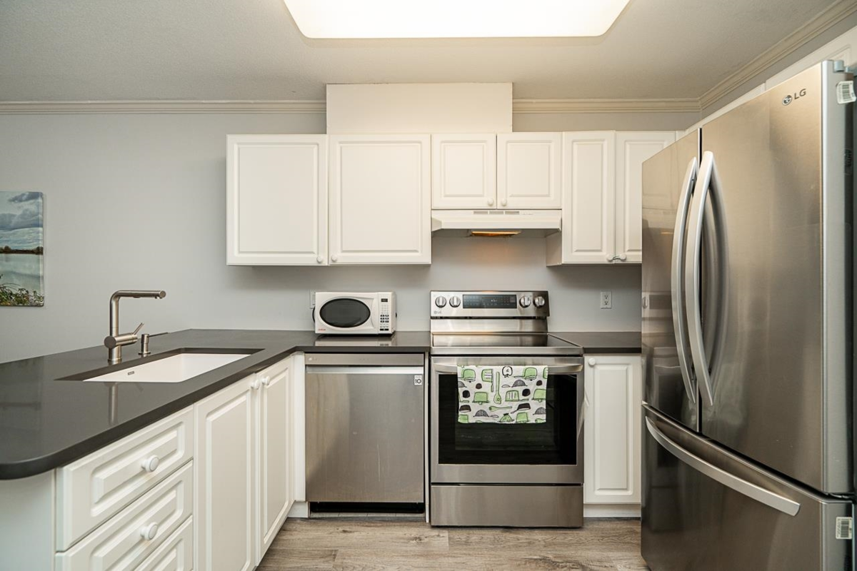 Welcome to the sought after Waterside! This is an affordable, quiet 1 bedroom corner unit which features an efficient floorplan, comes with a secured parking and low strata fee. This unit has many updates including quartz counter tops, under mount sink, stainless steel appliances, new washer / dryer, laminate floors, updated bathroom with a gorgeous shower and more. The building has well equipped recreation facility and many visitor parking spots. Various upgrades to the complex in recent years including the long lasting metal roofing. Conveniently located within walking distance to the popular dyke trails, schools, restaurants, T&T supermarket and a short drive to the YVR and all the amenities Richmond has to offer.
