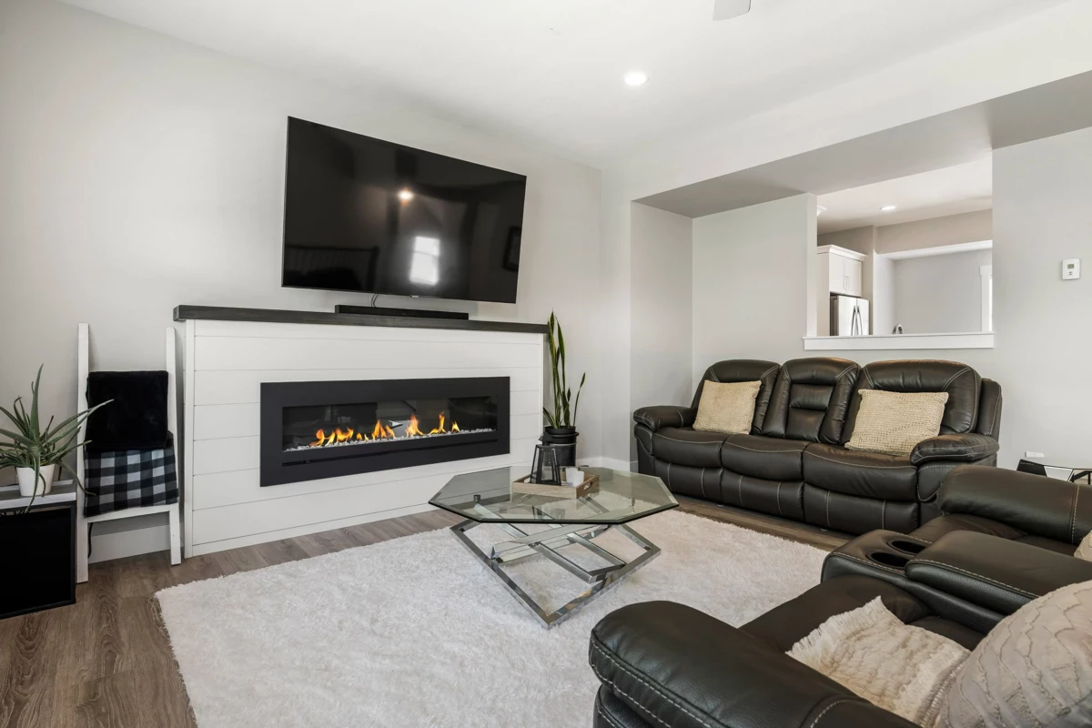 IMMACULATE move-in ready 3-BDRM END UNIT townhome w/TRIPLE GARAGE & one of the LARGEST YARDS in the complex! Room for your toys, kids, & pets—this home has space for it all! The open-concept main floor stuns w/shaker cabinets, quartz counters, gas hookup (upgrade to gas avail) & SS appliances. Host family dinners in the spacious dining area w/BREATHTAKING mtn views. Relax in the HUGE living room with f/p, opening to a patio complete w/gas BBQ hookup. Upgraded R20 insulation for the shared wall-great for privacy! Upstairs features 3 bedrooms, including a luxurious primary suite w/W.I.C & 4 pc ensuite w/ double sinks. Lower level is garage and storage—tons of potential for a rec room! Walk to the lake, shops & more! PERFECT home for growing families, outdoor lovers, & those who want it all!