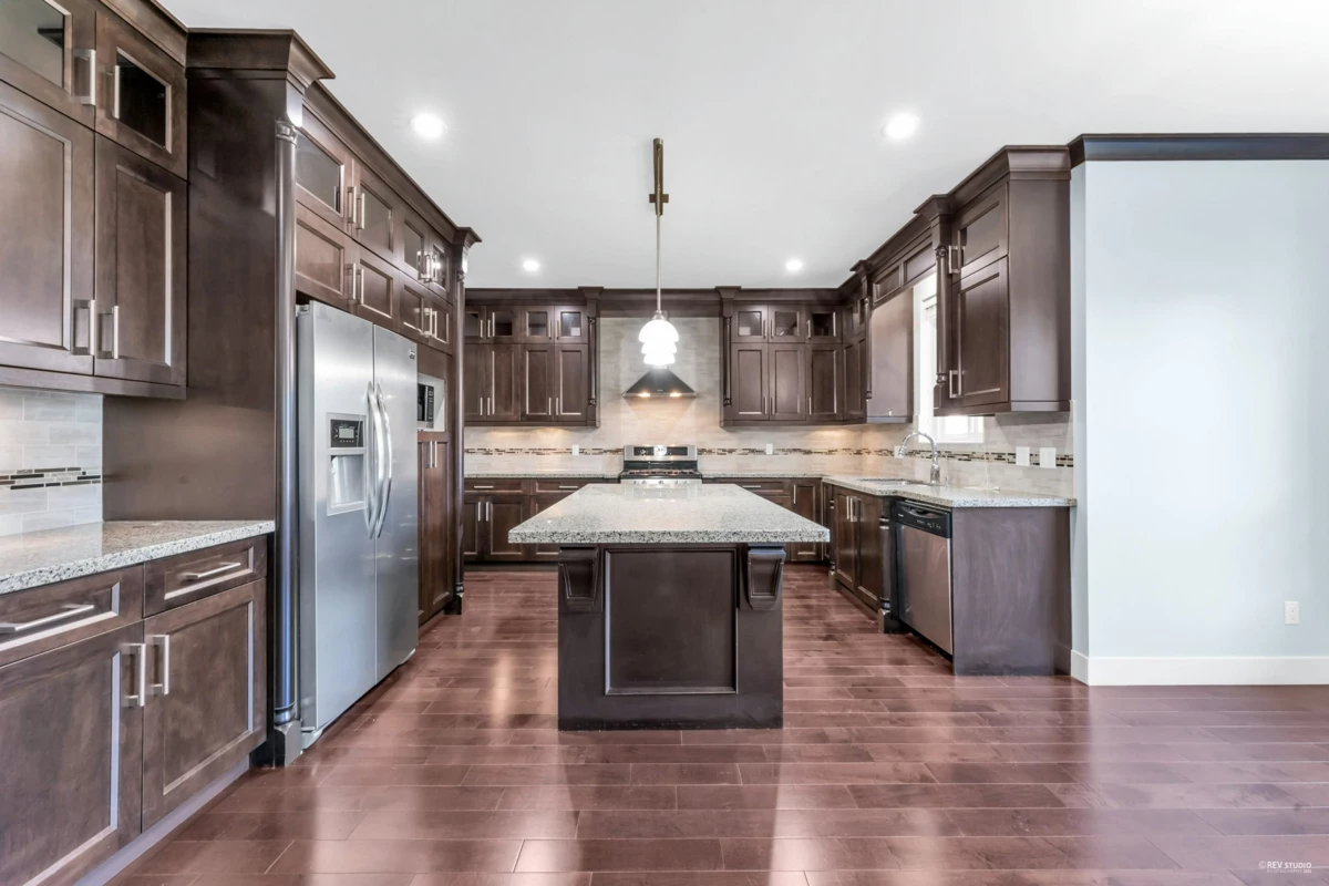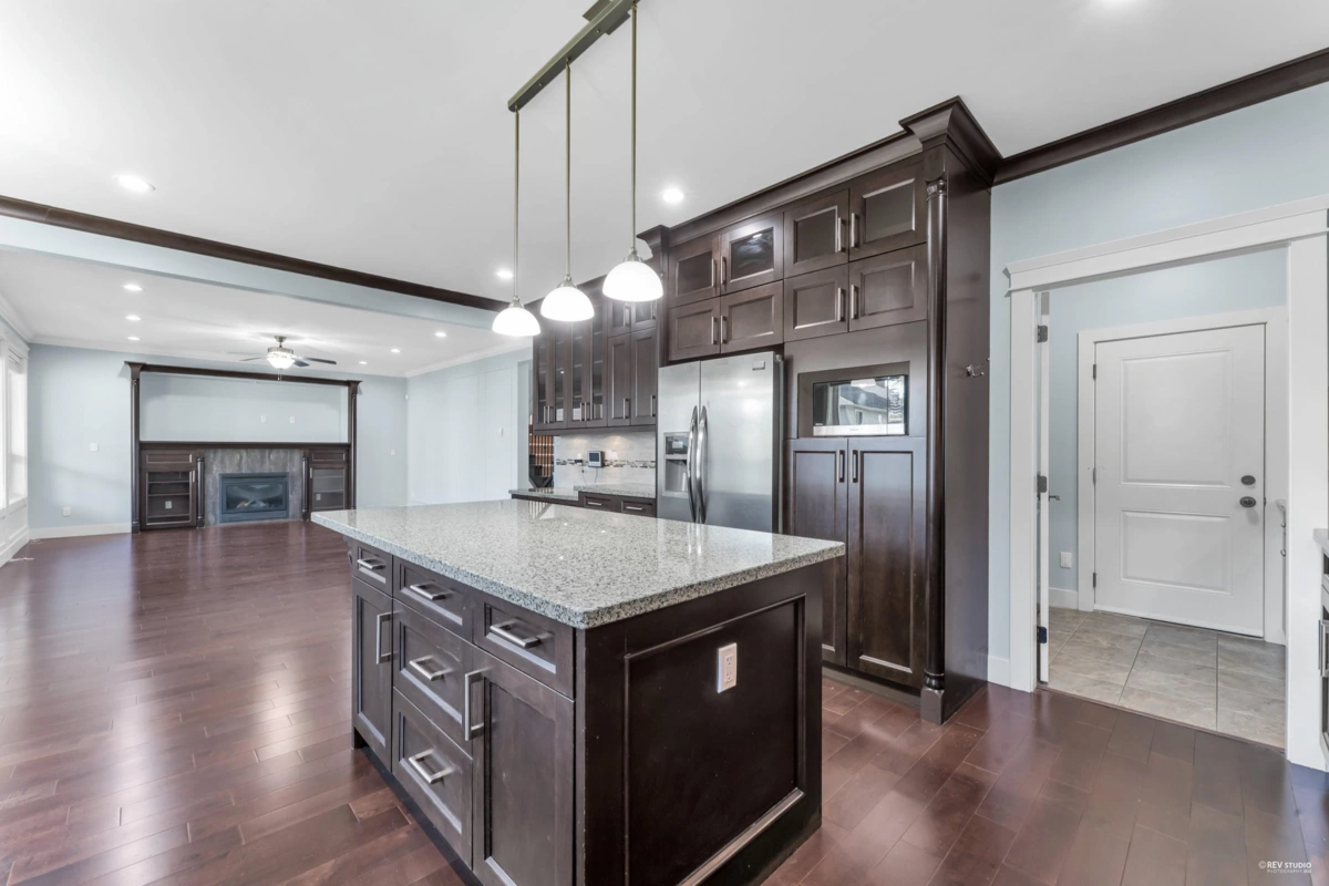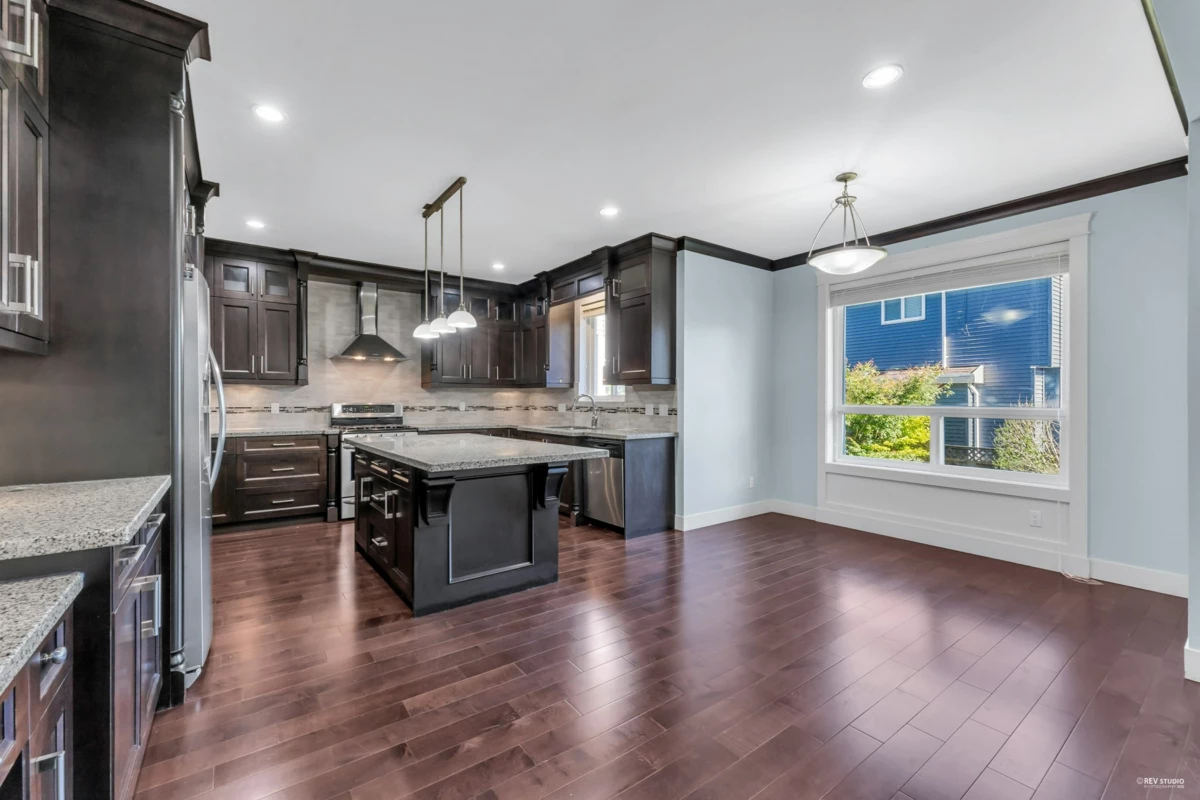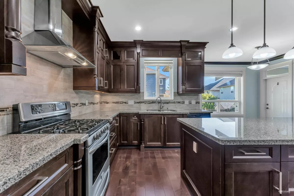 Luxurious home in Yorkson South! Featuring a gourmet kitchen with granite counters, large island with built-in drawers, custom maple cabinets, S/S appliances & gas stove. Main floor offers a spacious office/living space with wainscoting, plus a bright family room with gas fireplace, custom built-ins & engineered hardwood floors. Upstairs includes a primary suite with walk-in closet & organizers, ensuite with jacuzzi tub, granite counters, maple cabinets, separate showers & mountain views. Radiant heat, designer lighting & crown mouldings throughout the top two floors. Basement includes media room & 2-bed legal suite with new laminate flooring. Close to Lynn Fripps Elementary, parks & shopping.