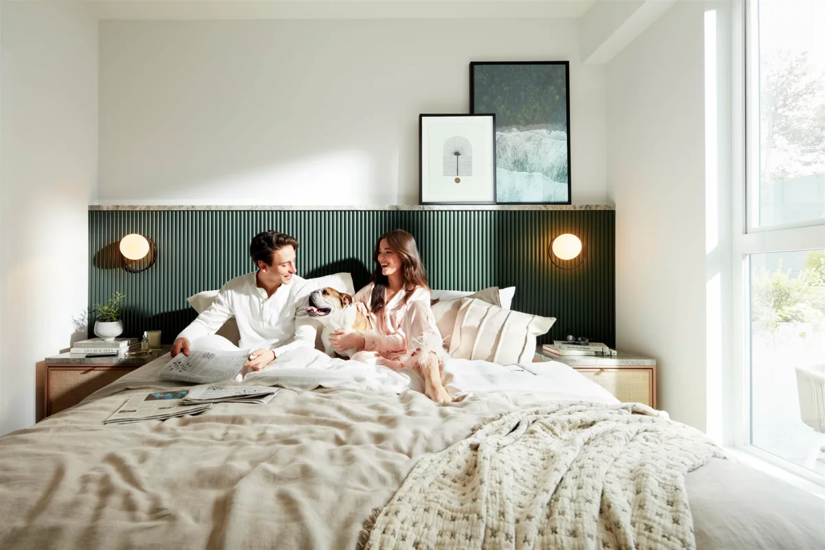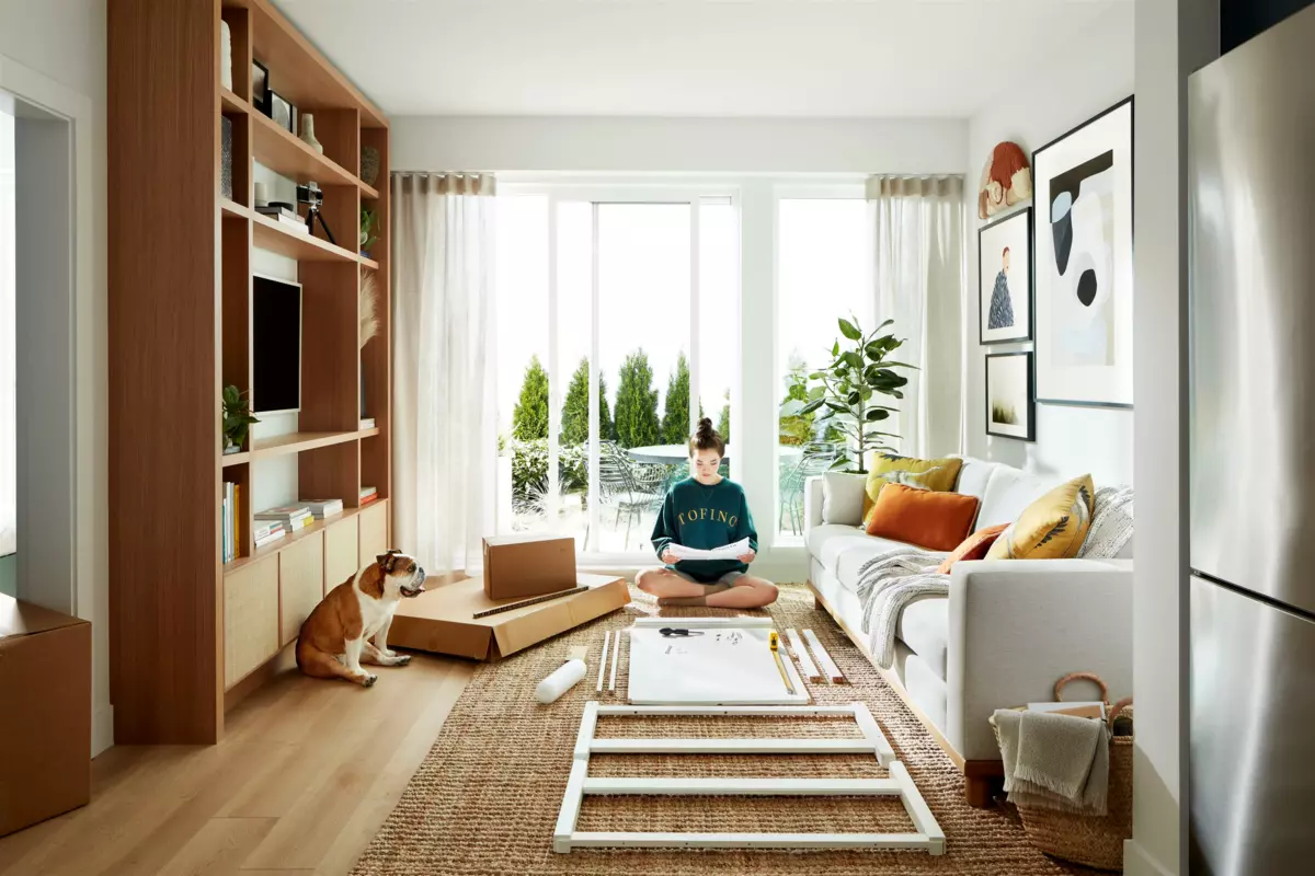 Moody Yards by Mosaic. A perfect home in the heart of Port Moody—just steps from Rocky Point Park, Moody Centre Station, and Brewers Row. Part of our Hemlock Series, the H Plan is a 2-bedroom, 2-bathroom home with 721 sq ft of interior space and a 268 sq ft private outdoor patio. The open-concept layout features a modern kitchen, dining, and living area that flows seamlessly to the large private patio. First-time buyer? Ask our team how you can save GST when owning at Moody Yards today.
