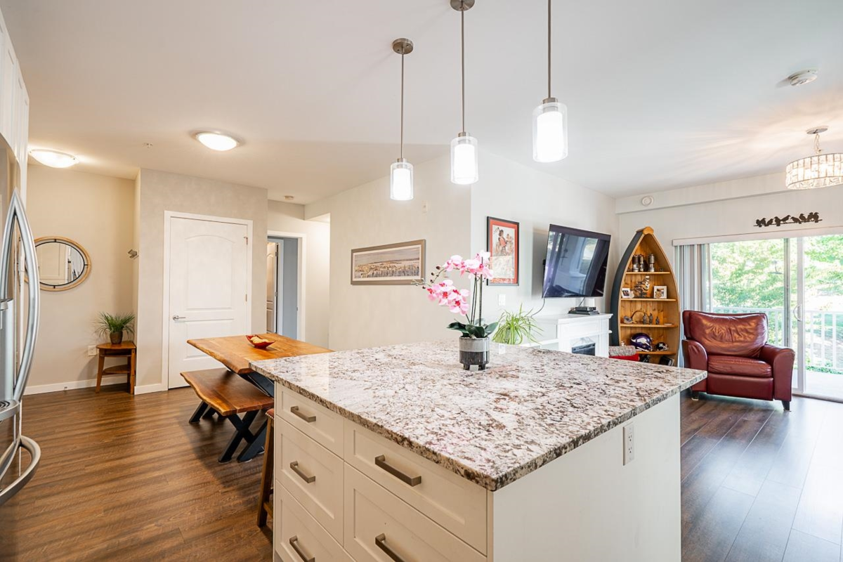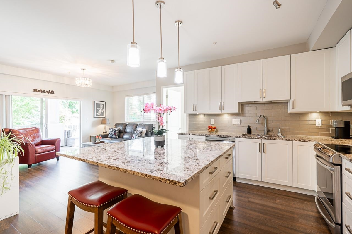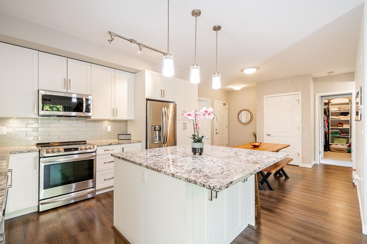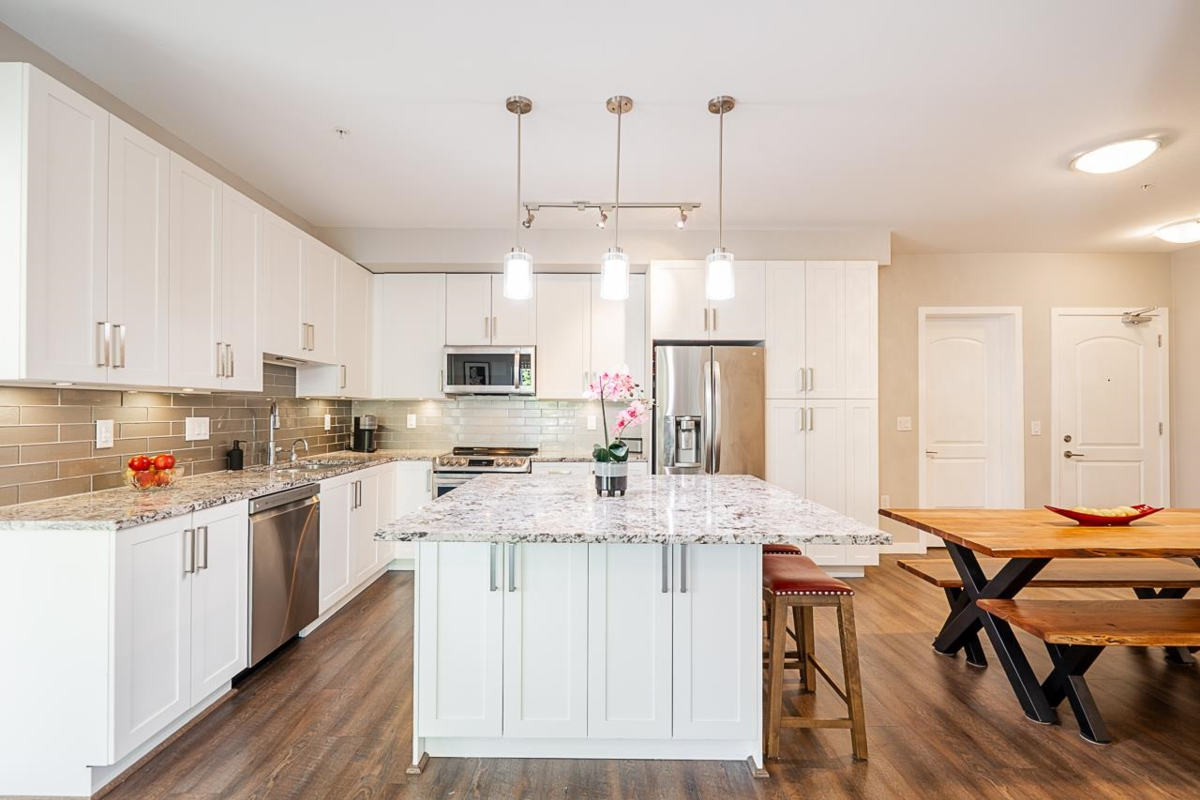 A THREE BEDROOM CONDO AT WATERSTONE??? It doesn't happen often but this gem is waiting for it's happy new owners! Recently painted & move in ready, this corner unit has luxury finishes like white shaker cabinets, full slab granite counter tops, HUGE kitchen island w loads of storage plus, wide-plank vinyl flooring, full-sized stainless steel appliances, on-demand hot water tap & a MASSIVE WRAP-AROUND patio that faces the greenbelt. Included are TWO side-by-side parking stalls with with TWO private mini garages. Enjoy exclusive access to Waterstone’s resort-style amenities: indoor pool, fitness centre, 17-seat theatre, sauna, chef’s kitchen, and more!! This home is just steps to Willowbrook Mall, shops, dining and future Skytrain—this one checks all the boxes. Come see for yourself!