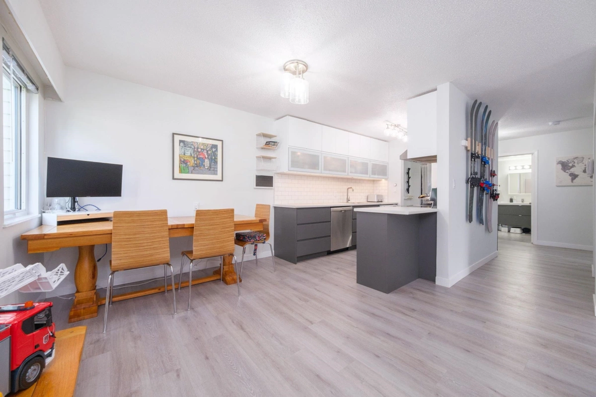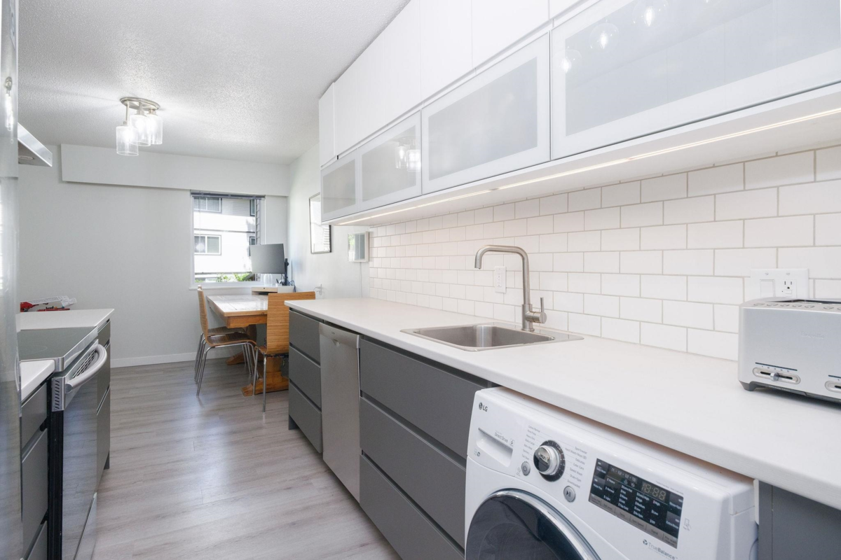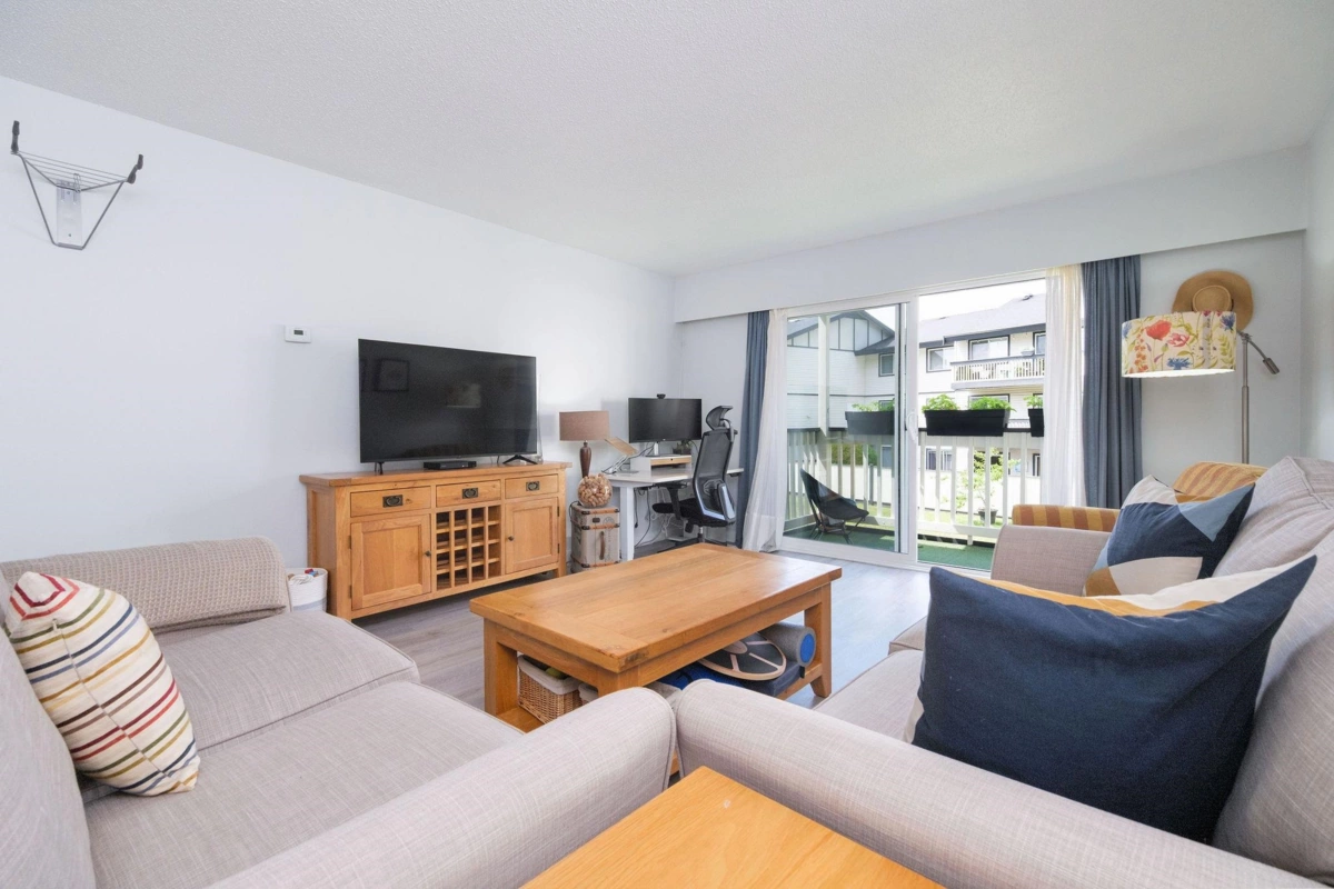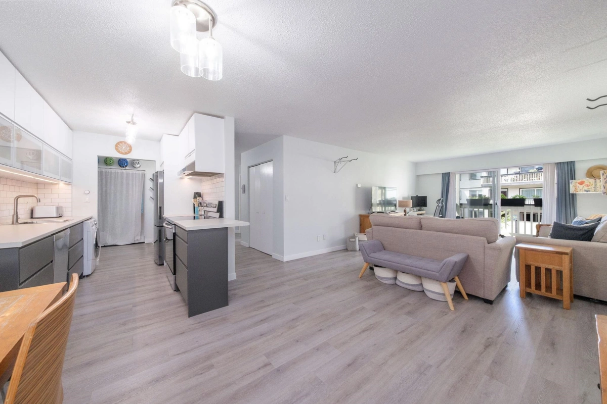 Step into over 1,040 sq.ft. of updated comfort in this 2-bedroom home designed for space and light. The open-concept layout showcases a renovated kitchen with stylish two-tone cabinetry, stainless steel appliances, and wide-plank flooring throughout. Oversized windows and a sun-soaked balcony create a warm, inviting atmosphere, while the flexible floor plan offers plenty of room to work, relax, or entertain. With generous in-suite storage and a location just steps to trails, parks, Capilano University, and quick Highway 1 access, this home is a smart choice for first-time buyers or anyone needing more space at an exceptional value.