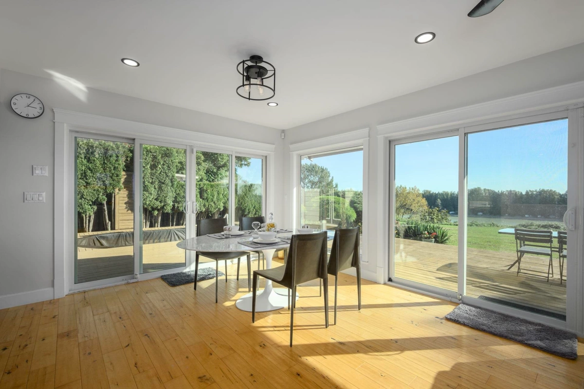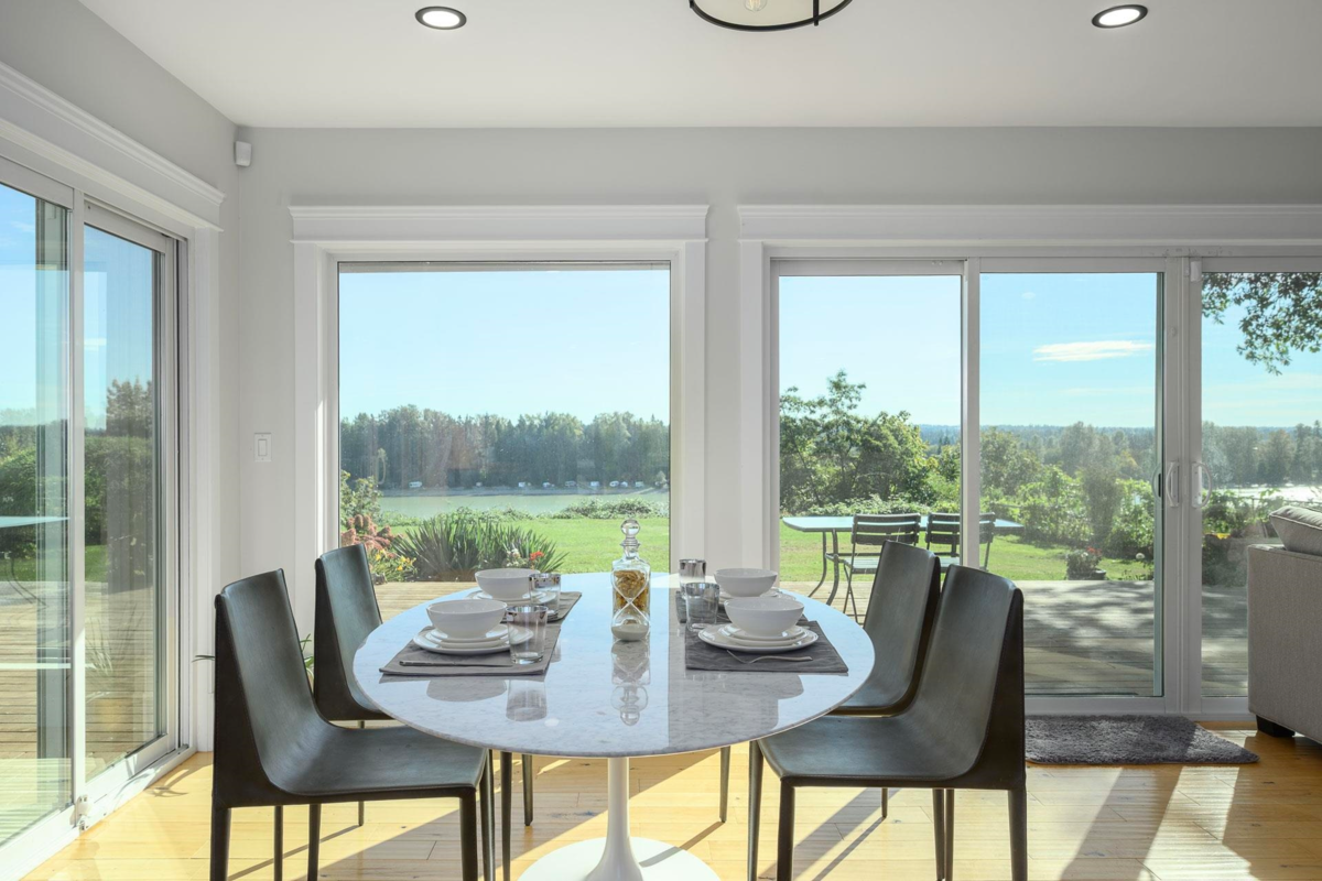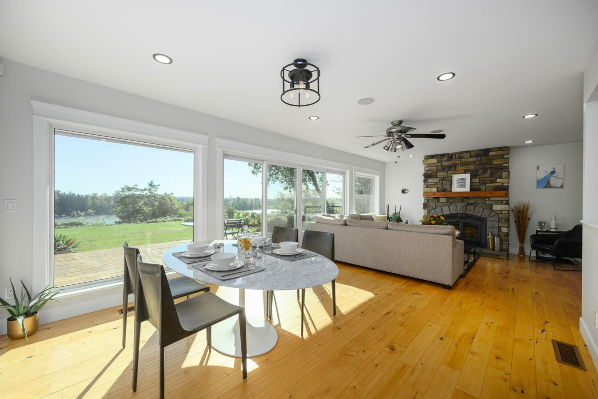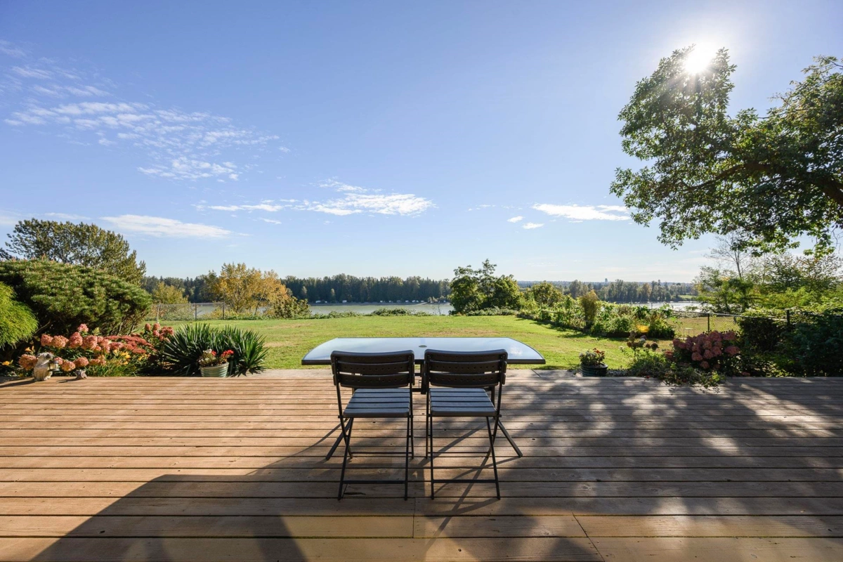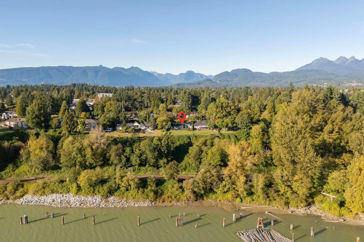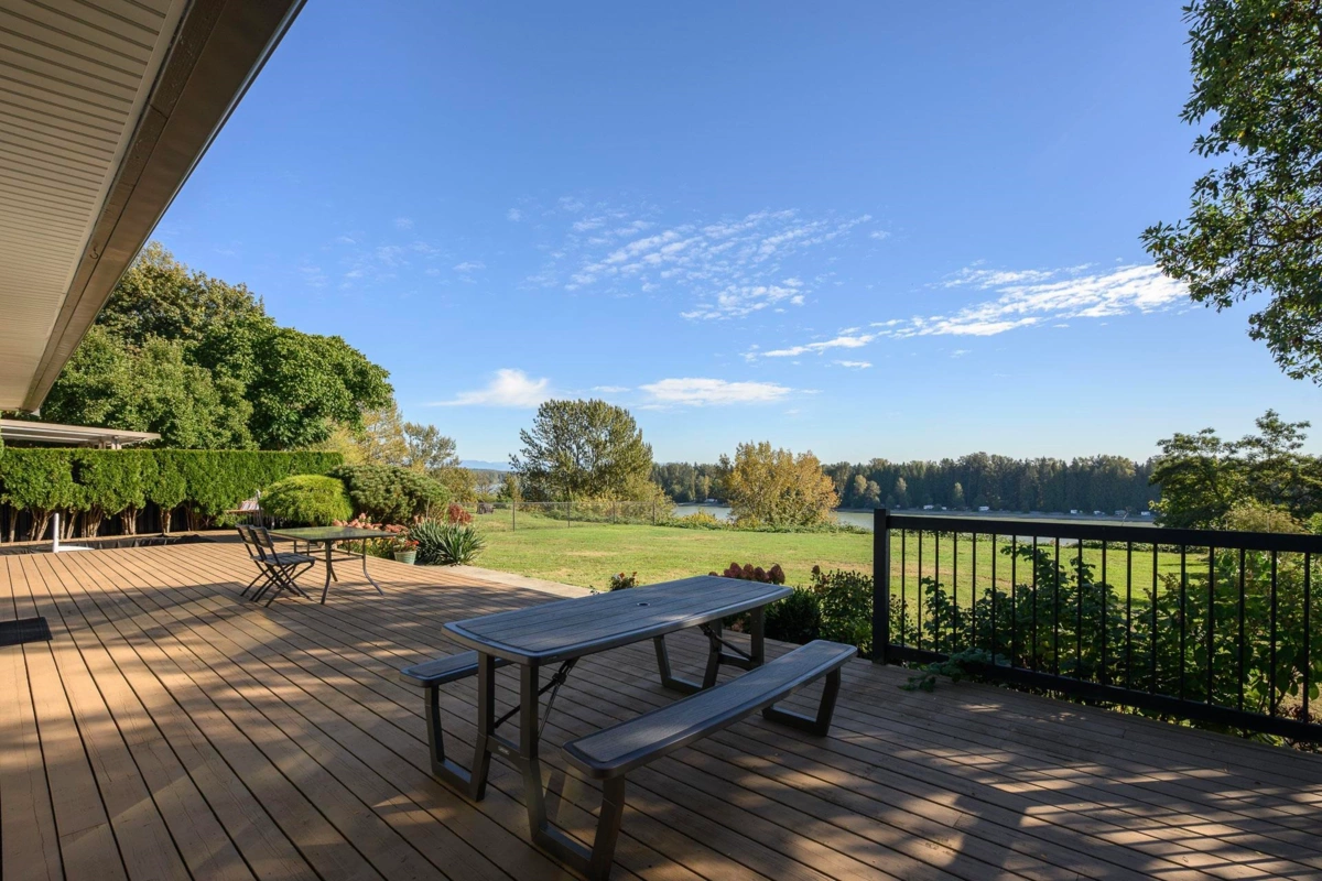 Fraser River southern-exposed waterfront in one of Maple Ridge's most exclusive neighborhoods. Bathed in natural light w/ panoramic river & mountain views from the living, dining, and primary bedroom, this 4-bedroom renovated rancher is a rare find. The open-concept kitchen & living area flow to a fully finished, suiteable basement w/ family room & separate entrance. Don't miss over 2,000 sq.ft. of deck space, & detached rec room for extra family living. All sitting on a flat 16,000+ sq.ft. lot, offering incredible potential to expand or build your dream home. BONUS walking distance to Maple Ridge Hospital, & just 10 minutes to Meadowridge School. Inground pool in place, quotes available for a new liner & equipment. Gated property, by appointment only. Drone and walk-thru video attached.
