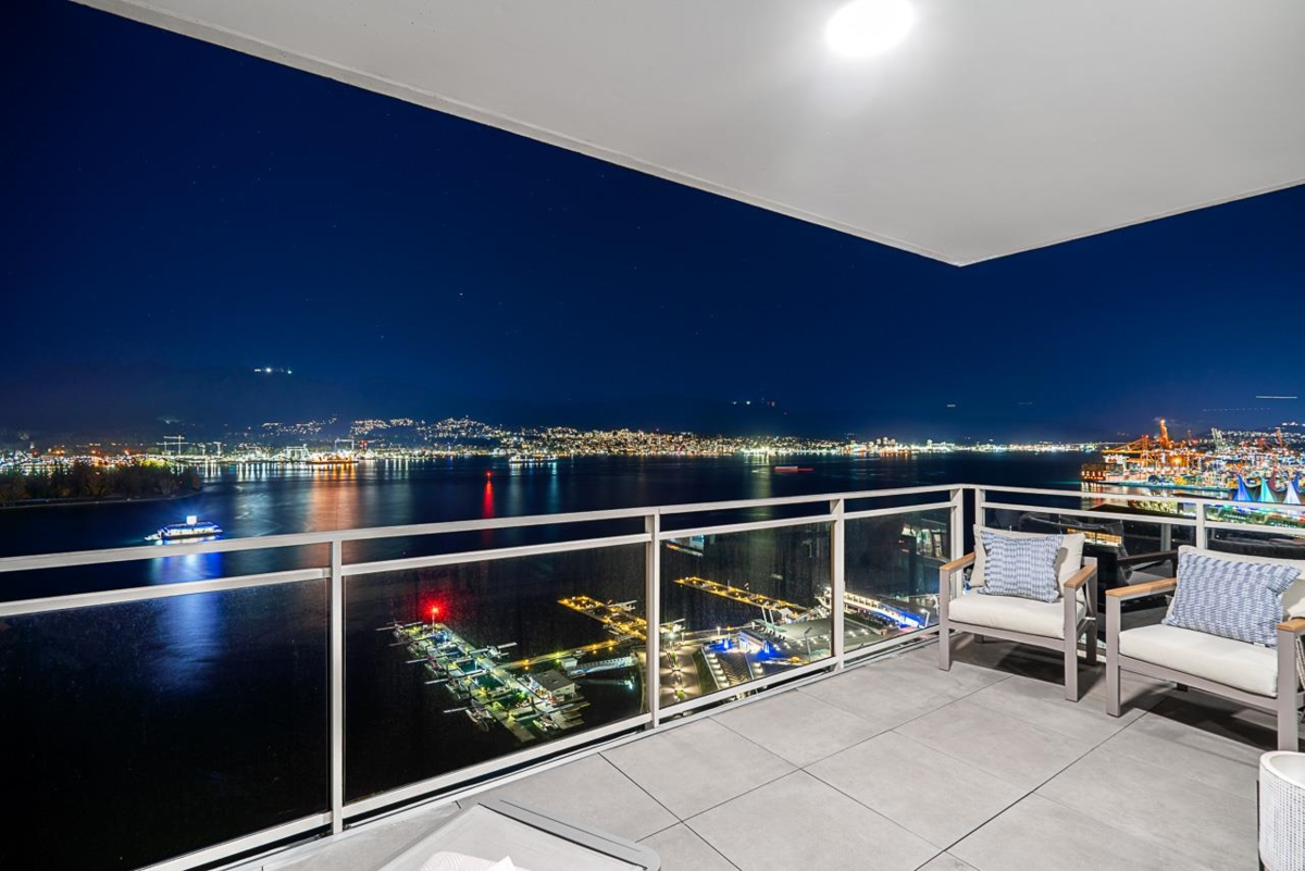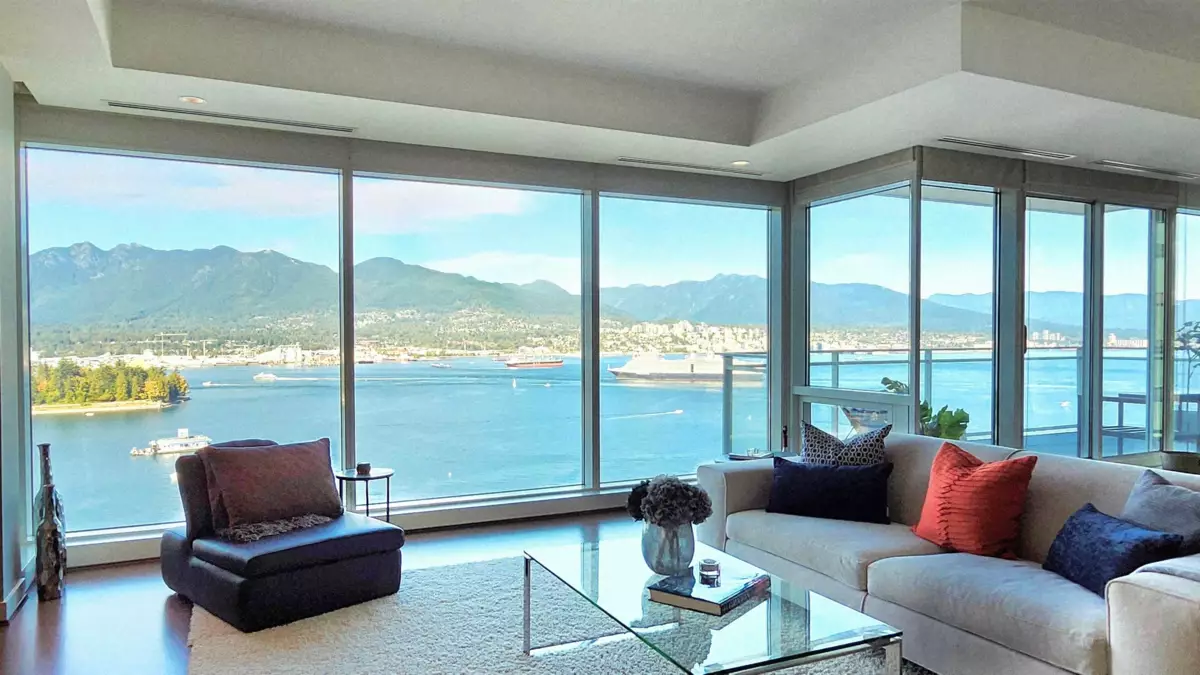 Exclusive sophisticated oceanfront living at award-winning 2 Harbor Green in Coal Harbor.With only 2 units on this floor,the spacious&bright home is at the perfect height;high enough to offer far reaching stunning 180°views, incl Stanley Park,Lions Gate Bridge&2nd Narrows Bridge;yet still has a very intimate feel with the water and greenery.Enjoy sunrises and sunsets from the large private terrace and tranquil water vistas from every main room.Interiors offer designer custom millwork and upgrades,and is in immaculate move-in-ready condition.Rare features:a private 2 car garage with two EV chargers, an extra large parking stall,and 2 concrete storage rooms(~260sq.ft., perfect for downsizers).World class amenities: hotel-style lobby,24hr concierge,indoor pool,gym,guest room,virtual golf etc.