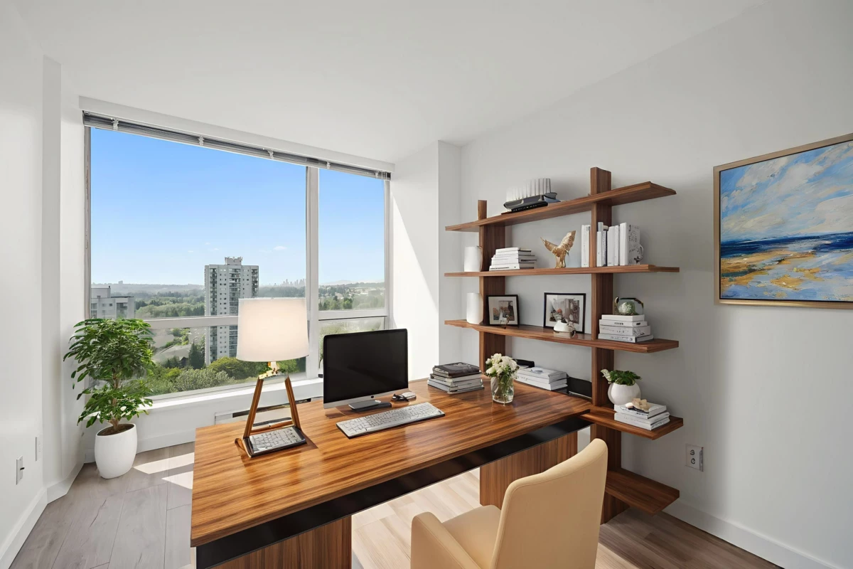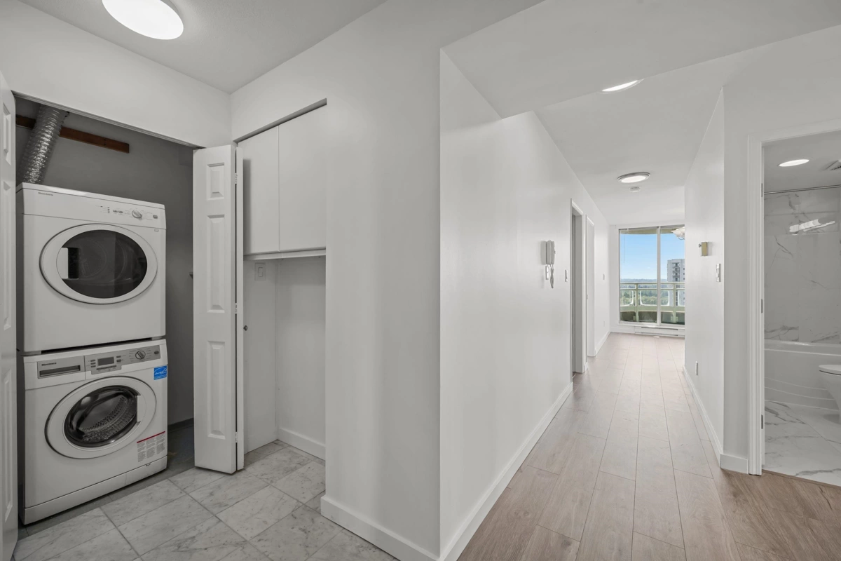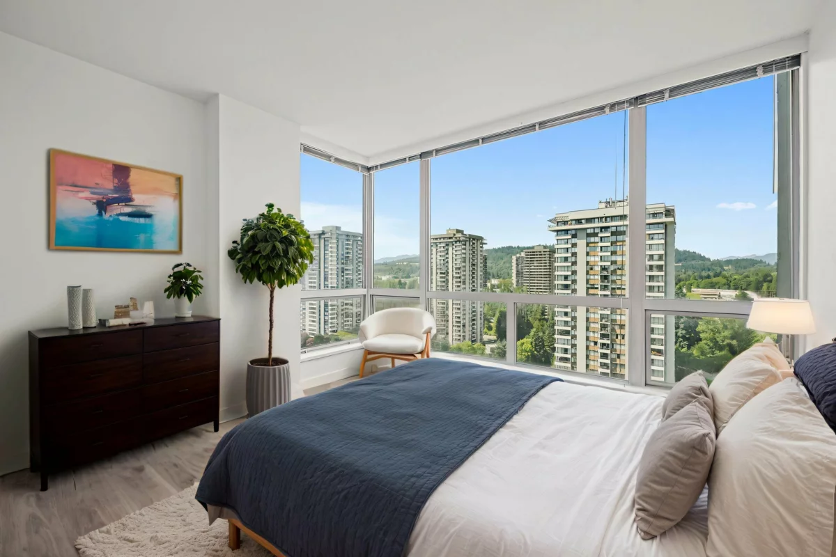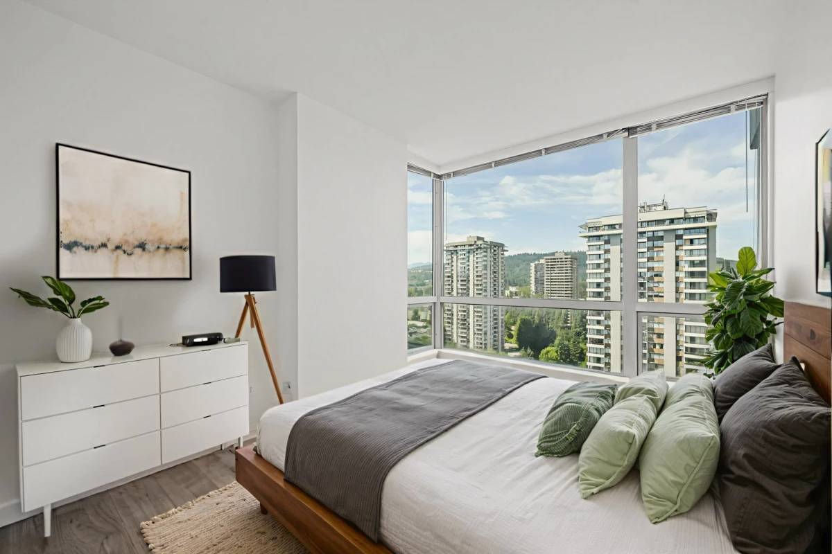 *City Views & Prime Convenience: Renovated 3-Bedroom in North Burnaby* Enjoy comfort, space, and a vibrant location in this updated 3-bedroom, 2-bathroom corner unit in the heart of North Burnaby. Spanning 1,215 sqft, this Northwest-facing home captures stunning city and park views through expansive floor-to-ceiling windows, creating a bright and inviting atmosphere. The functional layout features a large living room, separate dining area, three generously sized bedrooms, and two full bathrooms—ideal for families or those seeking extra space. Thoughtful updates include new wide-plank laminate flooring, upgraded bathrooms, and newer appliances. Located just steps from Lougheed SkyTrain, Lougheed Mall, Park, cafes, and an unbeatable location. || *Virtually Staged* ||
