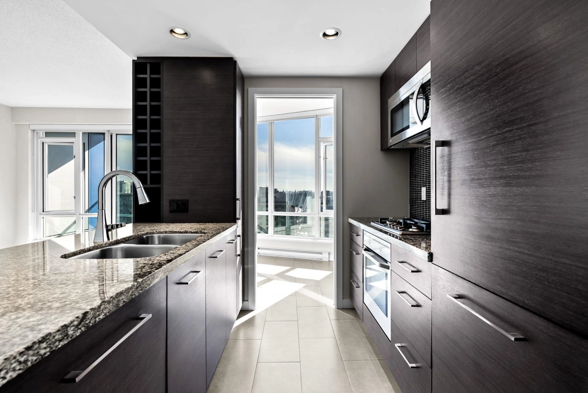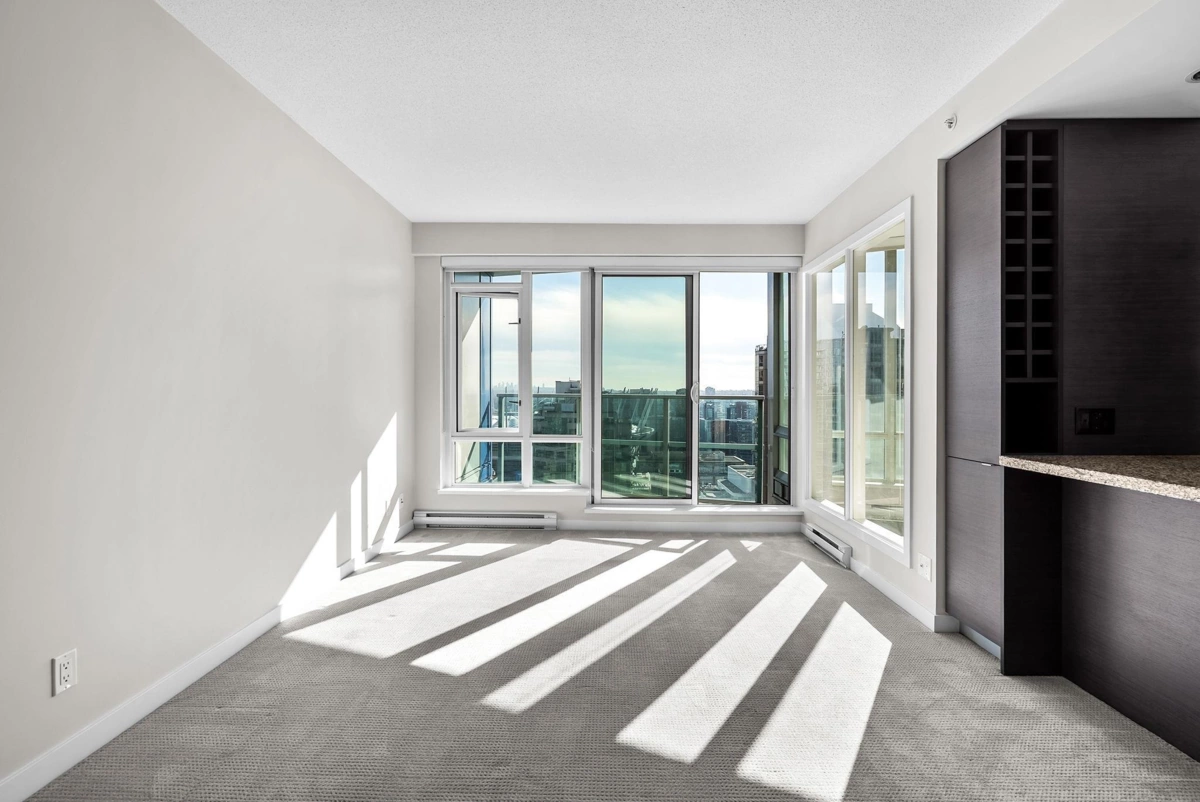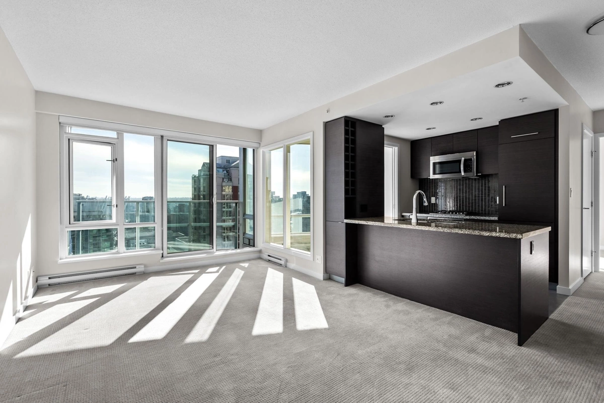 'Atelier' on Robson - one of DT Van's most convenient & desirably located buildings. This 1bed+solarium+den home offers an open concept layout w/ floor-to-ceiling windows, making for a commodious space w/ gorgeous views of DT, BC Place, Metrotown & through to Mount Baker. Offering a beautiful kitchen with granite countertops, s/s appliances with gas cooktop, dark cabinetry, a spacious breakfast bar and built-in wine rack. This well-run building offers great amenities such as a bike room, meeting room, party room, 24-hour concierge, fitness centre w/ yoga and spin studio, steam room and tranquil rooftop garden. One parking stall is included and just steps away from Robson Street eats, Rogers Arena, BC Place, Vancouver Library, IGA & more! Opens: Sat, Nov 29th & Sun, Nov 30th from 2-4pm.