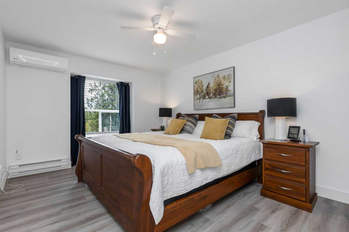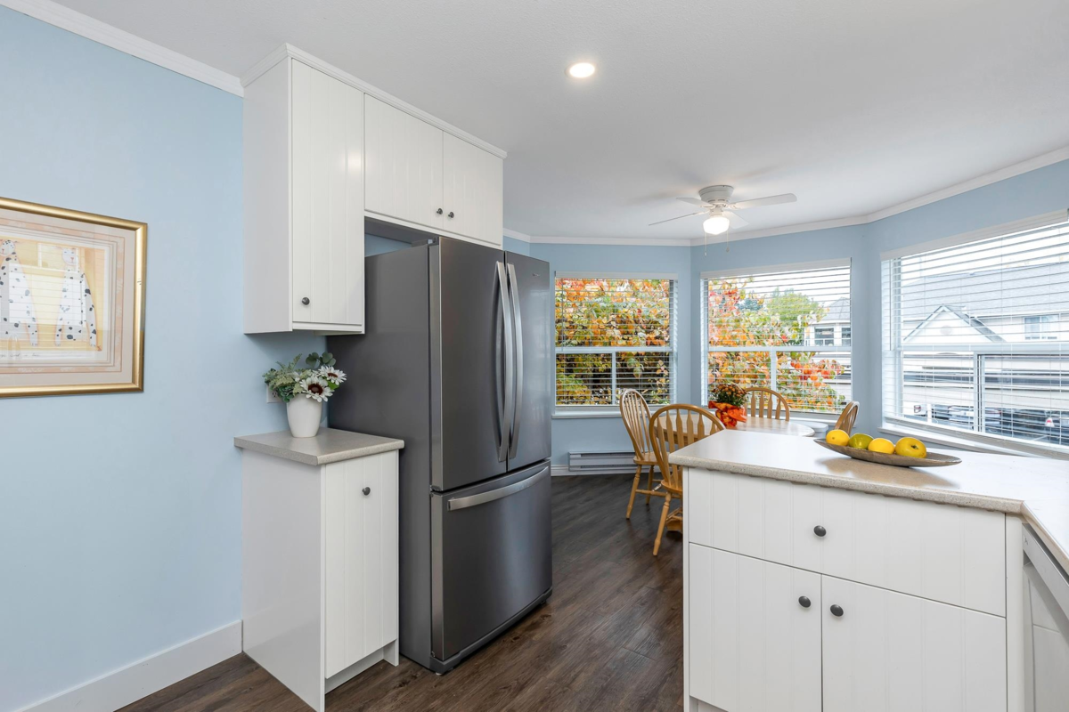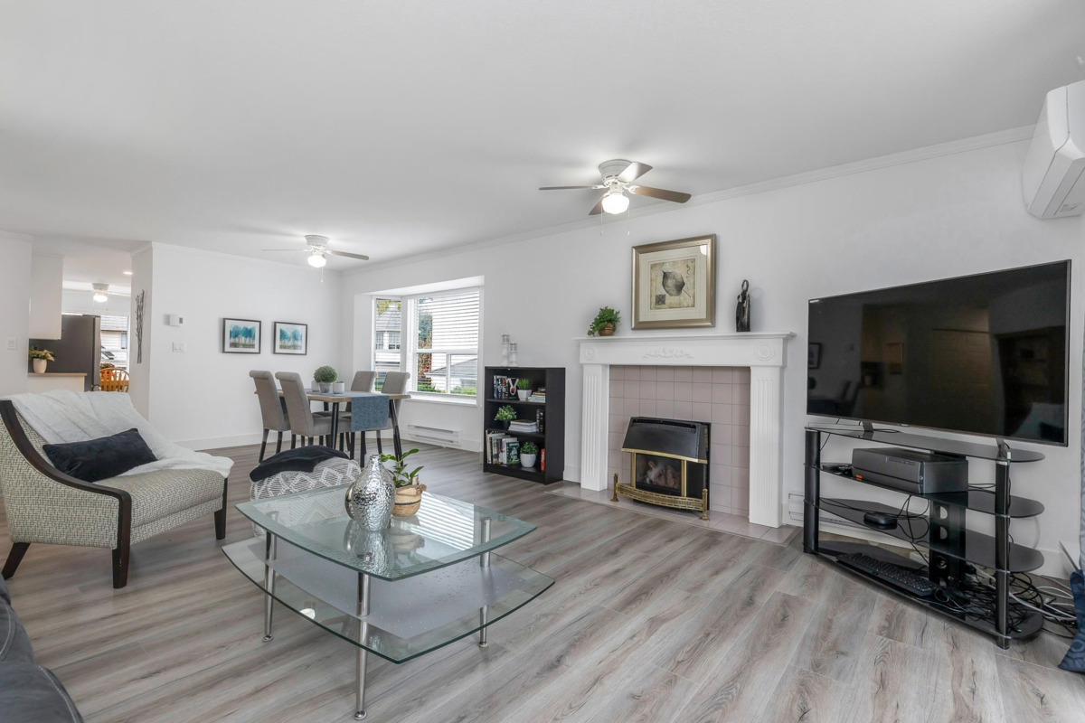 PRICE IMPROVEMENT! This spacious 55+ townhome is in the rental-free complex of Forest Edge. With BRAND NEW LAMINATE throughout, this 2 bed, 2 bath home is ideal for buyers looking for a house size with a large living and dining room to fit all your furniture! The primary bedroom fits a king and the second bedroom fits a queen! Recently updated in the last 2/3 years. HEAT PUMP for heat and AC, complete with 2 mini splits. Gas fire and electric baseboards with programable digital thermostats for perfect comfort. S/S kitchen appliances, washer and dryer. Complete with 2 dedicated parking spots, one covered, and pet friendly for 1 cat/dog, both a rarity in Abbotsford. Large east facing balcony looks over the forest of Old Riverside Park. On a bus route, and short distance to amenities.