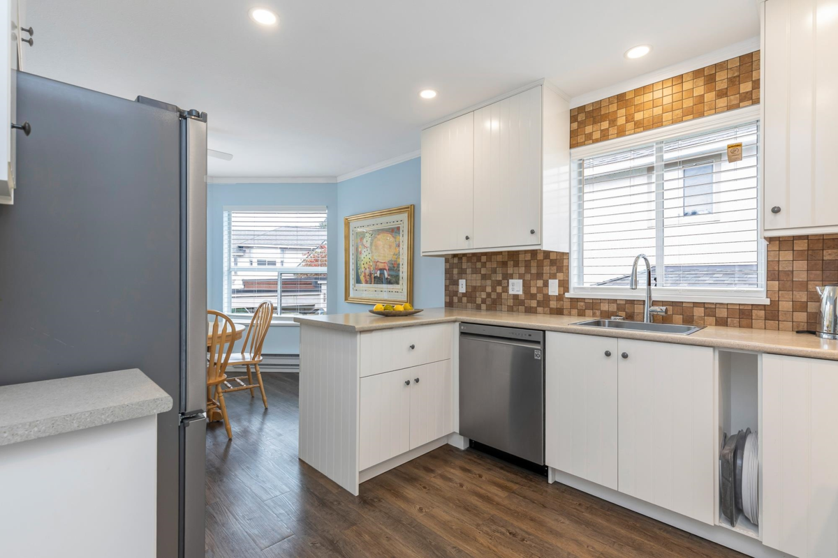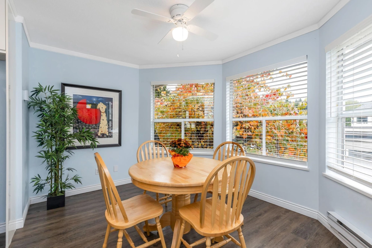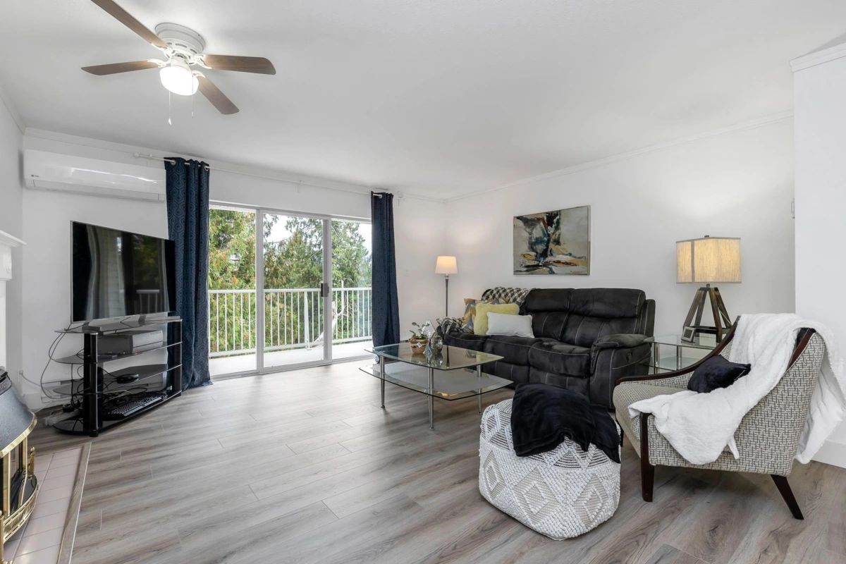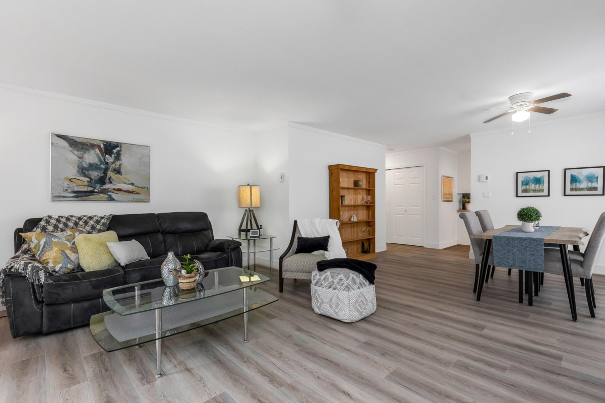 PRICE IMPROVEMENT! This spacious 55+ townhome is in the rental-free complex of Forest Edge. With BRAND NEW LAMINATE throughout, this 2 bed, 2 bath home is ideal for buyers looking for a house size with a large living and dining room to fit all your furniture! The primary bedroom fits a king and the second bedroom fits a queen! Recently updated in the last 2/3 years. HEAT PUMP for heat and AC, complete with 2 mini splits. Gas fire and electric baseboards with programable digital thermostats for perfect comfort. S/S kitchen appliances, washer and dryer. Complete with 2 dedicated parking spots, one covered, and pet friendly for 1 cat/dog, both a rarity in Abbotsford. Large east facing balcony looks over the forest of Old Riverside Park. On a bus route, and short distance to amenities.