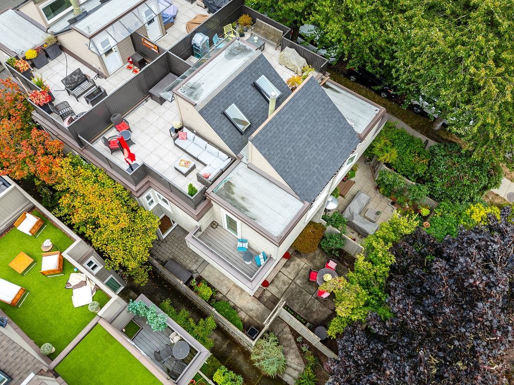 This well maintained three bedroom, two bathroom townhome is located in a boutique four unit development in the heart of Kitsilano. Featuring vaulted ceilings, skylights, and windows on two sides, the home is bright and airy and lives like a 1/2 duplex. You will love the location, situated only steps to all the shops, restaurants, groceries and conveniences of West 4th Avenue, only a short walk to Kits Beach and Connaught Park and just a quick commute downtown by bus, bike or car. Enjoy the summer sunshine on any of the three outdoor areas, including a south facing wrap around patio with fenced yard, a balcony off the primary bedroom, and a private 308 sqft rooftop deck. Massive crawl space for storage and well maintained building with a proactive strata.